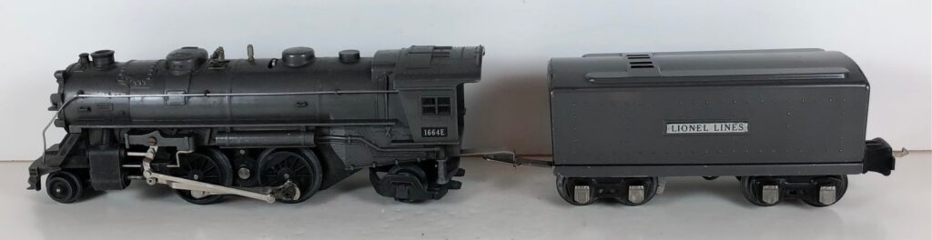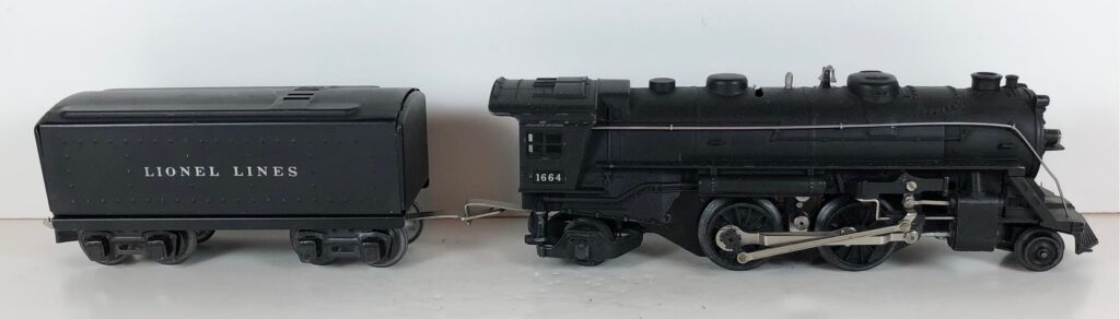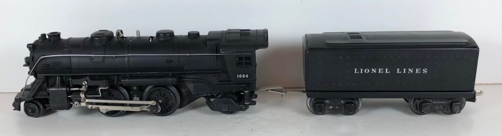 4. No. 1664 / 2666T/W 2-4-2 Steam Locomotive in black with nickel trim and rubber-stamped number “1664” on the sides of the cab (1942). The E-Unit lever is located to the front of the boiler. The No. 2666T/W Tender is black with “Lionel Lines” on the sides of the tender. The tender has black journals and a late style operating box coupler.