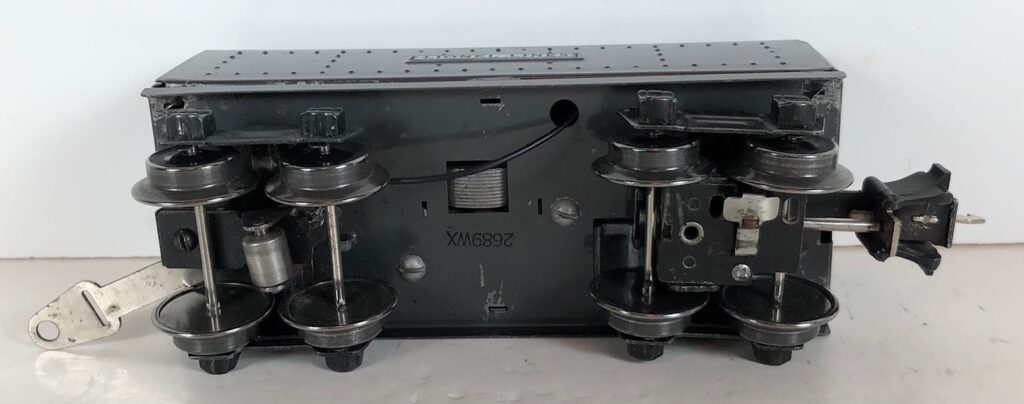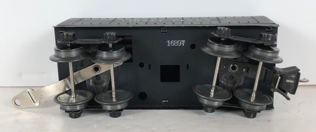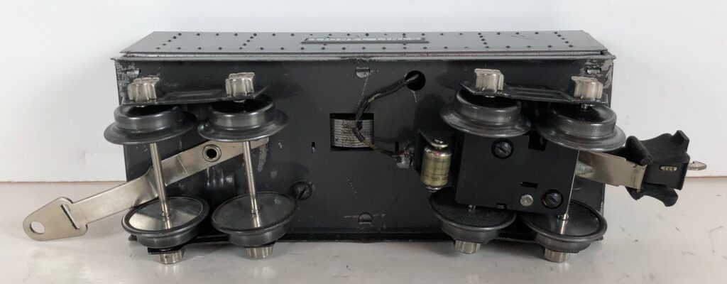The No. 1664 Locomotive has nickel trim, wire handrails and a “027” Gauge four drive wheel motor. The locomotive has an operating headlight and a remotely operated reverse with a lever on the top of the boiler that engages or disengages the reversing unit. Early No. 1664 Locomotives have the E-Unit lever located in the middle of the boiler. Late locomotives have the E-Unit lever located in the front of the boiler. The number is either on an aluminum plate or rubber-stamped below the cab windows.