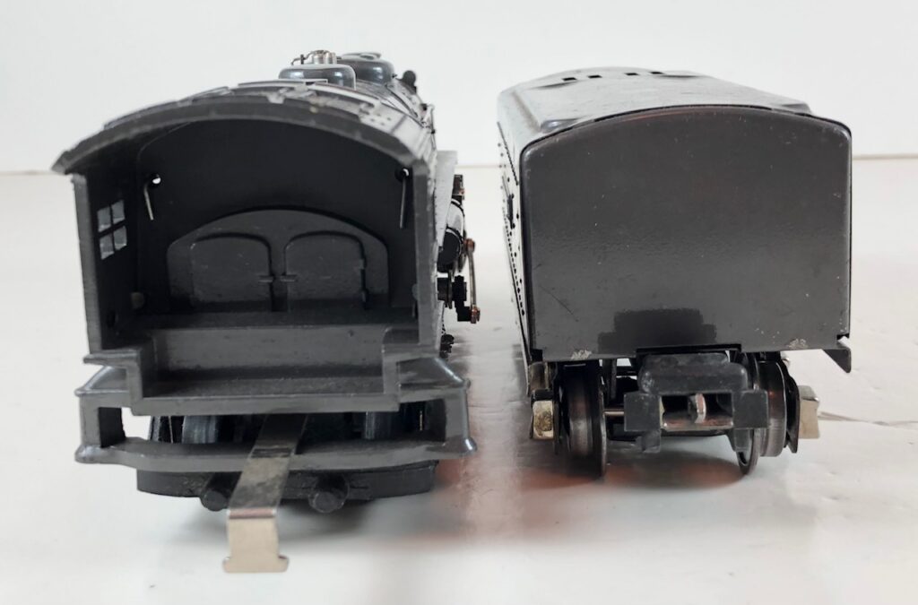2. No. 229 / 2689T 2-4-2 Steam Locomotive in gunmetal gray with nickel trim and aluminum “229” number plates on the sides of the cab (1939-1940). The E-Unit lever is located in the middle of the boiler. The No. 2689T Tender is gunmetal gray with nickel plates on the sides of the tender. The tender has nickel journals and an early style operating box coupler.
