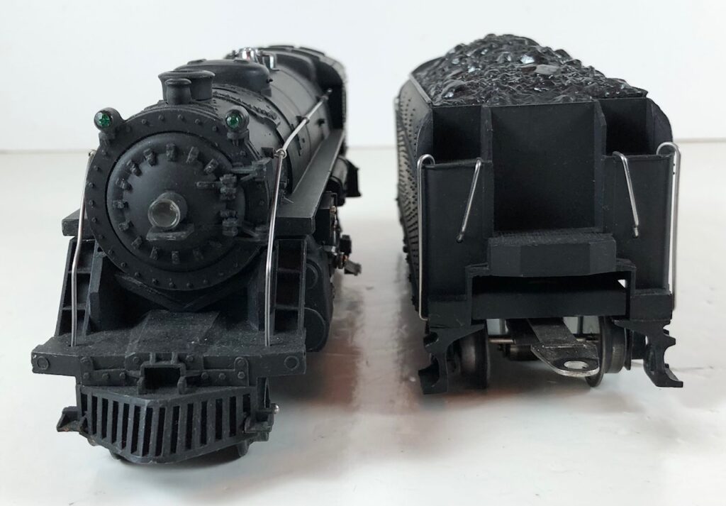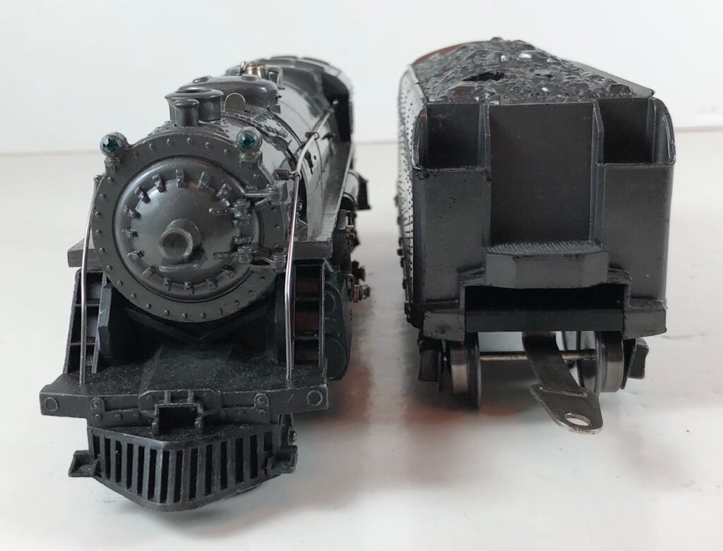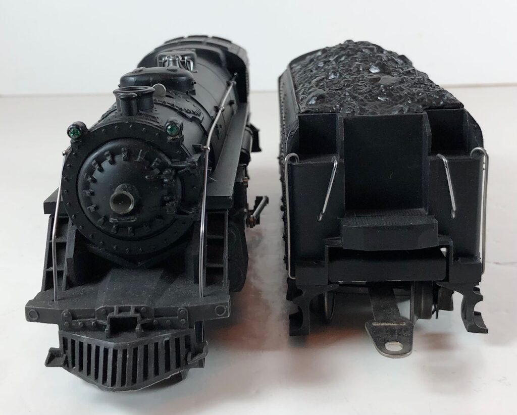 1. No. 224E / 2689W 2-6-2 Steam Locomotive in gunmetal gray with nickel trim and aluminum “224E” number plates on the sides of the cab (1938). The No. 2689W Tender is gunmetal gray with nickel plates on the sides of the tender. The tender has nickel journals and an early style operating box coupler.