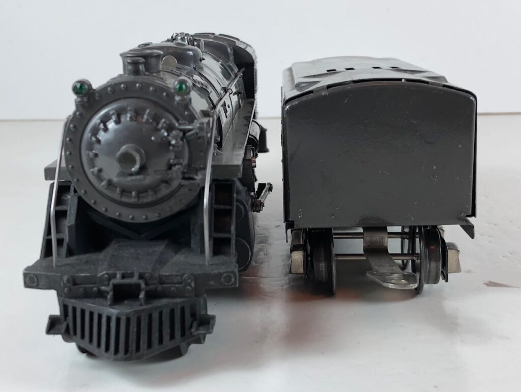 2. No. 224E / 2224W 2-6-2 Steam Locomotive in gunmetal gray with nickel trim and aluminum “224E” number plates on the sides of the cab (1939). The No. 2224W Tender is gunmetal gray with “Lionel Lines” stamped on the sides of the tender. The tender has black journals and an early style operating box coupler.