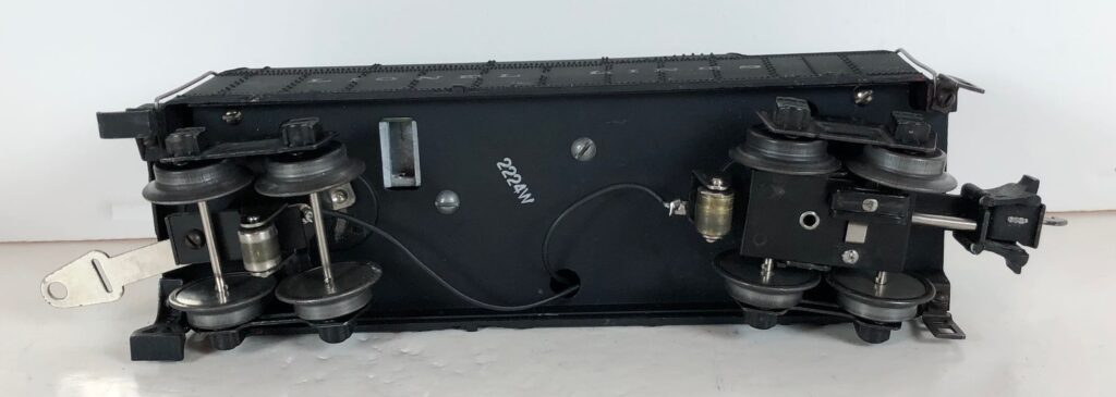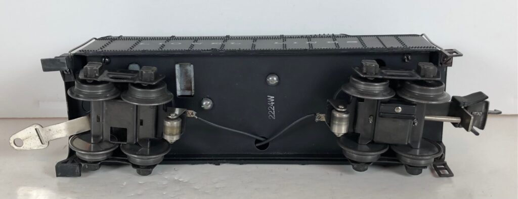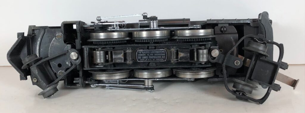 The No. 224 Locomotive has nickel trim, wire handrails and an “O” Gauge six drive wheel motor with Baldwin Disc drive wheels. The locomotive has an operating headlight and a remotely operated reverse with a lever on the top of the boiler that engages or disengages the reversing unit. The number is on an aluminum plate below the cab windows.