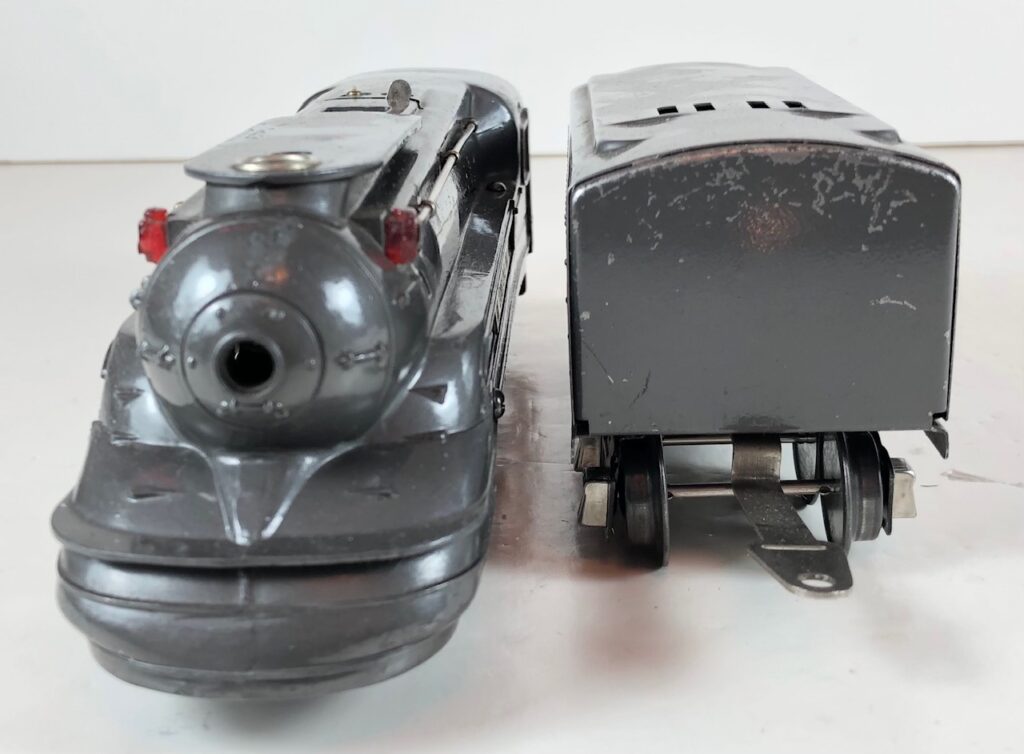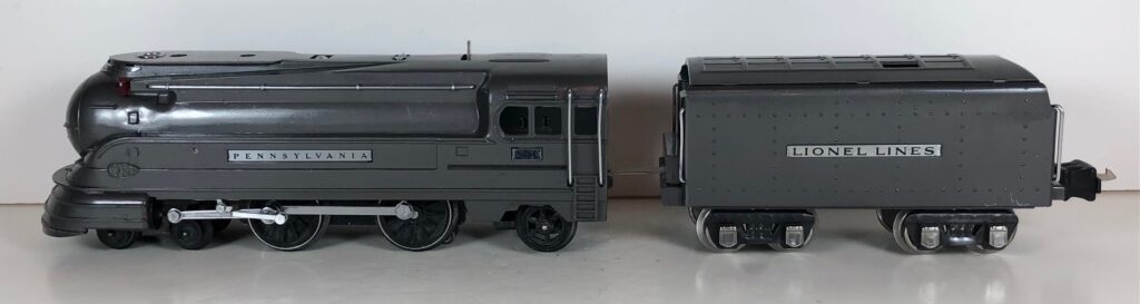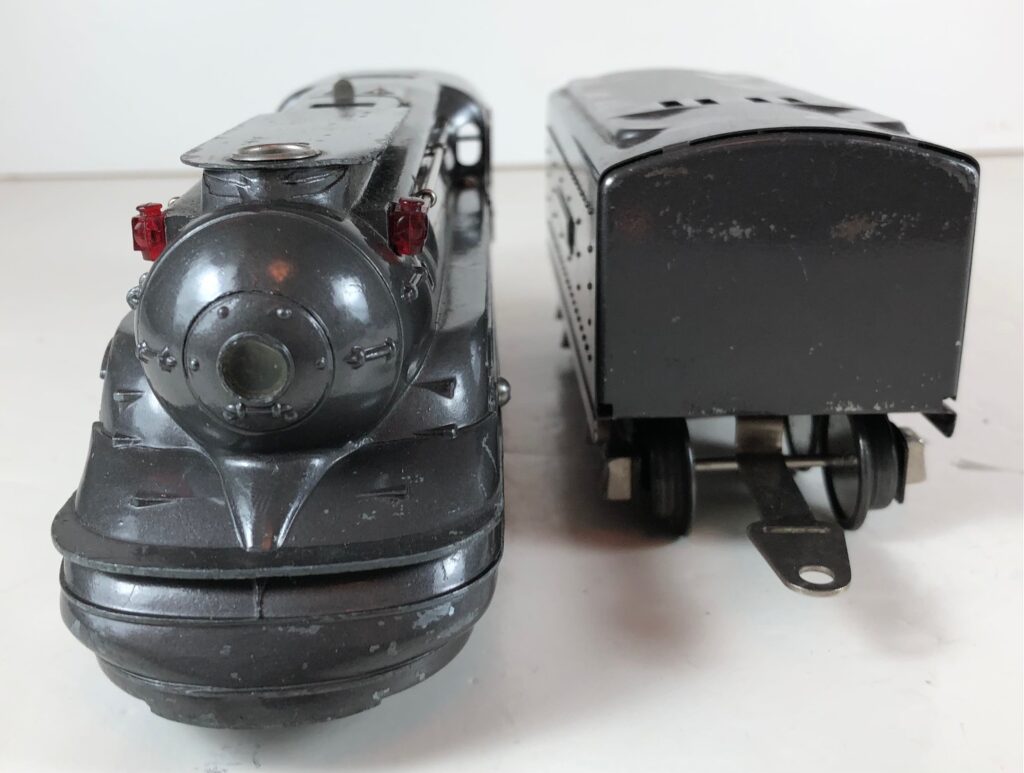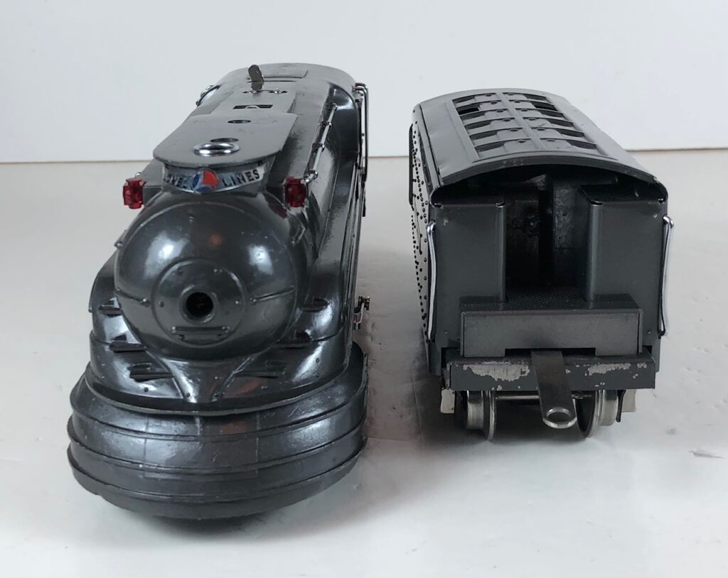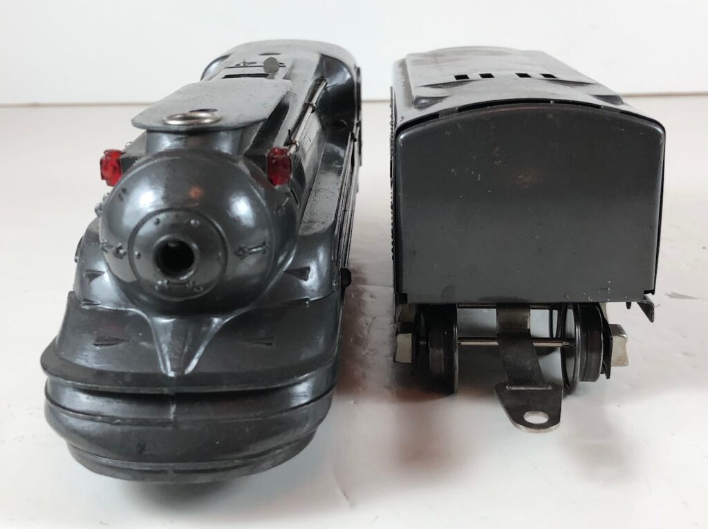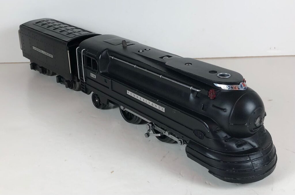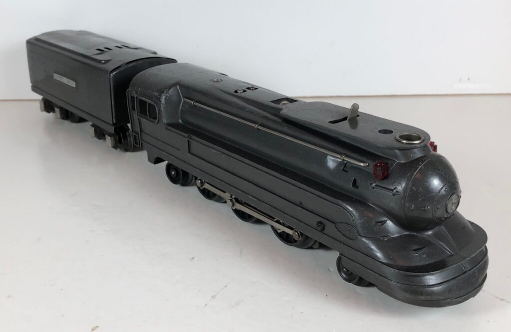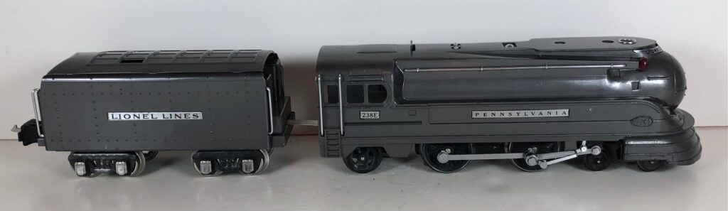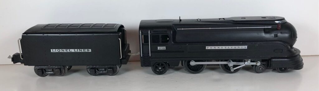 The Lionel No. 238E 4-4-2 “Pennsylvania Torpedo” Steam Locomotive was introduced in 1936 and was cataloged from 1936 through 1938. The locomotive was included as a component of two passenger and two freight cataloged sets during this period. The locomotive was also included as a component of one passenger and two freight uncataloged sets in 1939 and 1940. The locomotive was based on the streamlined K-4 steam locomotive design by Raymond Loewy for the Pennsylvania Railroad. The No. 238E Steam Locomotive utilized a one piece diecast body.