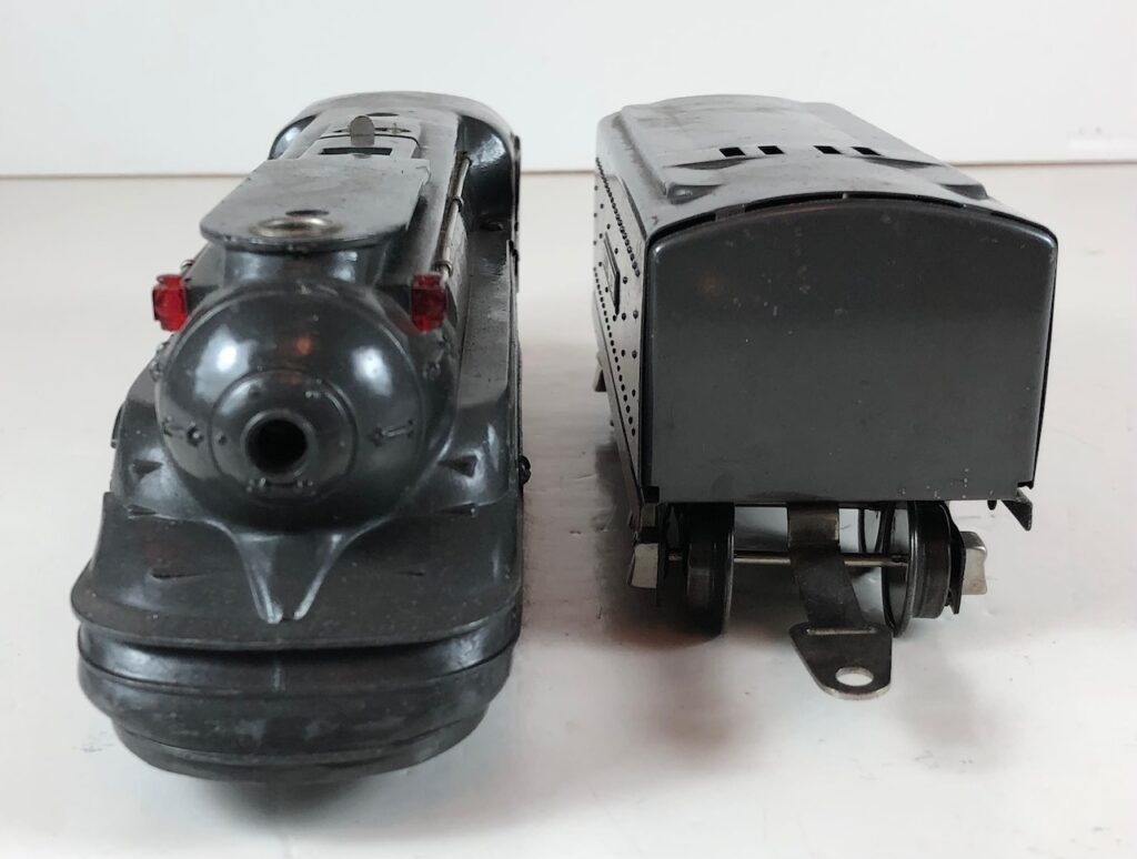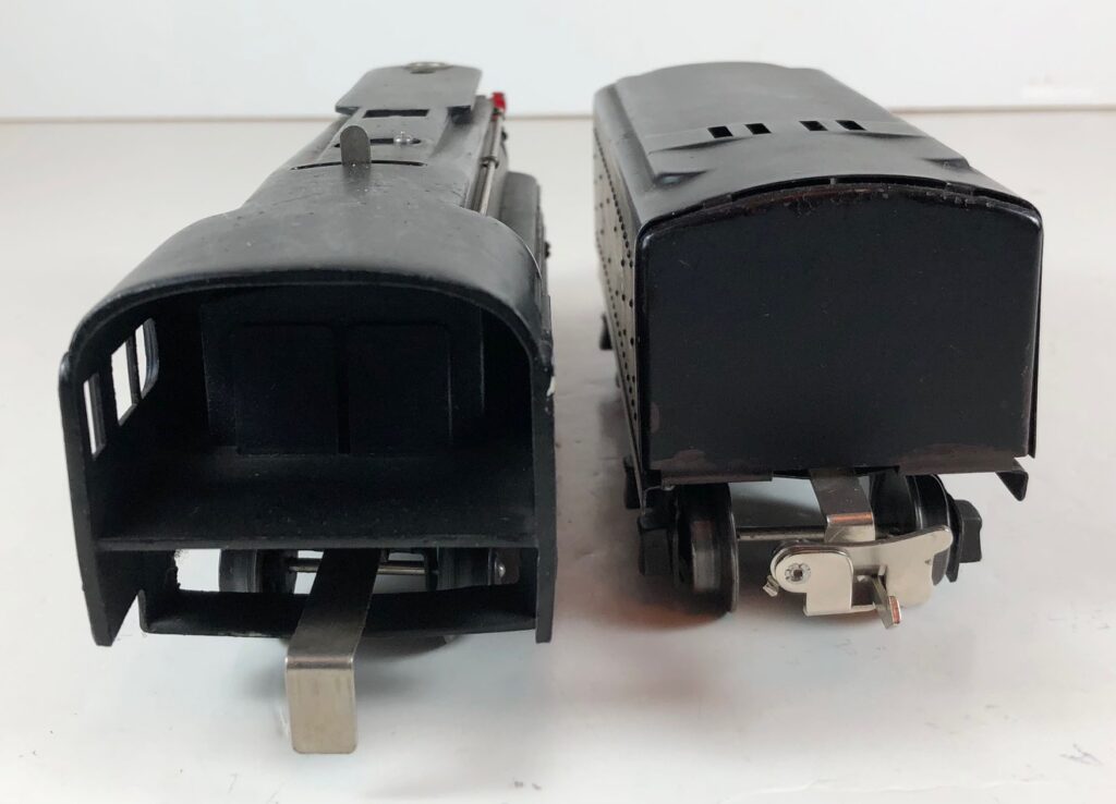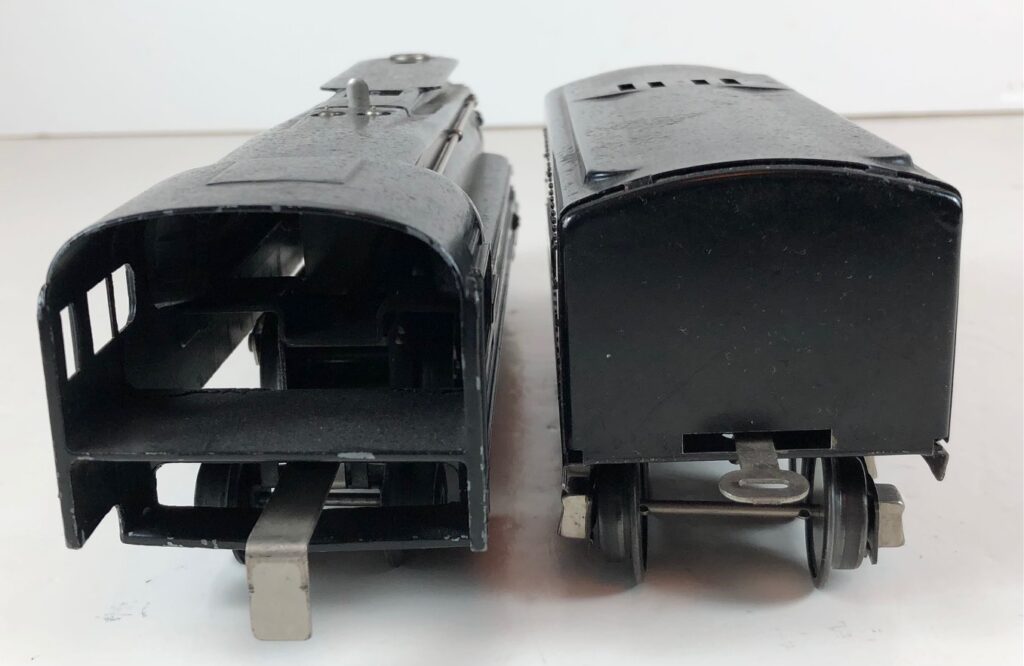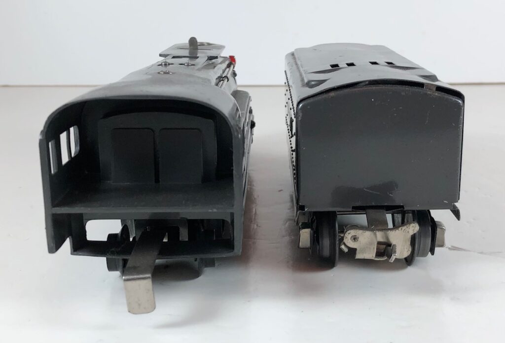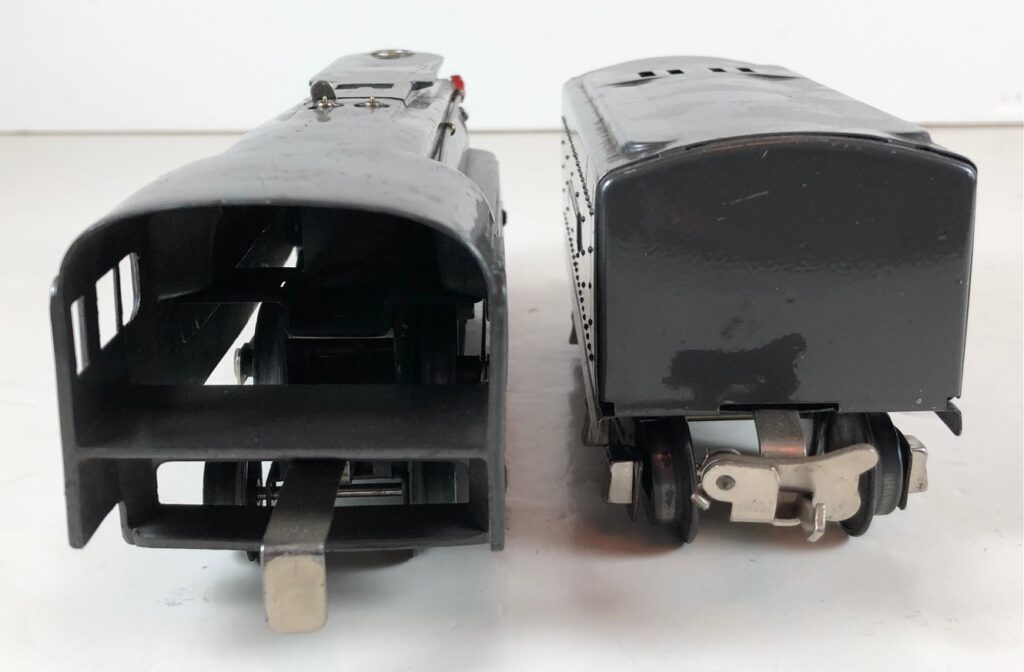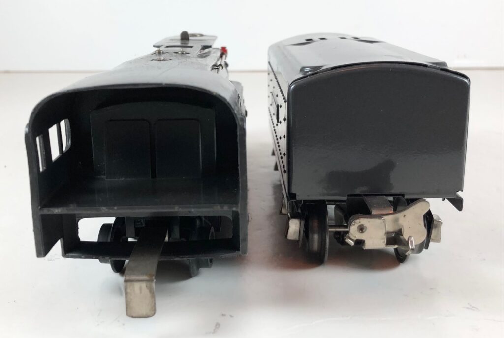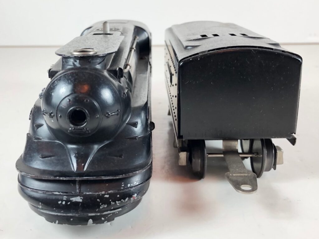 In 1936-1938, the No. 238E Steam Locomotive was issued in gunmetal gray and was paired with either a No. 265W, No. 2265W or No. 2225W Tender in gunmetal. In 1939 -1940, The No. 238E Locomotive was issued in black and was paired with either a No. 265T, No. 2225T or No. 2265W Tender in black. These tenders have a sheet metal “waffle top” body with nickel trim and aluminum “Lionel Lines” plates on the sides of the tender. The tenders have an early style manual or operating box coupler and nickel or black journals. The No. 238E / 2265T/W Steam engine and tender combined measure 19-inches in total length.