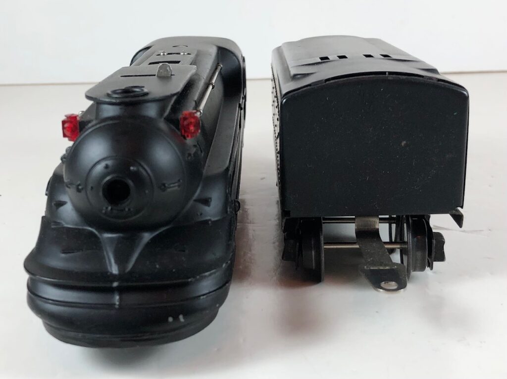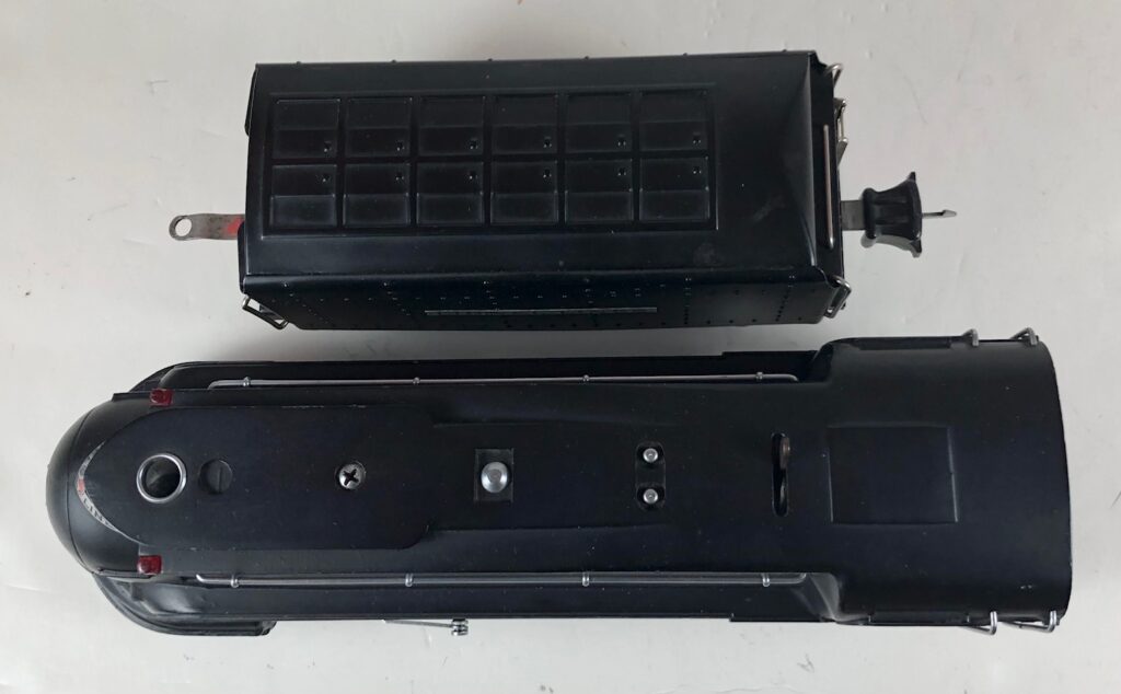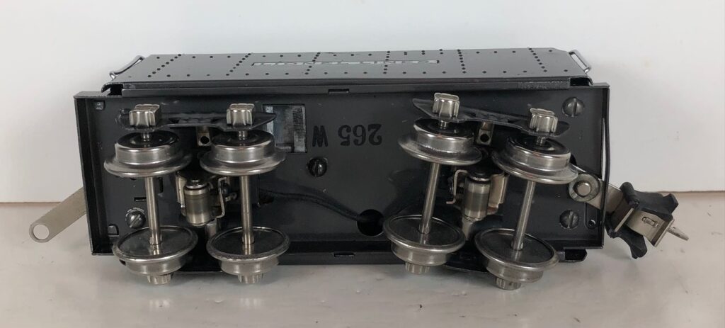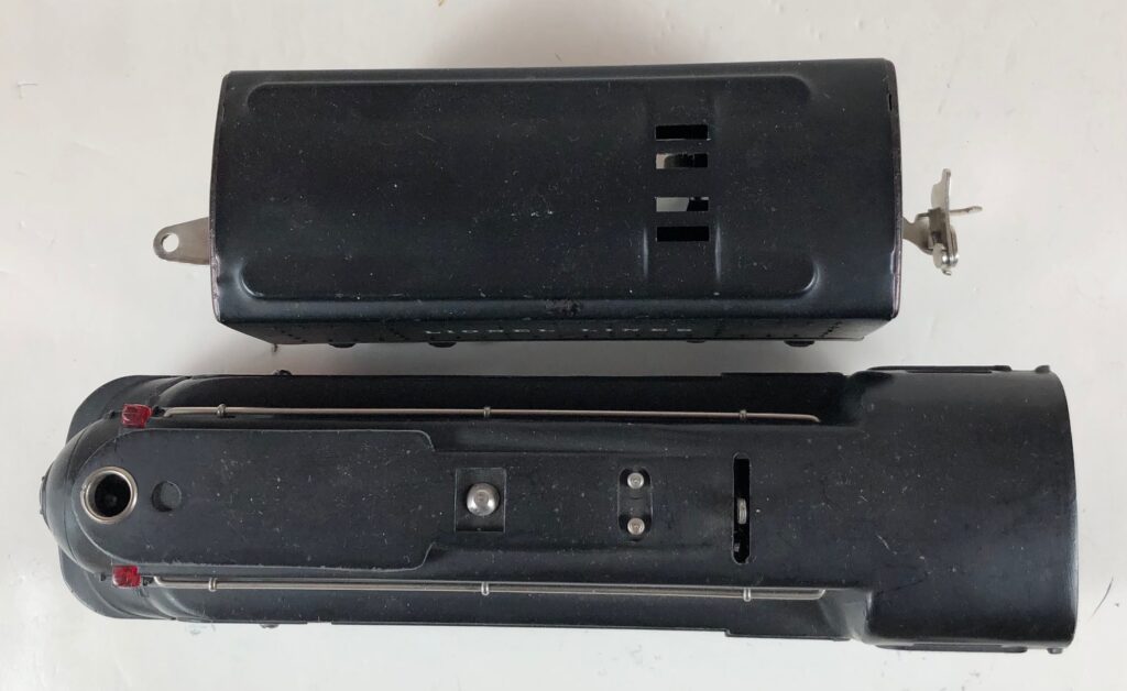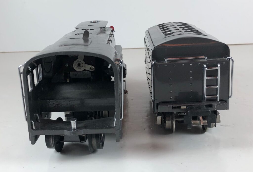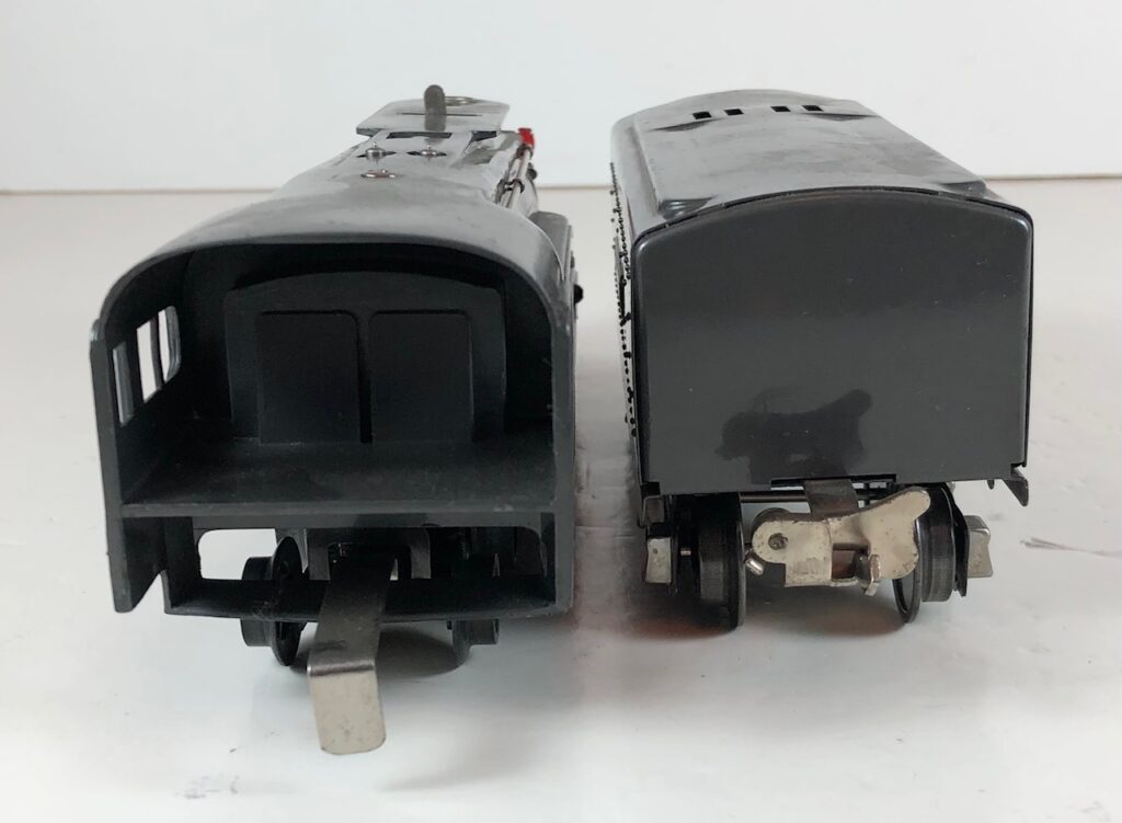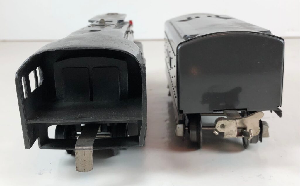 In 1936-1938, the No. 238E Steam Locomotive was issued in gunmetal gray and was paired with either a No. 265W, No. 2265W or No. 2225W Tender in gunmetal. In 1939 -1940, The No. 238E Locomotive was issued in black and was paired with either a No. 265T, No. 2225T or No. 2265W Tender in black. These tenders have a sheet metal “waffle top” body with nickel trim and aluminum “Lionel Lines” plates on the sides of the tender. The tenders have an early style manual or operating box coupler and nickel or black journals. The No. 238E / 2265T/W Steam engine and tender combined measure 19-inches in total length.