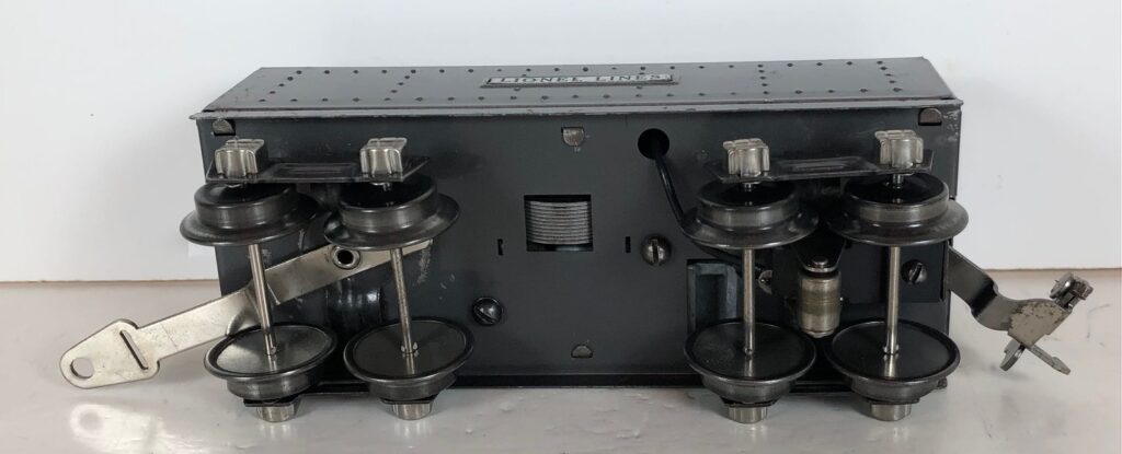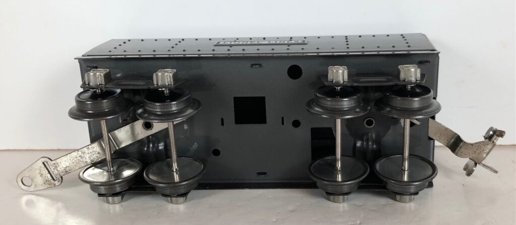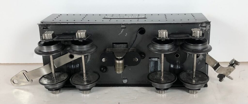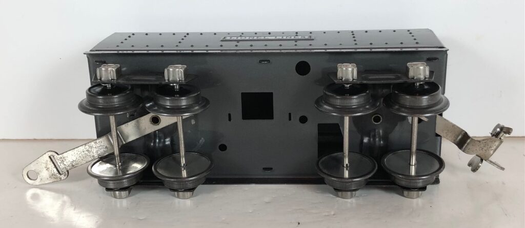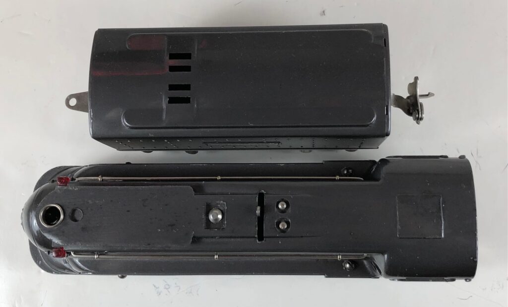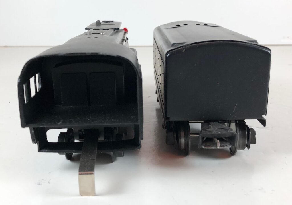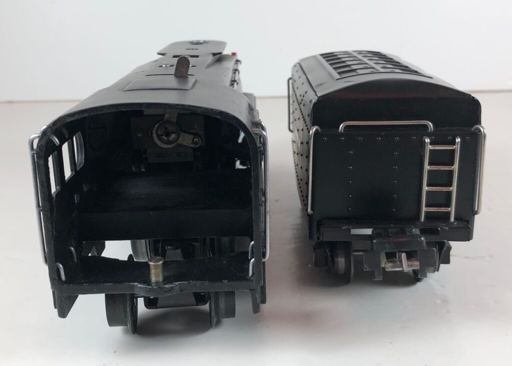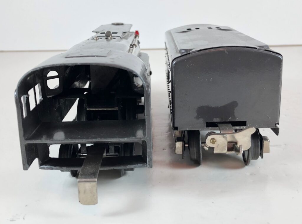 In 1936-1938, the No. 238E Steam Locomotive was issued in gunmetal gray and was paired with either a No. 265W, No. 2265W or No. 2225W Tender in gunmetal. In 1939 -1940, The No. 238E Locomotive was issued in black and was paired with either a No. 265T, No. 2225T or No. 2265W Tender in black. These tenders have a sheet metal “waffle top” body with nickel trim and aluminum “Lionel Lines” plates on the sides of the tender. The tenders have an early style manual or operating box coupler and nickel or black journals. The No. 238E / 2265T/W Steam engine and tender combined measure 19-inches in total length.