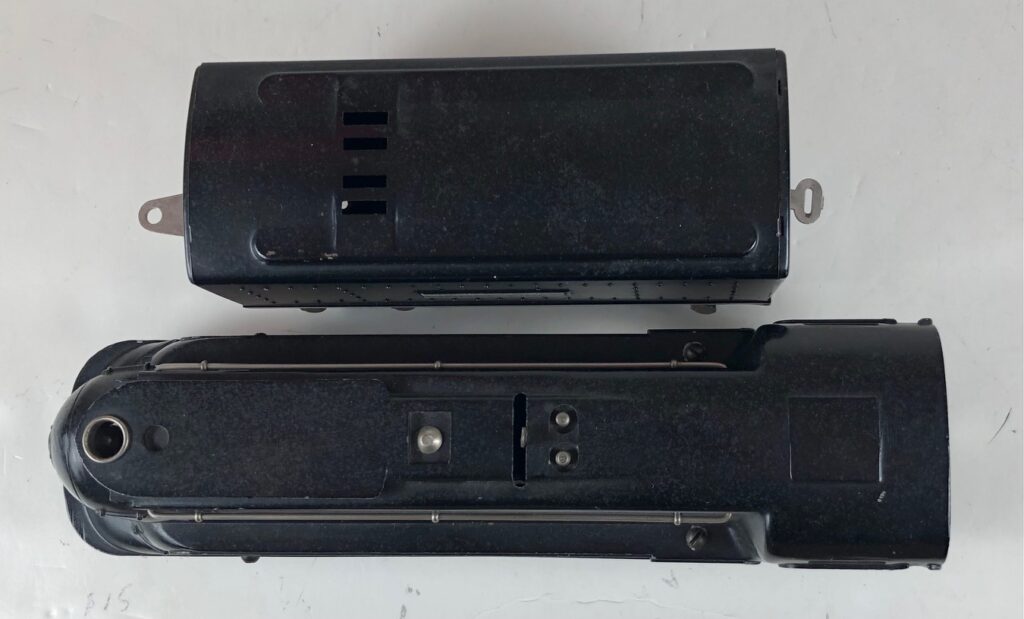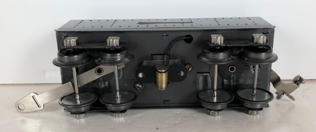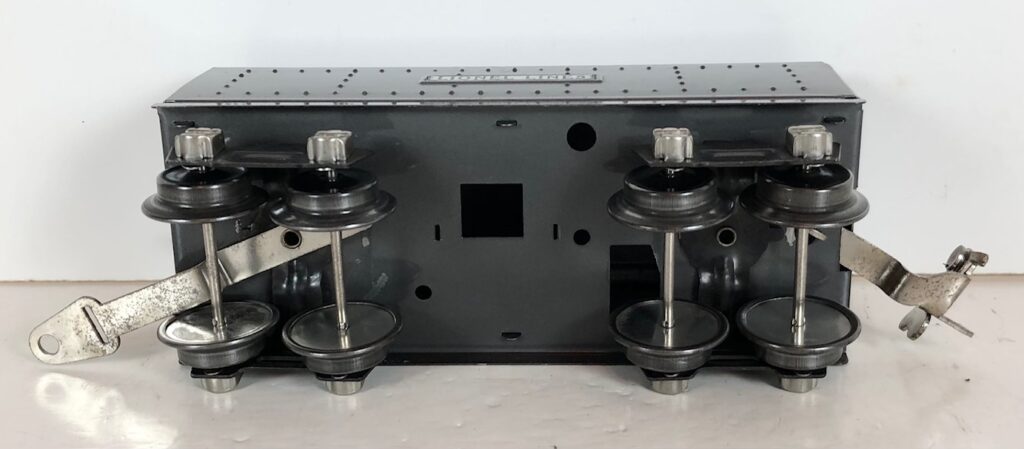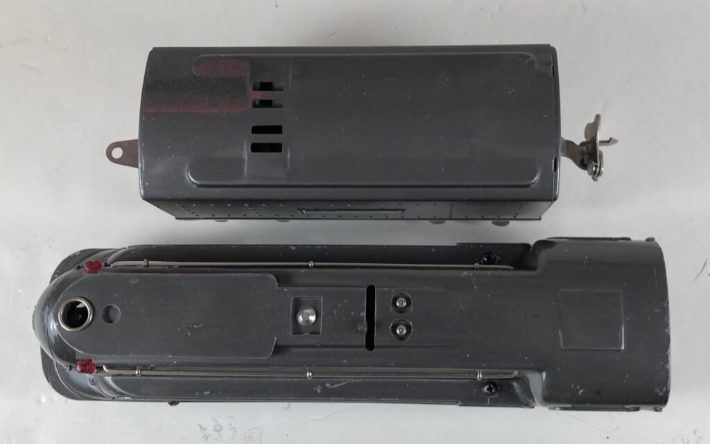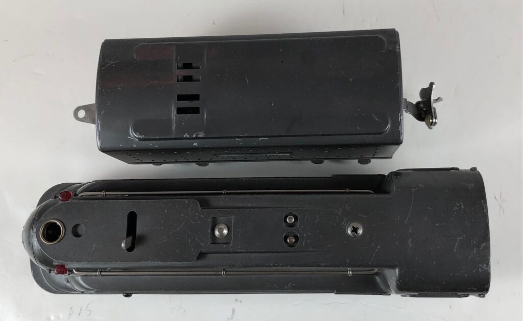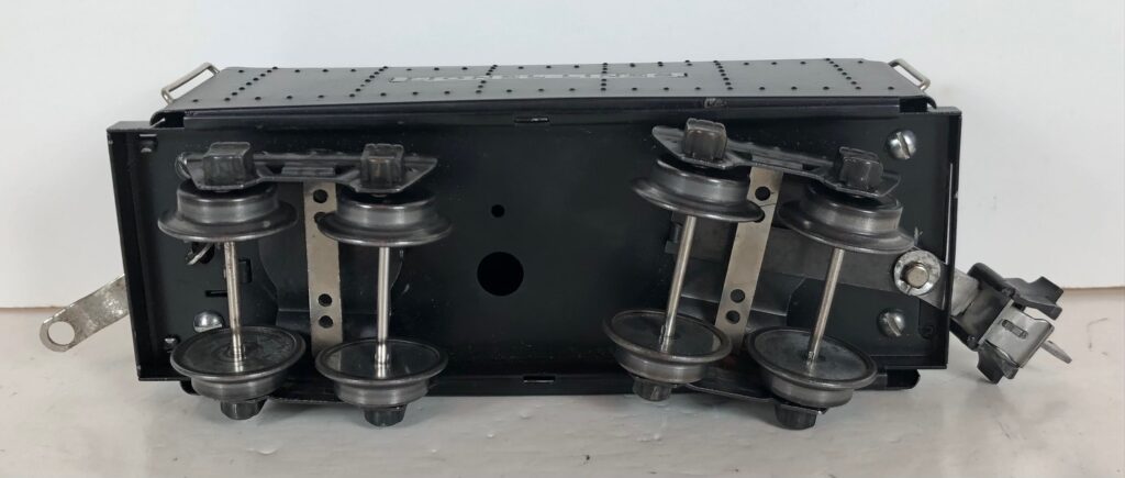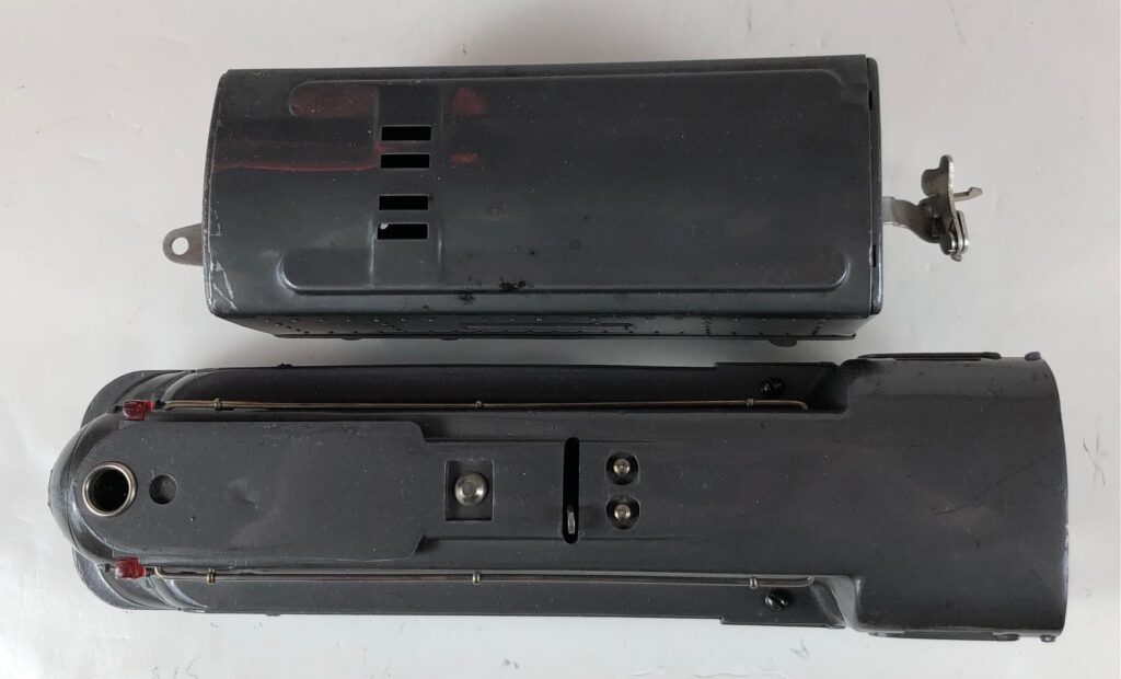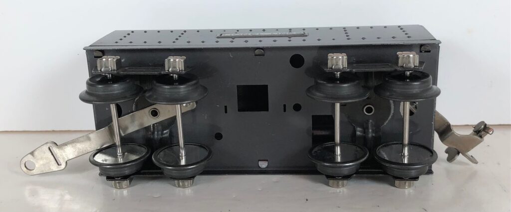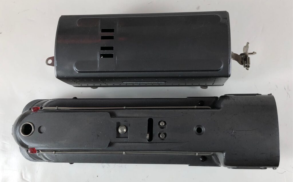 In 1936-1938, the No. 238E Steam Locomotive was issued in gunmetal gray and was paired with either a No. 265W, No. 2265W or No. 2225W Tender in gunmetal. In 1939 -1940, The No. 238E Locomotive was issued in black and was paired with either a No. 265T, No. 2225T or No. 2265W Tender in black. These tenders have a sheet metal “waffle top” body with nickel trim and aluminum “Lionel Lines” plates on the sides of the tender. The tenders have an early style manual or operating box coupler and nickel or black journals. The No. 238E / 2265T/W Steam engine and tender combined measure 19-inches in total length.