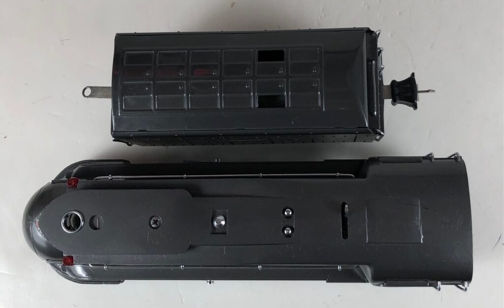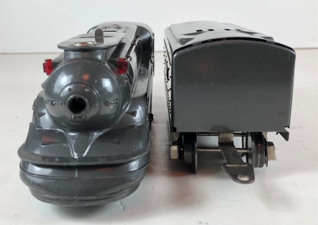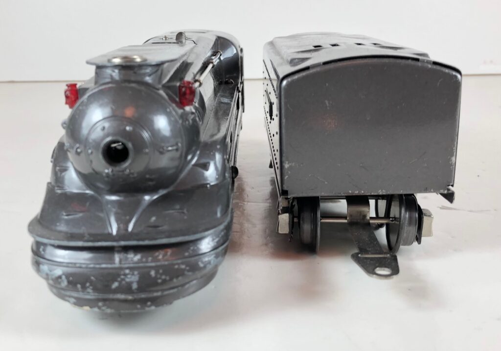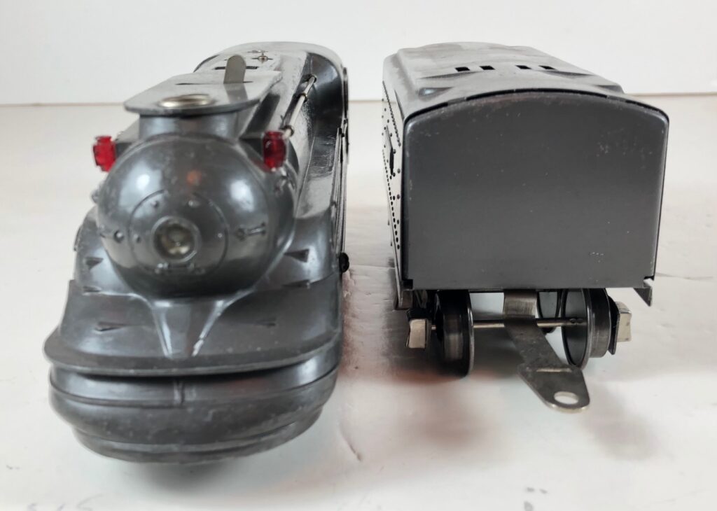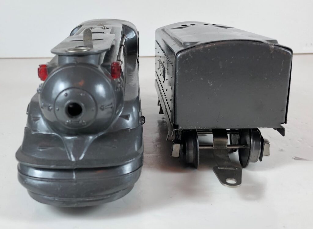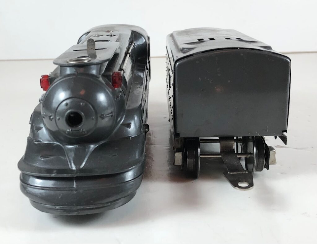 1. No. 238E / 265W 4-4-2 Steam Locomotive in gunmetal gray with nickel trim, “238E” aluminum number plates on the sides of the cab and aluminum “Pennsylvania” plates on the sides of the engine. (1936-1937). The No. 265W Tender is gunmetal gray with nickel trim and aluminum plates on the sides of the tender. The tender has nickel journals and an early style manual box coupler.