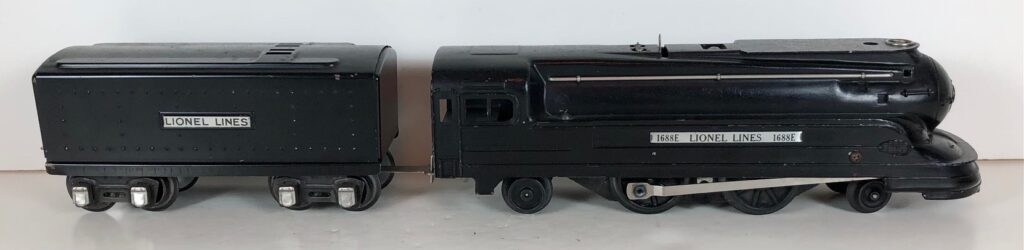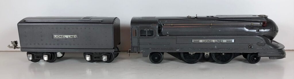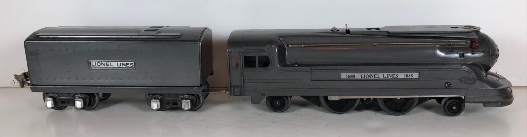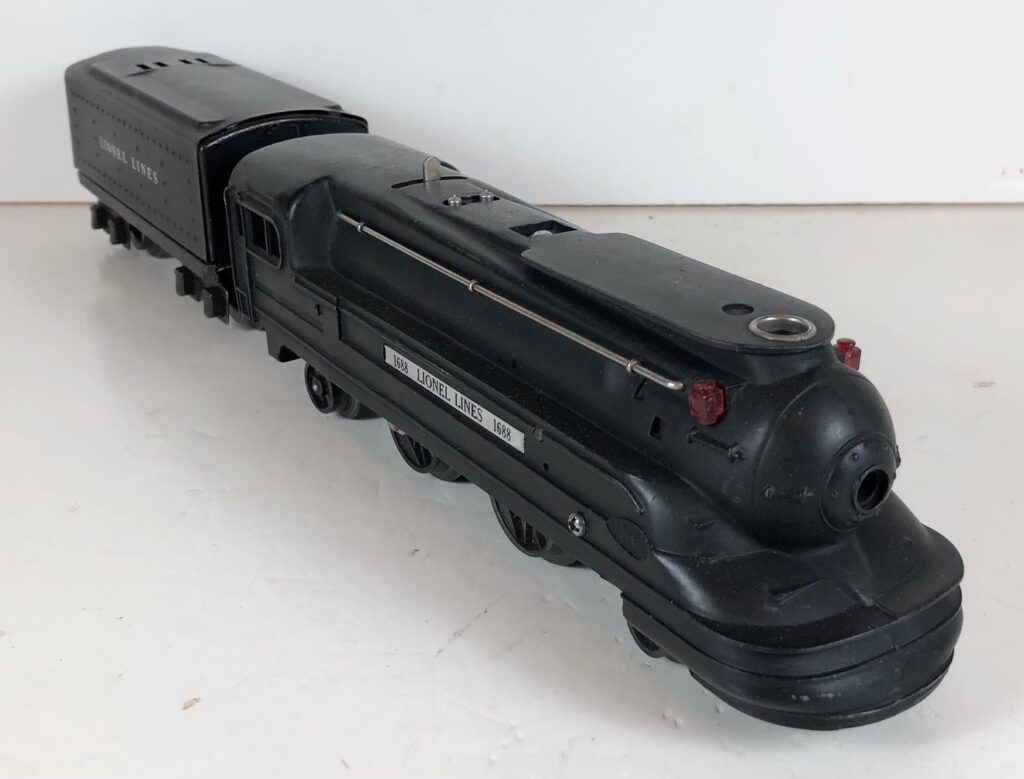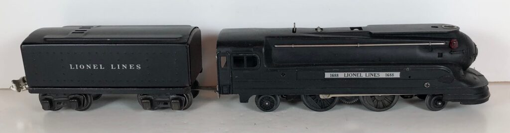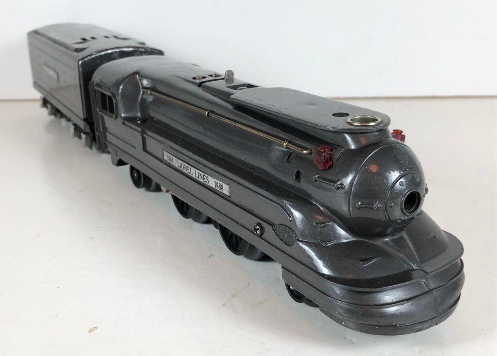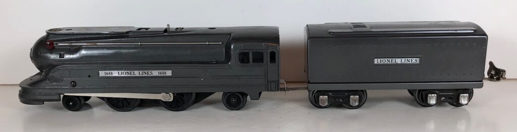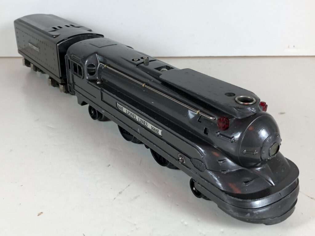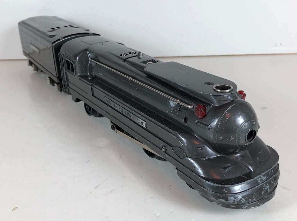The Lionel No. 1688E 2-4-2 “Torpedo” Steam Locomotive was introduced in 1936 and was cataloged in that year only. The locomotive was included as a component of many uncatalogued passenger and freight sets from 1936 through 1941. The locomotive was loosely based on the streamlined K-4 steam locomotive design by Raymond Loewy for the Pennsylvania Railroad. The No. 1688E Steam Locomotive utilized a one piece diecast body which was shared with the No. 1668E Locomotive. In addition to the difference in wheel configuration, the No. 1688 has only a single side rod on each side. Some No. 1688 Locomotives used the body of a No. 1668 Locomotive that had a screw hole in the roof just in front of the cab roof. Due to the different motor mounting configuration of the No. 1688 Locomotive, this screw hole was not used.