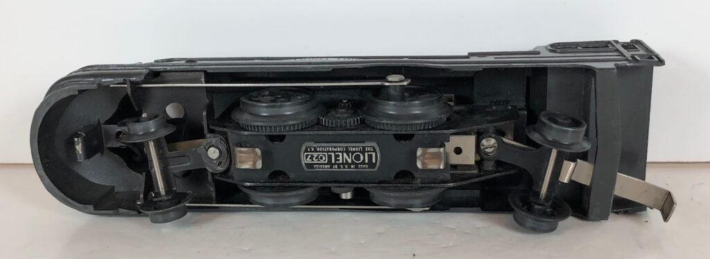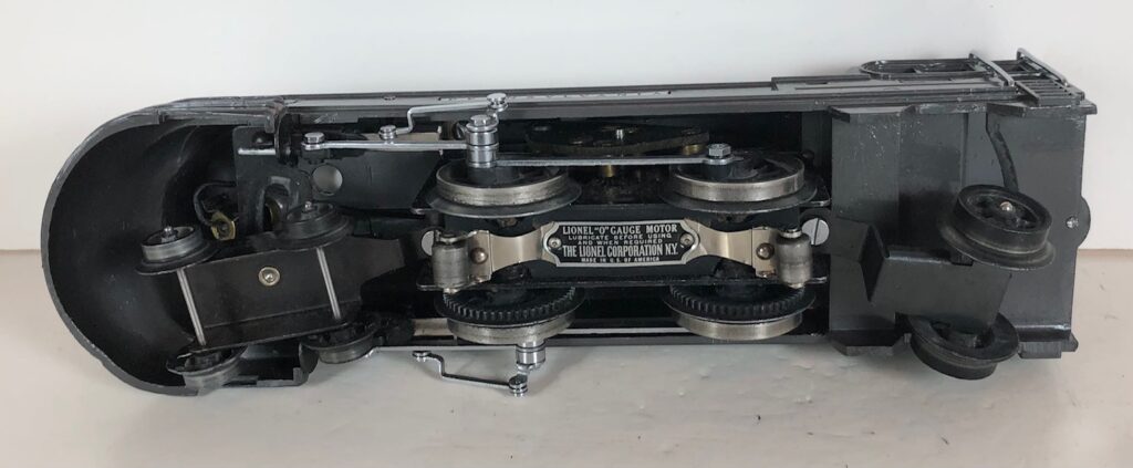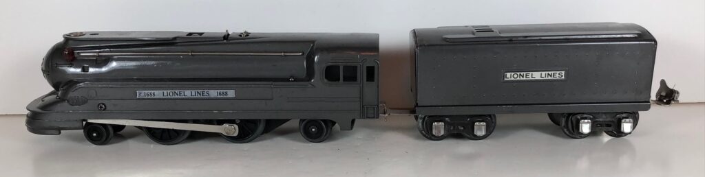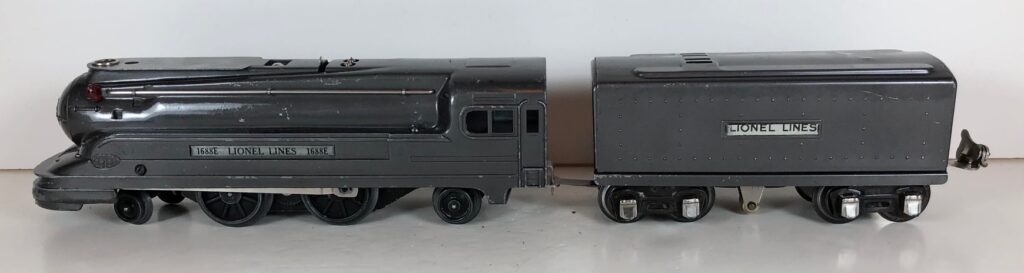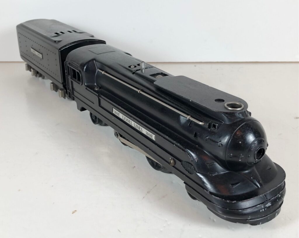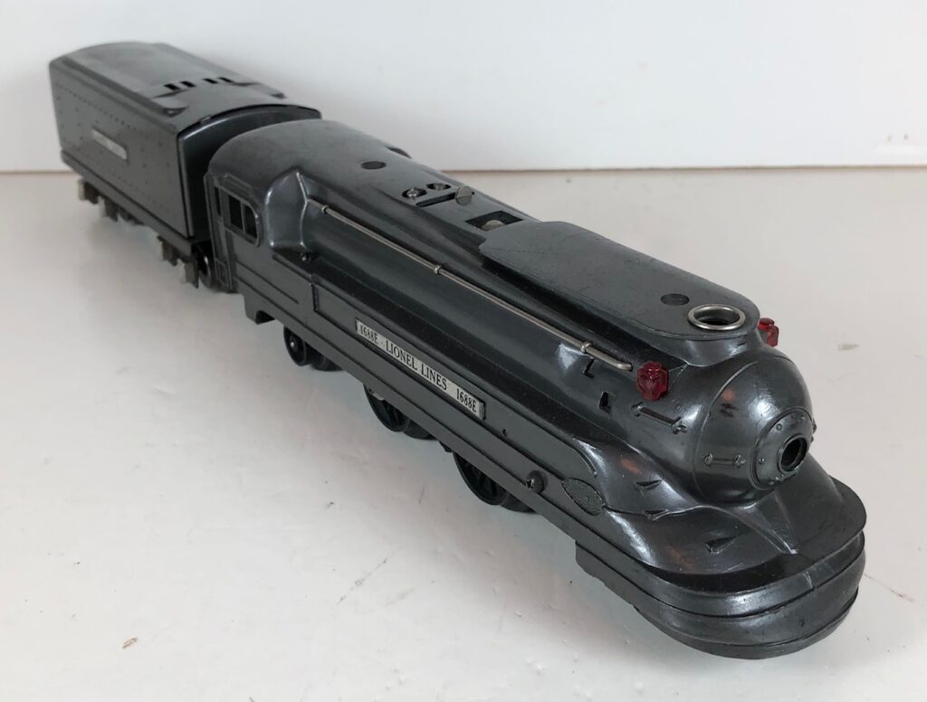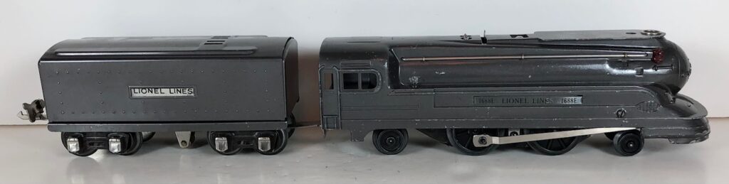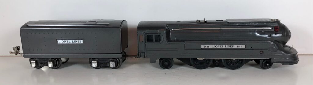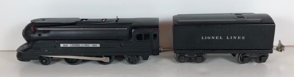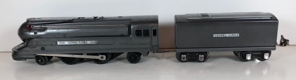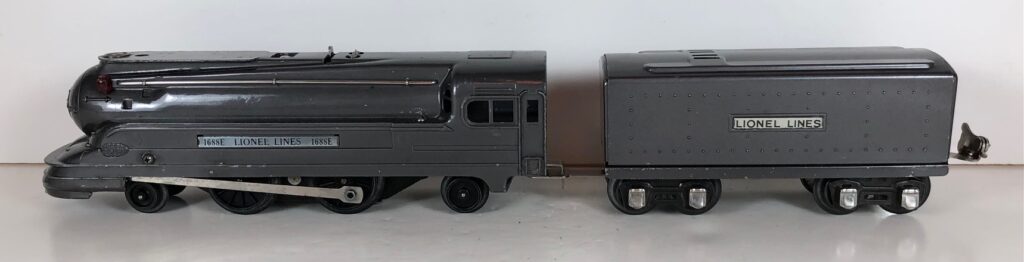 The Lionel No. 1688E 2-4-2 “Torpedo” Steam Locomotive was introduced in 1936 and was cataloged in that year only. The locomotive was included as a component of many uncatalogued passenger and freight sets from 1936 through 1941. The locomotive was loosely based on the streamlined K-4 steam locomotive design by Raymond Loewy for the Pennsylvania Railroad. The No. 1688E Steam Locomotive utilized a one piece diecast body which was shared with the No. 1668E Locomotive. In addition to the difference in wheel configuration, the No. 1688 has only a single side rod on each side. Some No. 1688 Locomotives used the body of a No. 1668 Locomotive that had a screw hole in the roof just in front of the cab roof. Due to the different motor mounting configuration of the No. 1688 Locomotive, this screw hole was not used.
