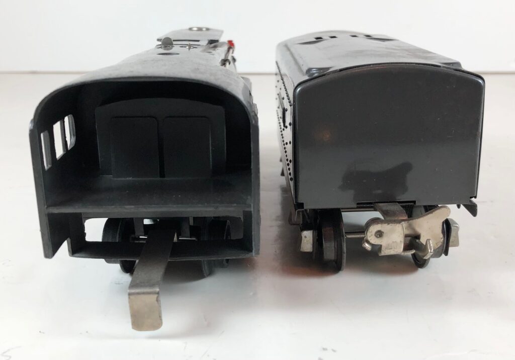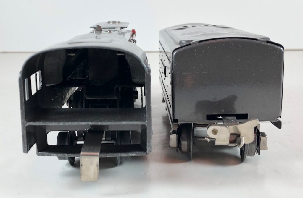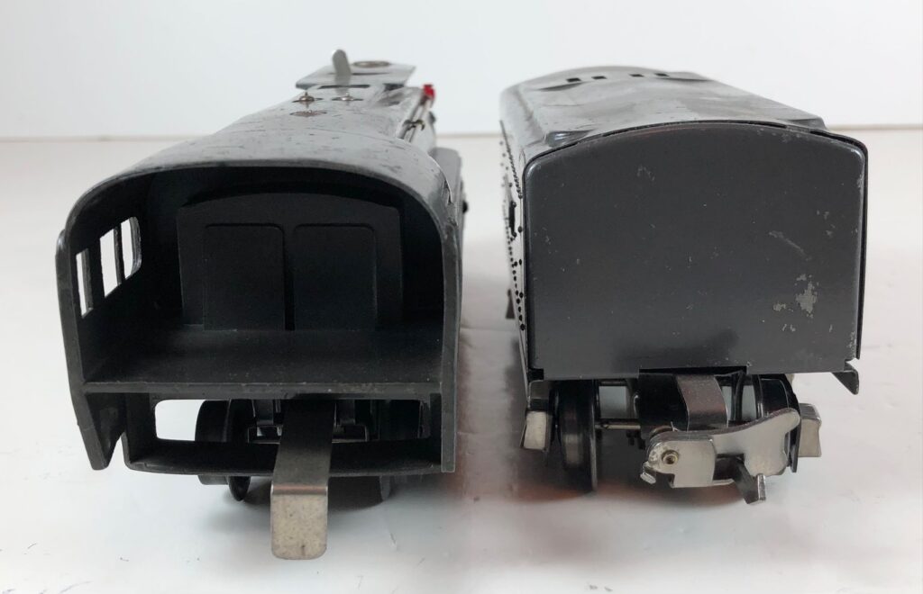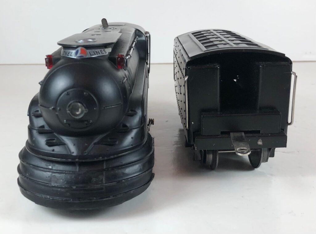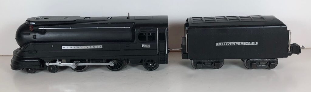 2. No. 238 / 265T 4-4-2 Steam Locomotive in black with nickel trim, “238” aluminum number plates on the sides of the cab and aluminum “Pennsylvania” plates on the sides of the engine. (1939-1940). The No. 265T Tender is black with nickel trim and aluminum plates on the sides of the tender. The tender has black journals and an early style manual box coupler.