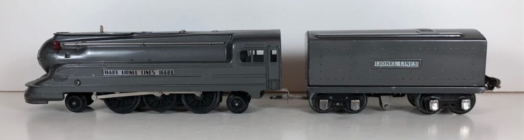 1. No. 1668E / 1689W 2-6-2 Steam Locomotive in gunmetal gray with nickel trim and aluminum plates on the sides of the body (1937-1938). The No. 1689W Tender is gunmetal gray with aluminum plates on the sides of the tender. The tender has nickel journals and a latch coupler.