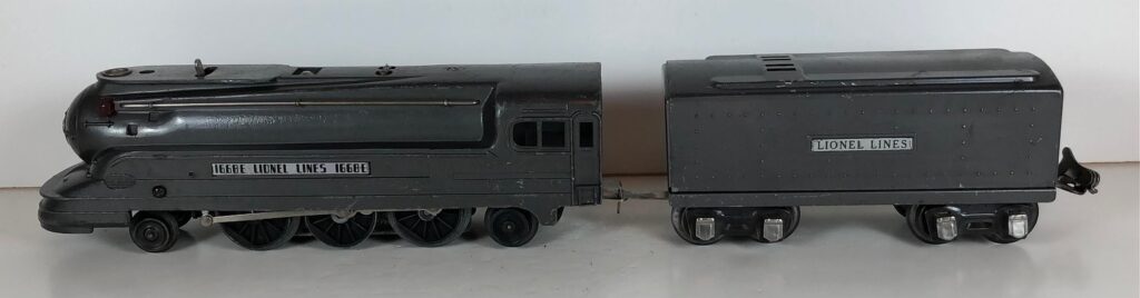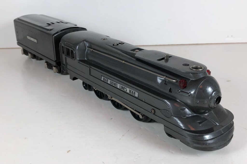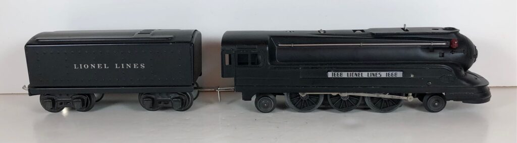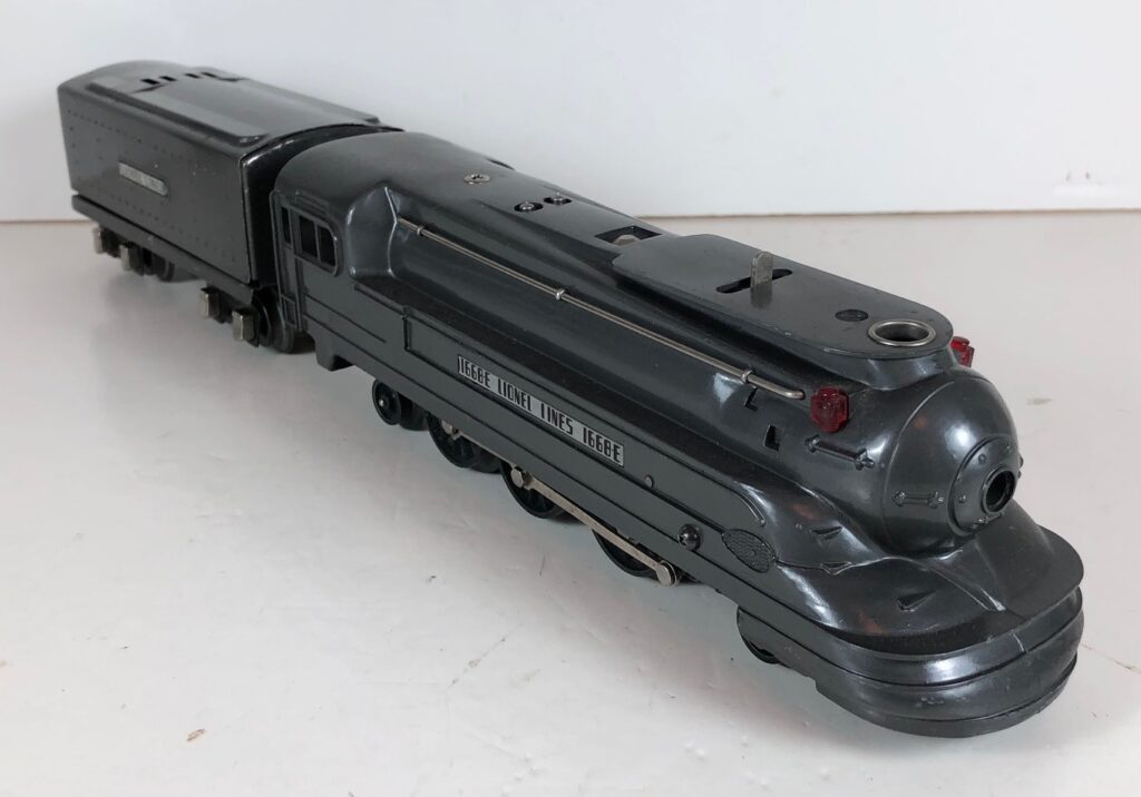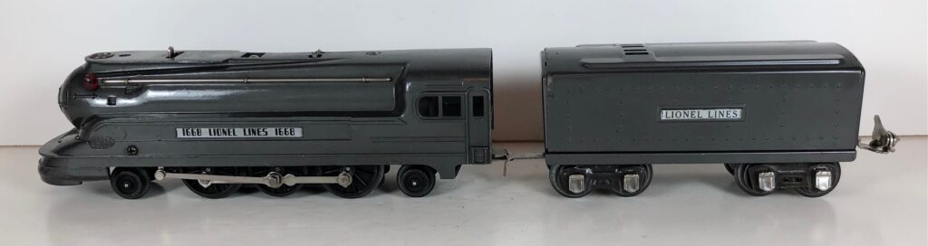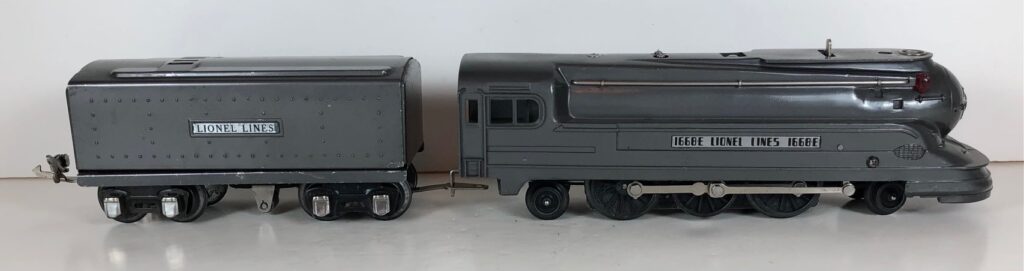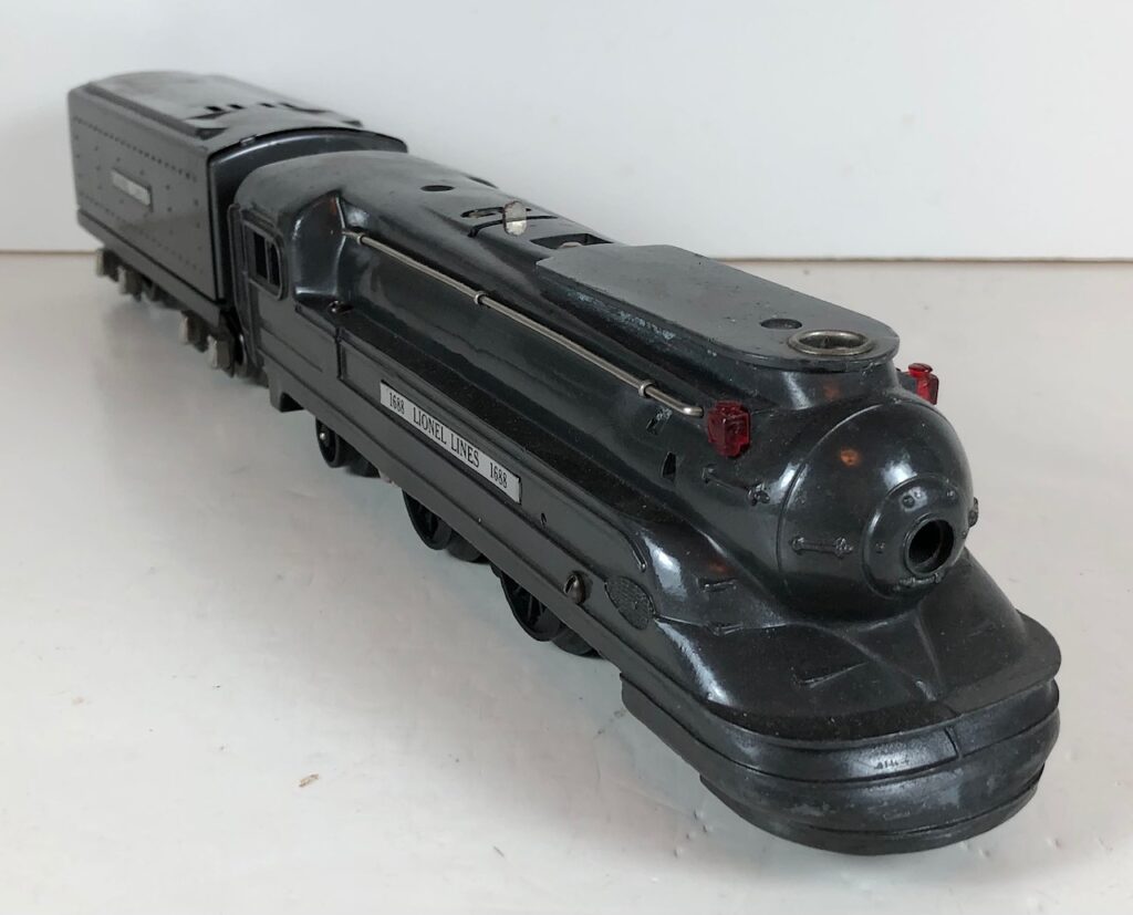 The Lionel No. 1668E 2-6-2 “Torpedo” Steam Locomotive was introduced in 1937 and was cataloged from 1937 through 1941. The locomotive was included as a component of several cataloged passenger and freight sets during this period. The locomotive was also included as a component of one uncataloged passenger set in 1941. The locomotive was loosely based on the streamlined K-4 steam locomotive design by Raymond Loewy for the Pennsylvania Railroad. The No. 1668E Steam Locomotive utilized a one piece diecast body.