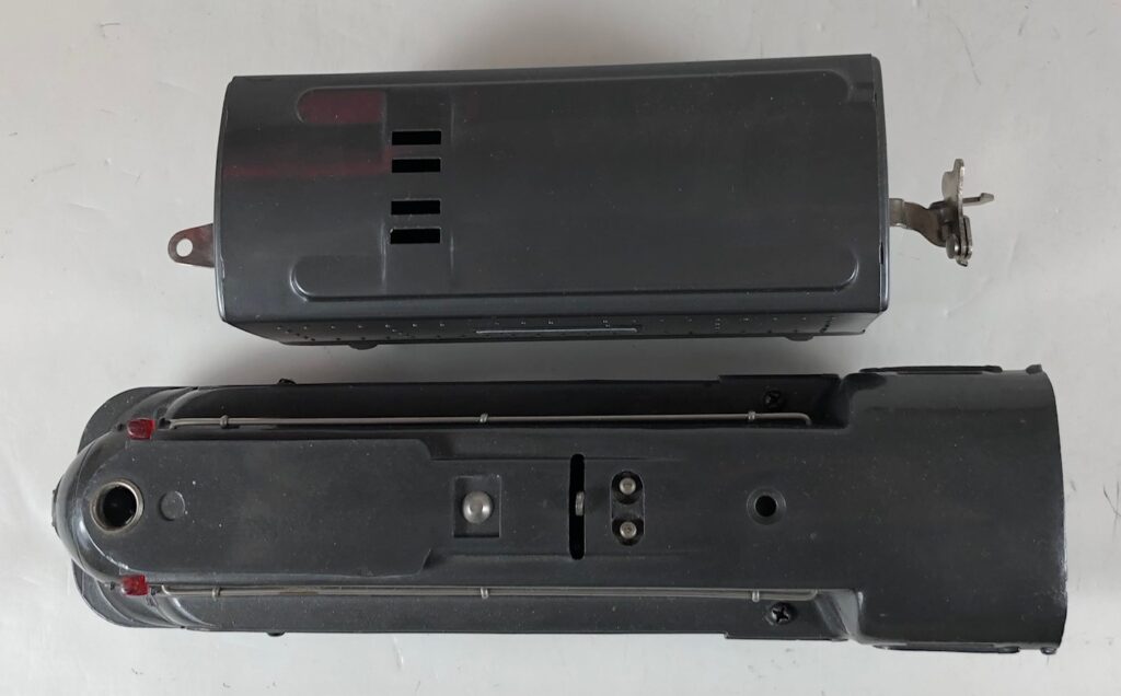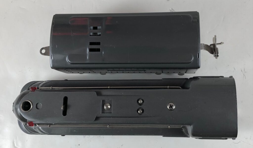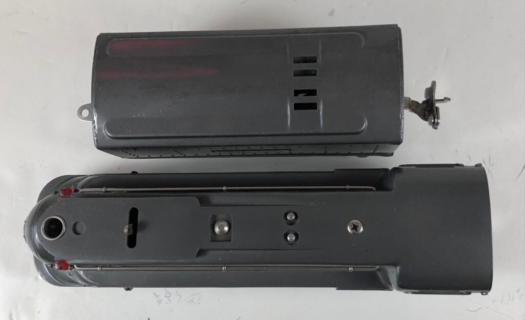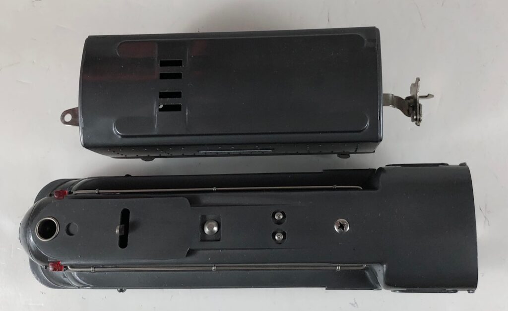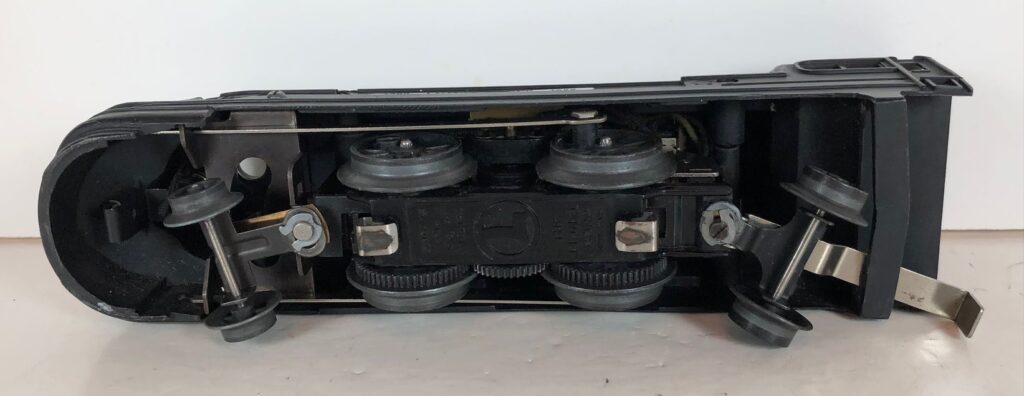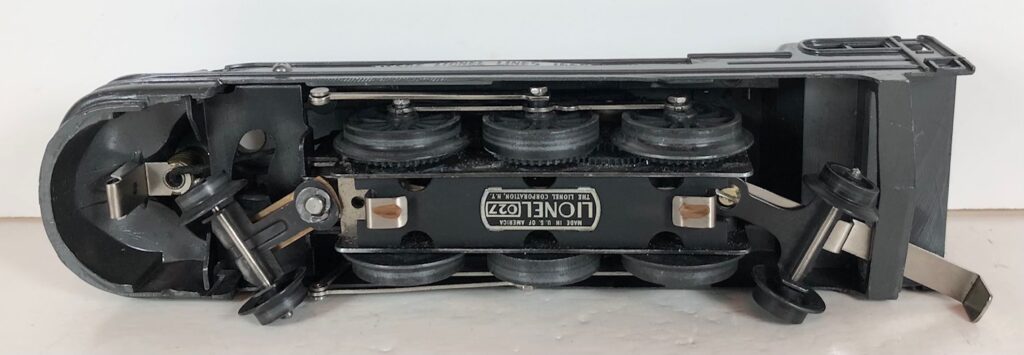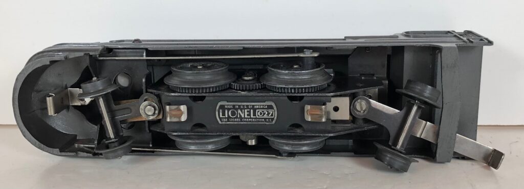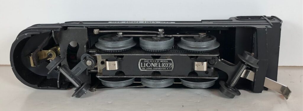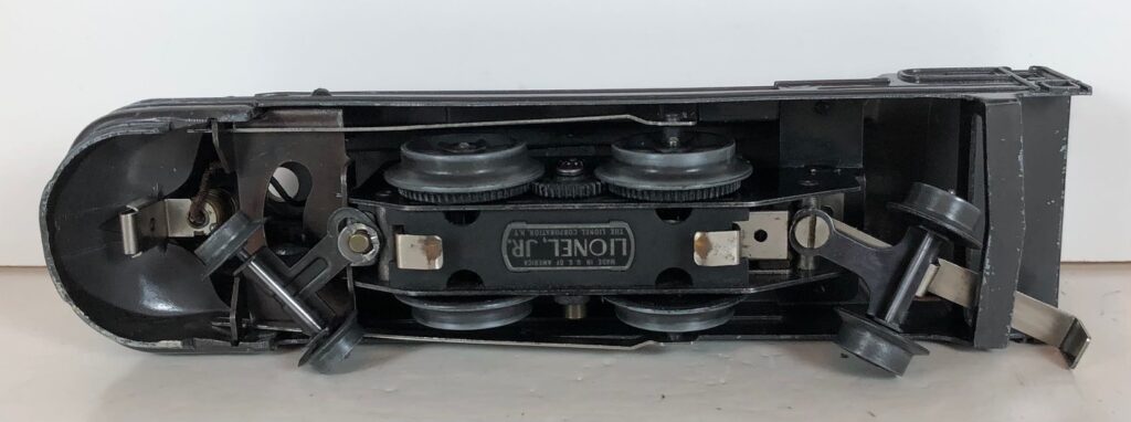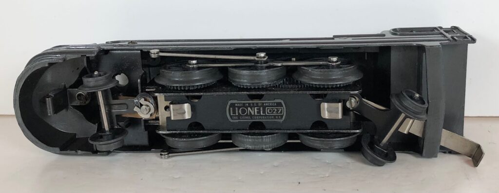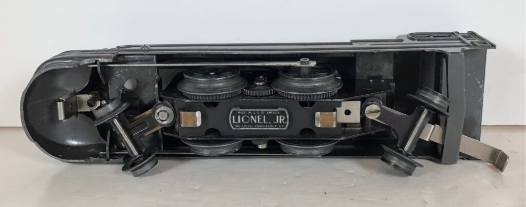 The locomotive has nickel trim, aluminum number plates on the sides of the cab, aluminum “Pennsylvania” plates on the sides of the engine, an aluminum “Lionel Lines” circle “L” wings plate above the headlight and red plastic marker lights. Although both gunmetal gray and black No. 238E Locomotives were designated as “238E”, the number plates for gray locomotives were lettered “238E” and the number plates for the black locomotives were typically lettered “238”. The No. 238E Steam Locomotive has an operating headlight and a remotely operated reverse with a lever on the top of the boiler that engages or disengages the reversing unit.