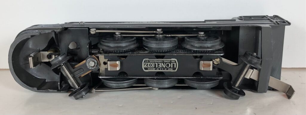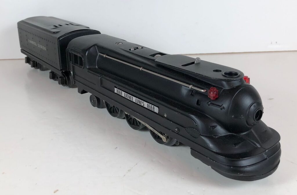 The locomotive has nickel trim and aluminum plates with the number and “Lionel Lines” on the sides of the engine. Early No. 1668E Locomotives have “1668E” on the plates. Later locomotives have “1668” on the plates. A unique version of the No. 1668E Locomotive has an aluminum plate on the left side only and no plate on the right side. The No. 1668E Steam Locomotive has an operating headlight, two red plastic marker lights and a remotely operated reverse with a lever on the top of the boiler that engages or disengages the reversing unit.