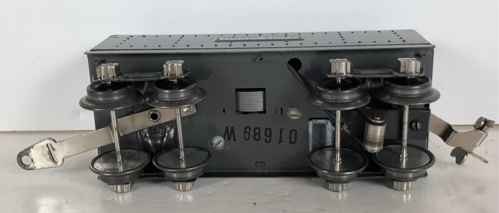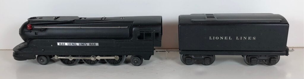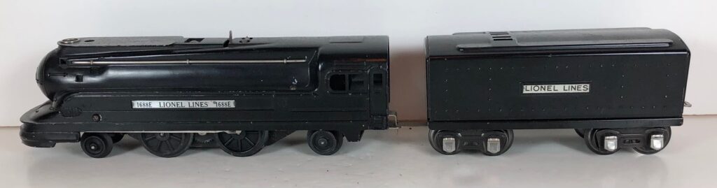8. No. 1688 / 1689T 2-4-2 Steam Locomotive in black with nickel trim and aluminum plates on the sides of the body with “1668” (1939-1941). The locomotive has a Bakelite pick-up plate. The No. 1689T Tender is black with rubber stamped lettering on the sides of the tender. The tender has black journals and a latch coupler.