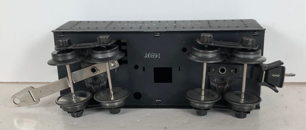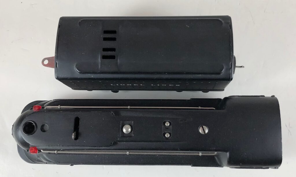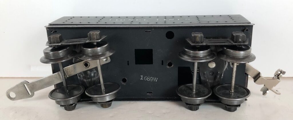 The No. 1668E Steam Locomotive was always paired with a No. 1689T/W Tender. The 1689T/W Tender has a square sheet metal body, nickel or black journals and a latch or late style manual box coupler. Early tenders have an aluminum “Lionel Lines” plate on the sides and no other trim. Later black tenders have rubber stamped “Lionel Lines” on the sides. The No. 1668E / 1689T/W Steam engine and tender combined measure 16-inches in total length.