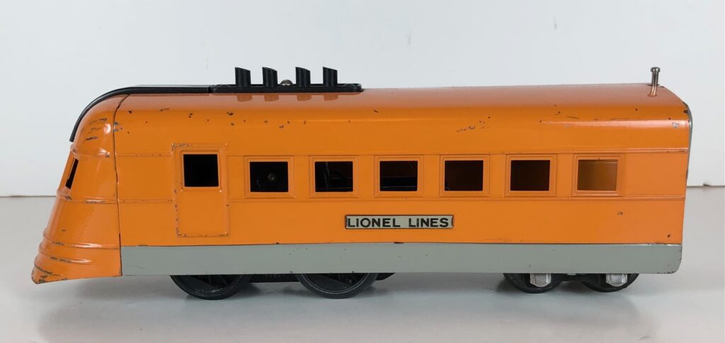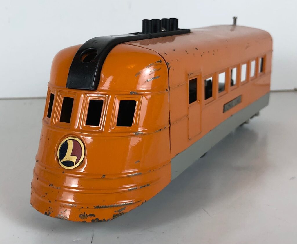 4. No. 1700(E) Streamlined Locomotive in orange and gray with orange nose and smooth sides. This locomotive with coaches is commonly referred to as the “Baby Hiawatha” set.