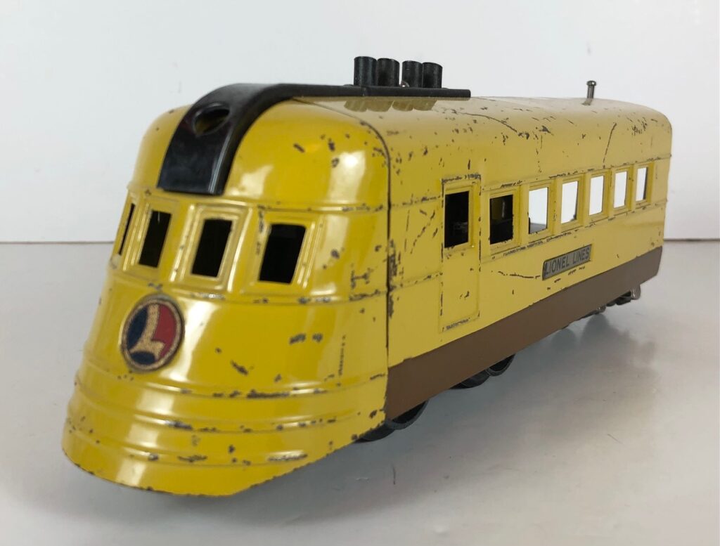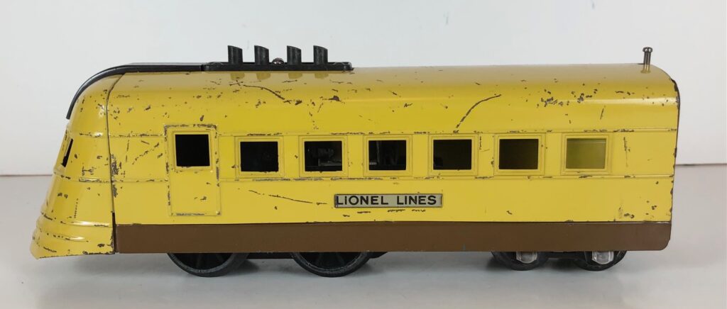 5. No. 1700(E) Streamlined Locomotive in yellow and brown with yellow nose and smooth sides. This locomotive with coaches in Union Pacific colors is the rarest of the No. 1700(E) sets