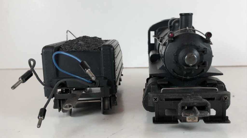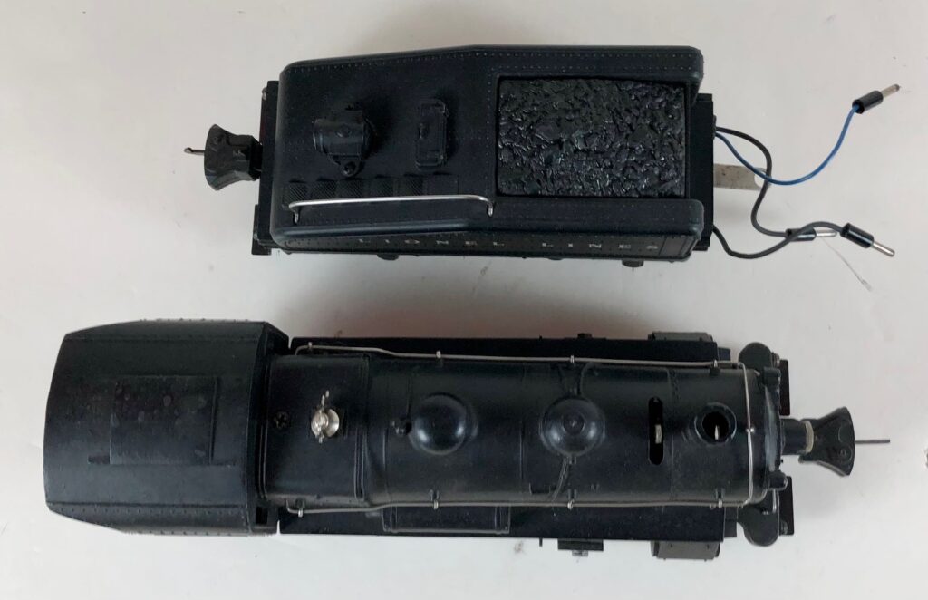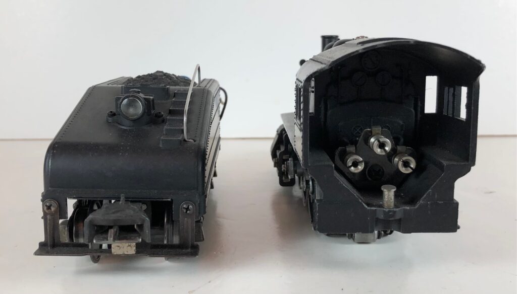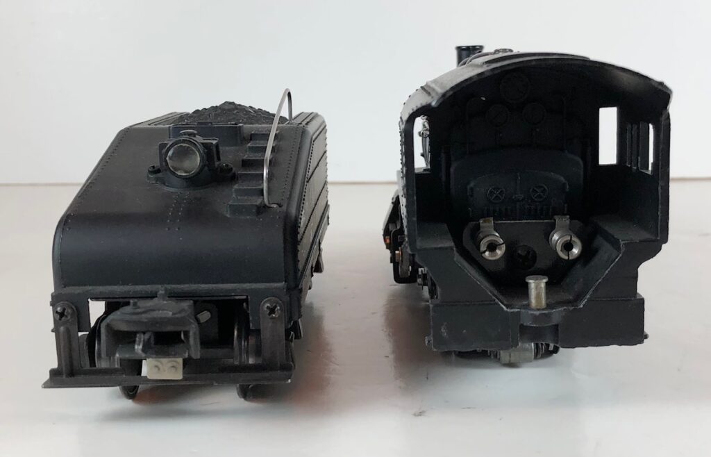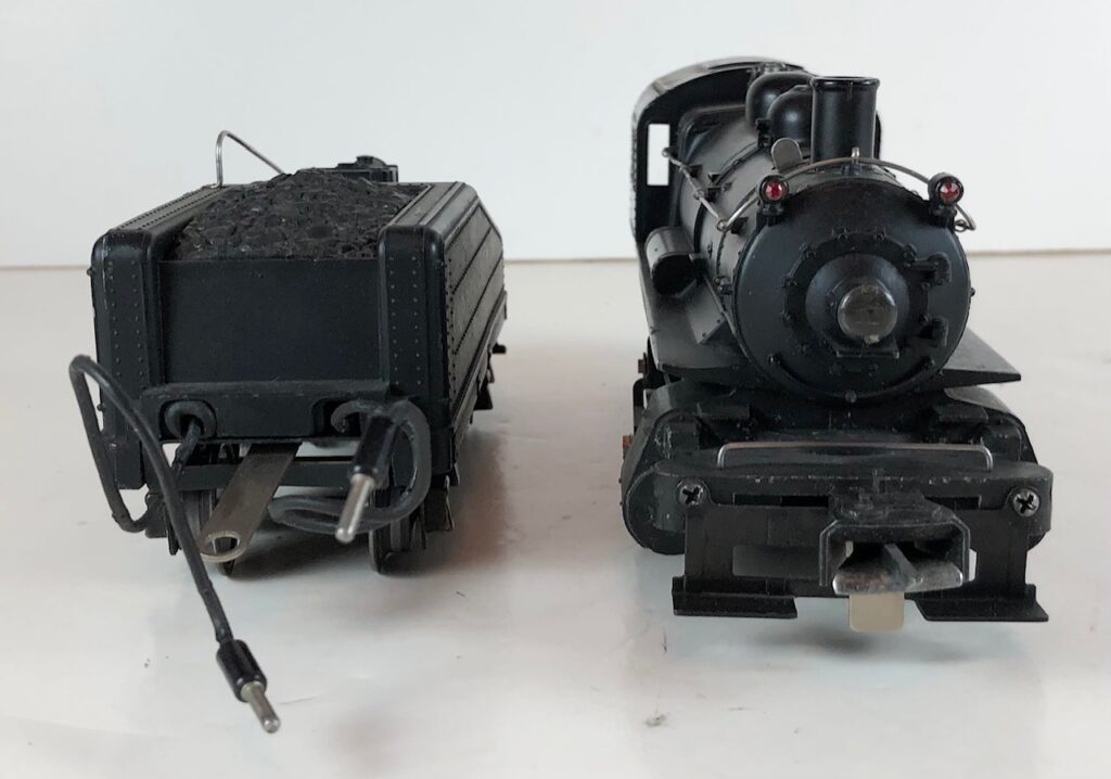 The No. 201 / 2201B Steam Switcher engine and tender combined measure 15-inches in total length. The engine has a diecast body with marker lights, steel handrails, decorative bell, and molded in boiler details. The engine has an operating headlight and operating front coupler. The engine number is rubber stamped on the sides of the cab under the windows. The tender has an operating back-up light that is always on and a bell (when installed) which is controlled by an on/off switch. The tender shell is diecast and has a steel handrail, molded details, and a simulated coal pile. The tender has three leads that plug in to the rear of the cab to provide power to the engine front coupler, the light and bell, and the locomotive E-Unit. The engine and tender have late style operating box couplers and “Magic Electrol” which allows the locomotive to be operated independently from another train running on the same track by use of a No. 168 Controller. Tenders not equipped with a bell are designated as No. 2201T.