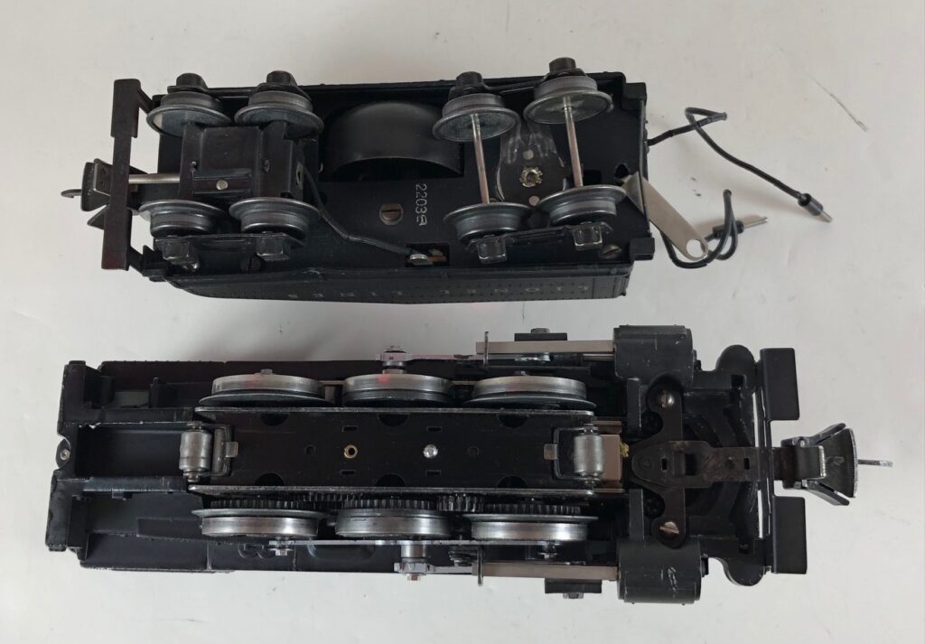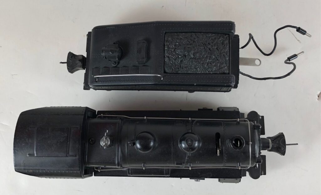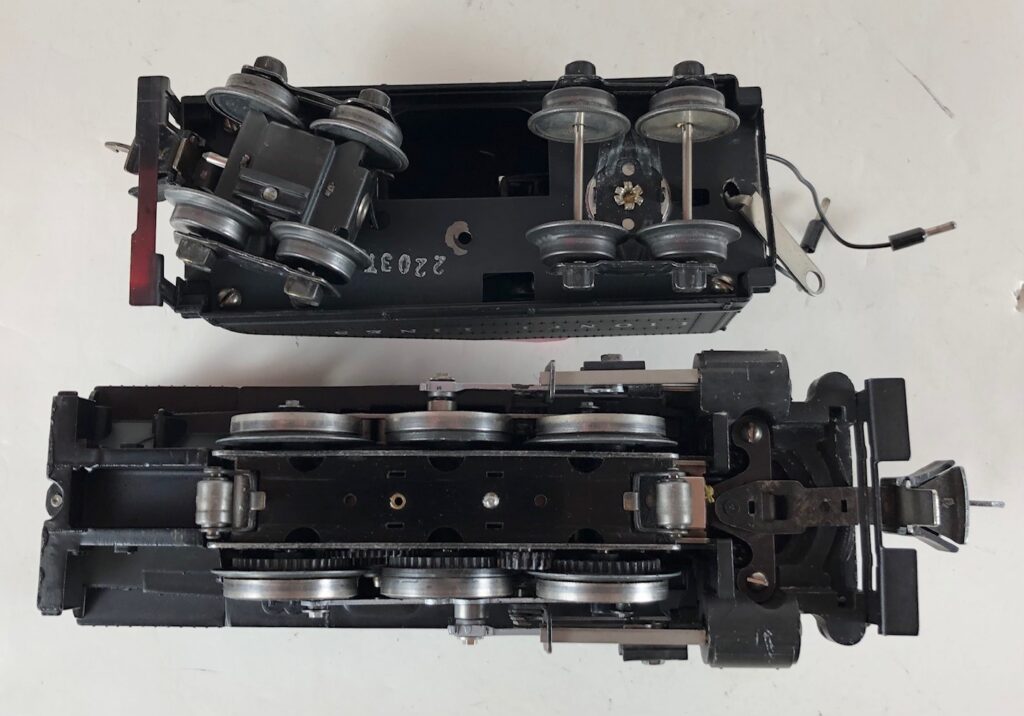 The No. 203 / 2203B Steam Switcher engine and tender combined measure 15-inches in total length. The engine has a diecast body with marker lights, steel handrails, decorative bell, and molded in boiler details. The engine has an operating headlight and operating front coupler. The engine number is rubber stamped on the sides of the cab under the windows. The tender has an operating back-up light that is always on and a bell (when installed) which is controlled by an on/off switch. The tender shell is diecast and has a steel handrail, molded details, and a simulated coal pile. The tender has two leads that plug in to the rear of the cab to provide power to the engine front coupler and the light and bell. The engine and tender have late style operating box couplers. The locomotive was not equipped with “Magic Electrol”. The locomotive E-Unit operated in the conventional manner. The absence of “Magic Electrol” is the only difference between the No. 201 and the No. 203 Locomotives. Tenders not equipped with a bell are designated as No. 2203T.