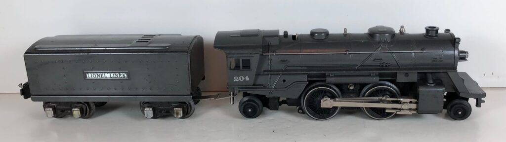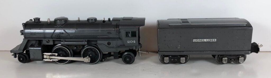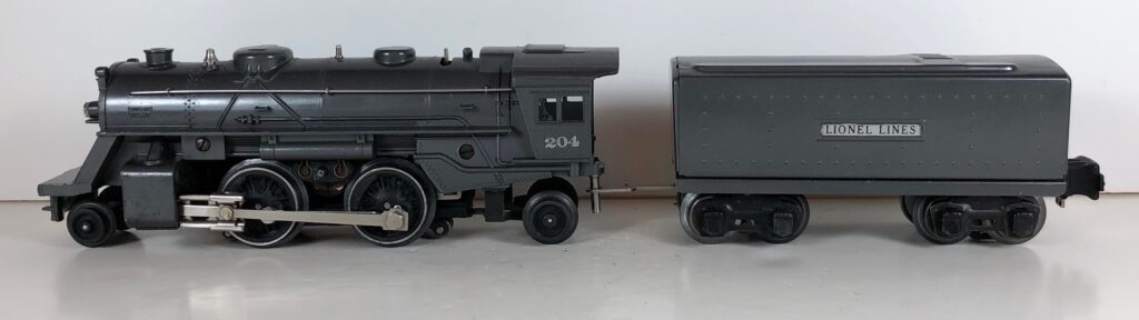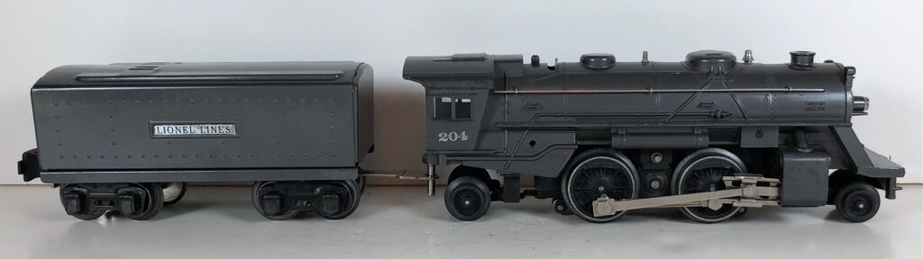 1. No. 204 / 2689W 2-4-2 Steam Locomotive in gunmetal gray with nickel trim and rubber stamped number on the sides of the cab (1940-1941). The No. 2689W Tender is gunmetal gray with nickel plates on the sides of the tender. The tender has black journals and an early style operating box coupler.