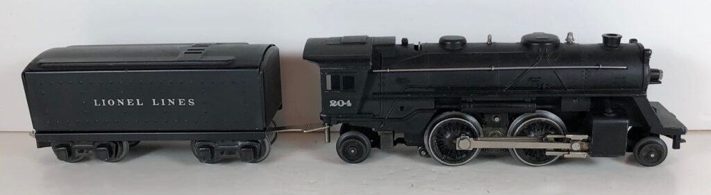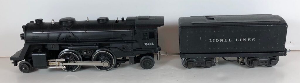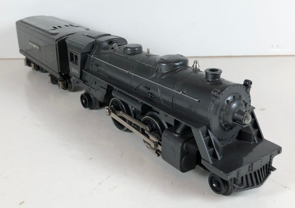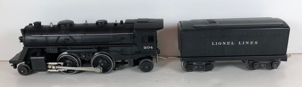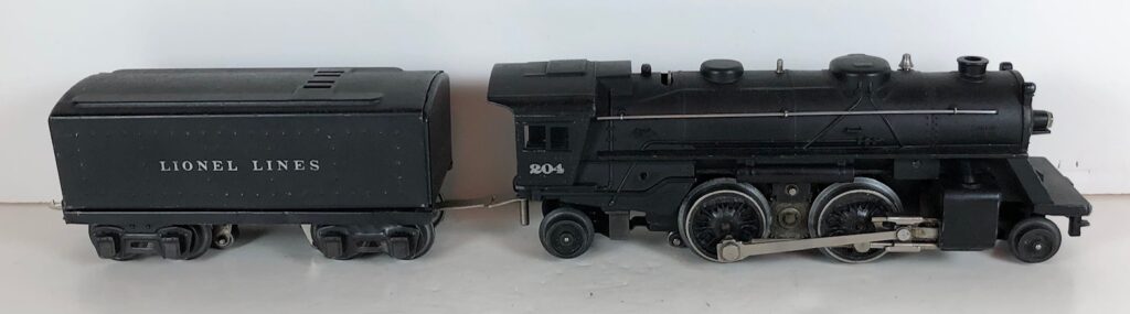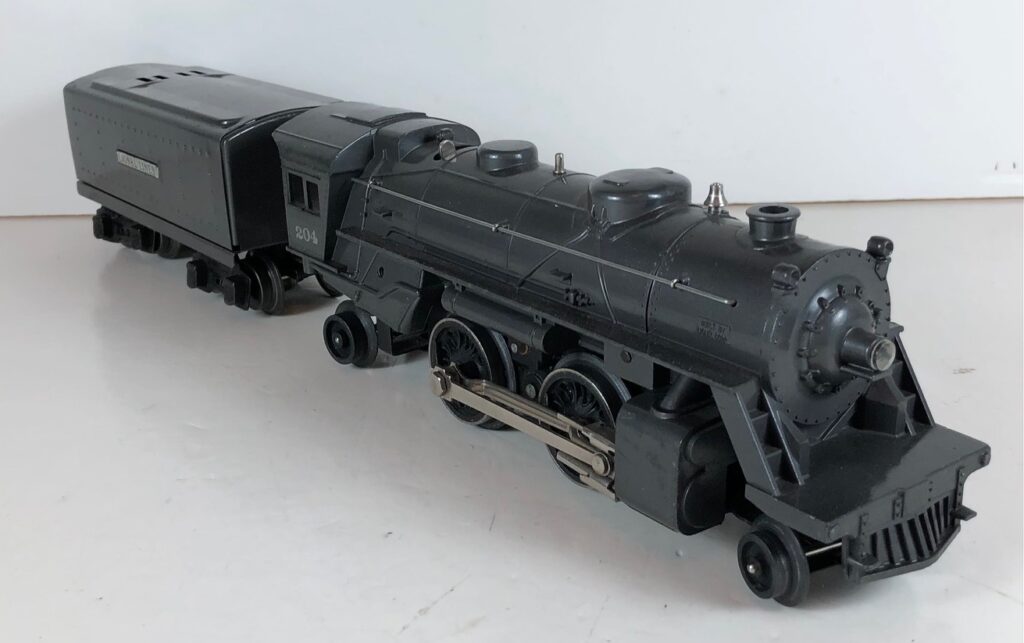 The Lionel No. 204 2-4-2 Steam Locomotive was introduced in 1940 and was issued through 1941. The No. 204 Locomotive was only included as a component of a large number of uncataloged passenger and freight sets during this period. The No. 204 Steam Locomotive utilized a one piece diecast body and, along with the No. 1684, was the smallest of the diecast steam locomotives issued by Lionel in the prewar period.