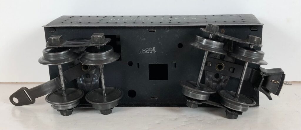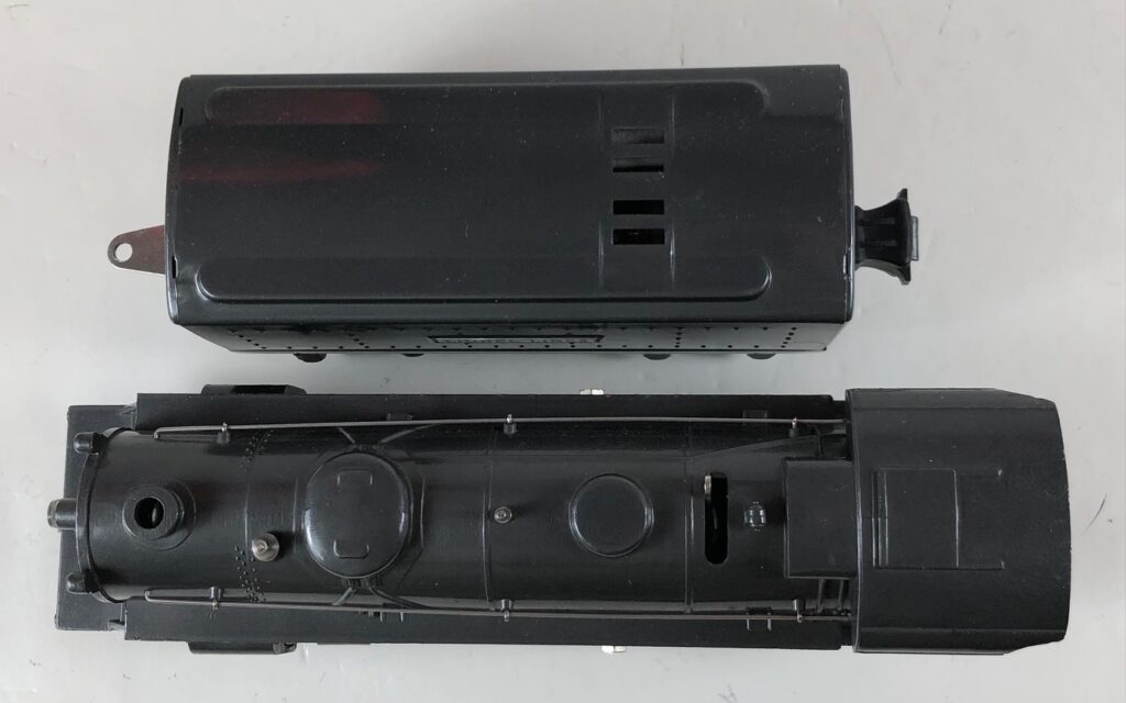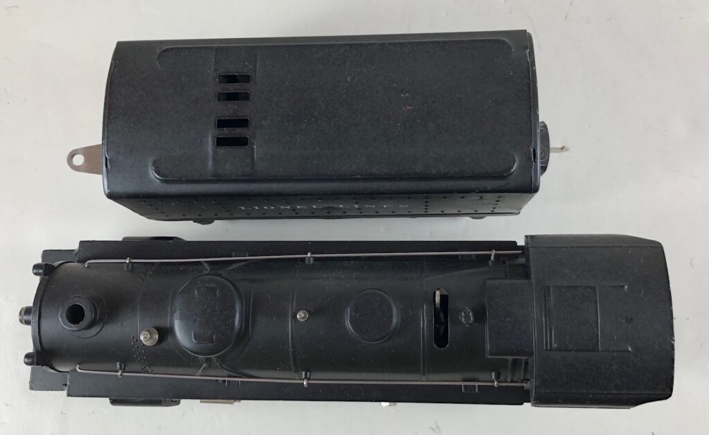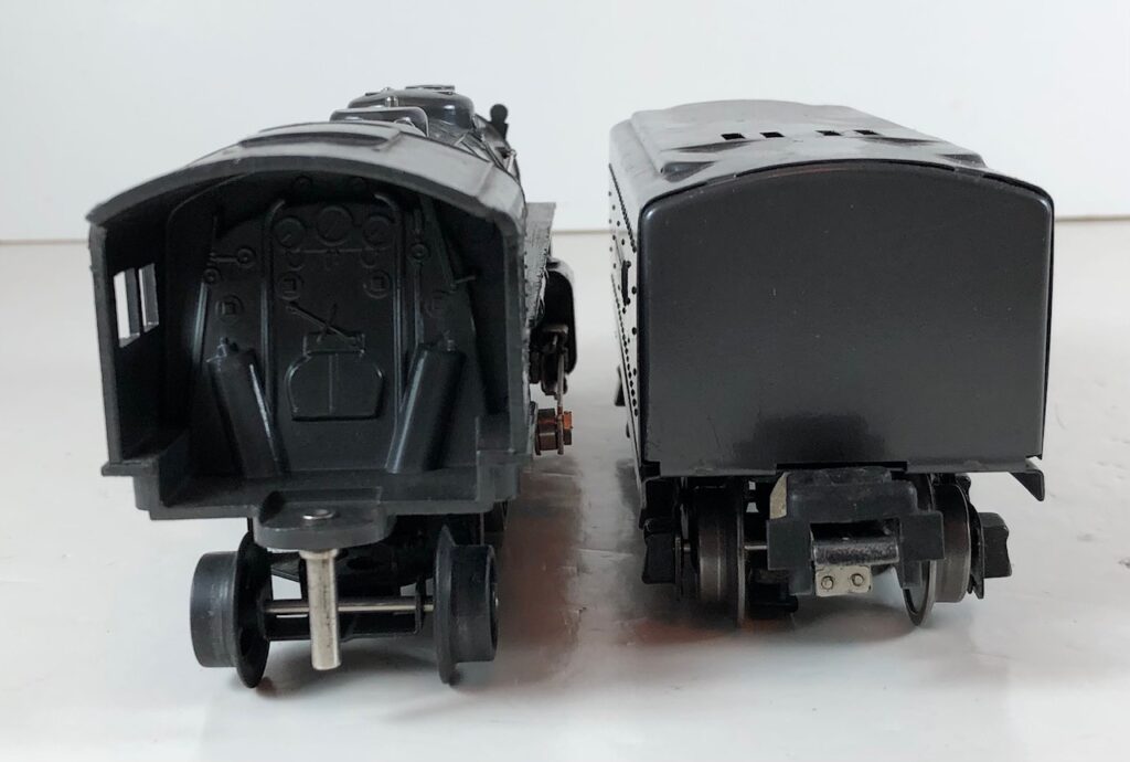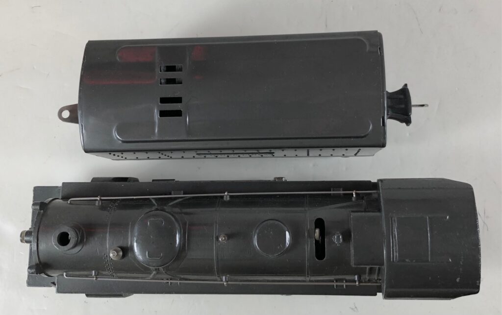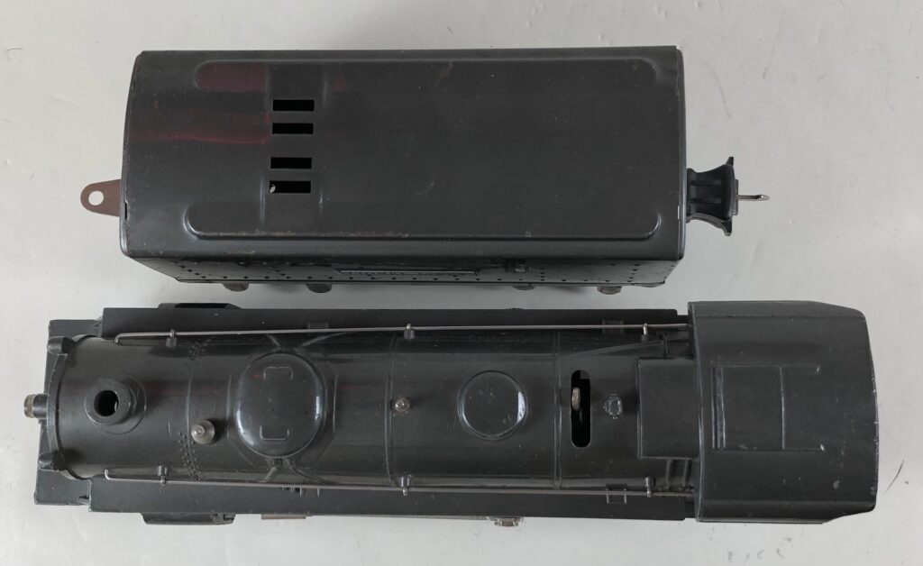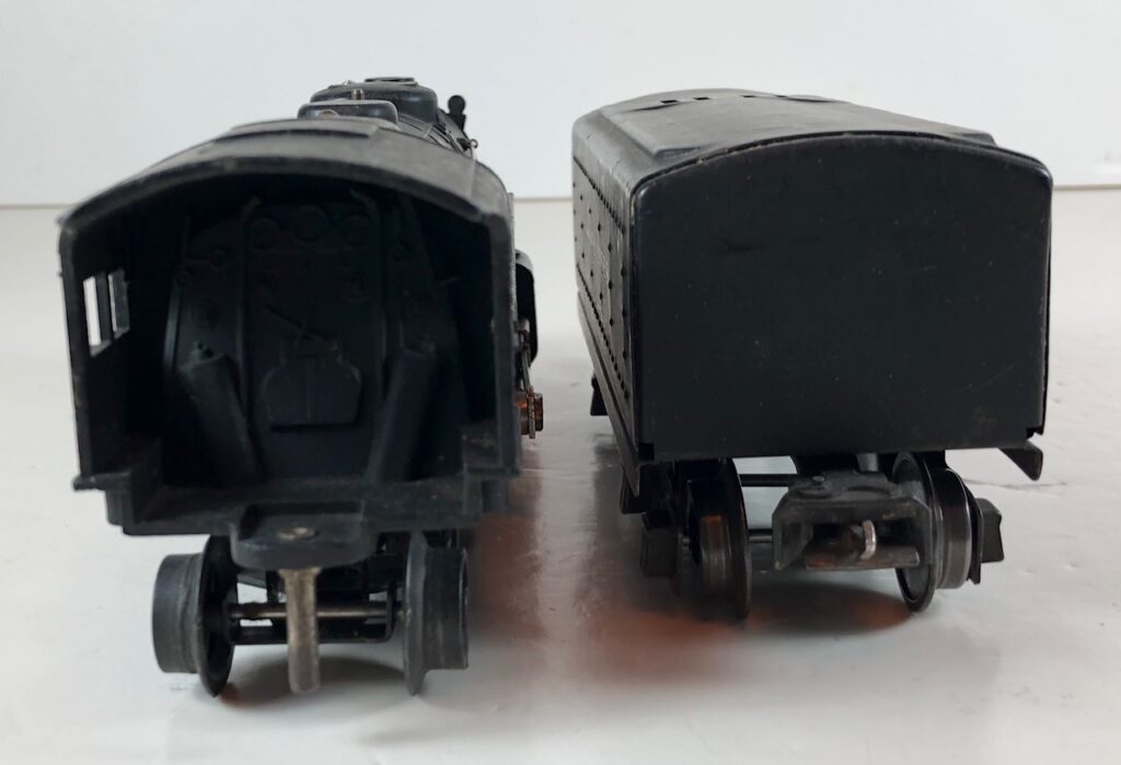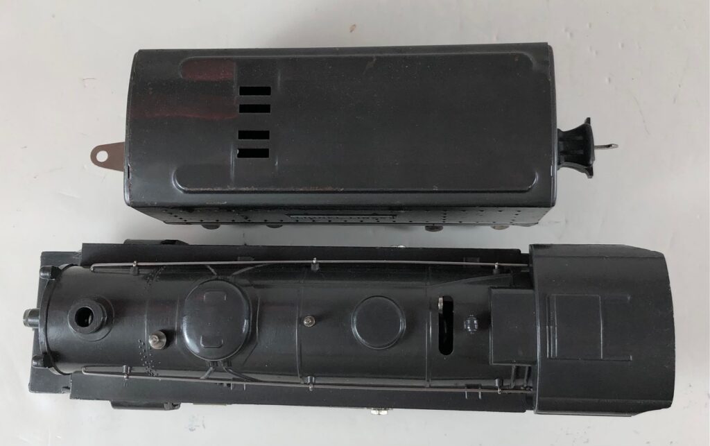 The No. 204 Steam Locomotive was paired with a No. 1689T/W or No. 2689T/W Tender. The No. 1689T/W and the No. 2689T/W Tenders have a square sheet metal body with an early or late style manual or operating box coupler. The tenders have either aluminum “Lionel Lines” plates (gray tenders) or “Lionel Lines” rubber stamped on the sides (black tenders) and no other trim. The No. 204 / 2689T/W Steam engine and tender combined measure 16-inches in total length.