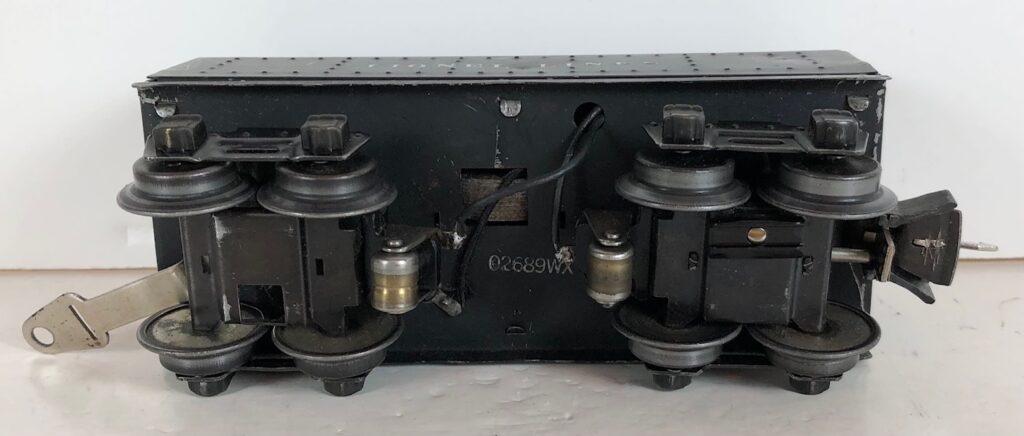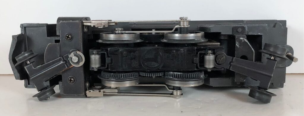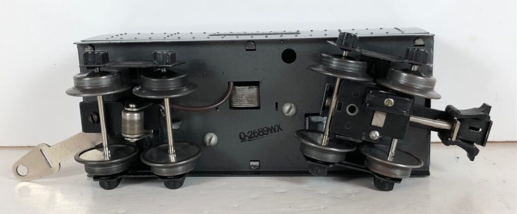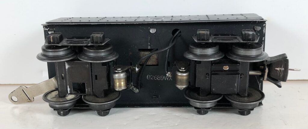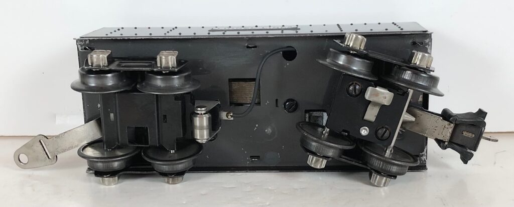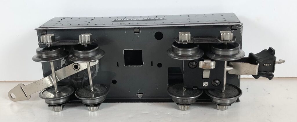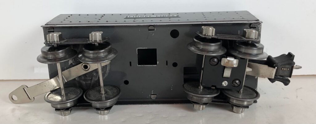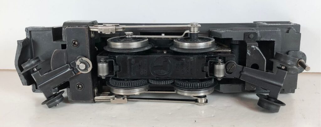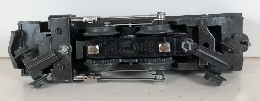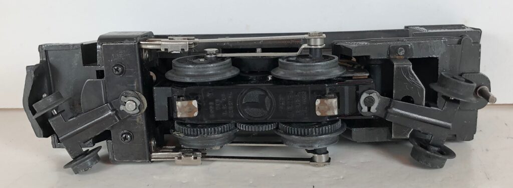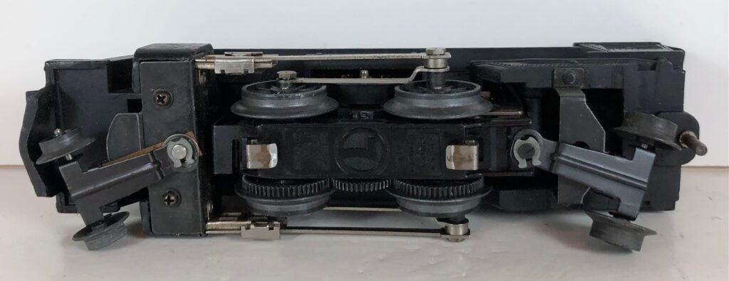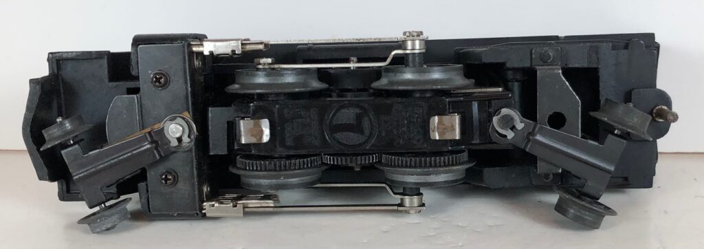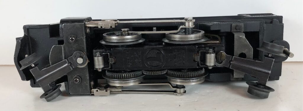 The No. 204 Locomotive has nickel trim, wire handrails and an “O” Gauge motor. The locomotive has an operating headlight and a remotely operated reverse with a lever on the top of the boiler that engages or disengages the reversing unit. The number “204” is rubber-stamped below the cab windows.