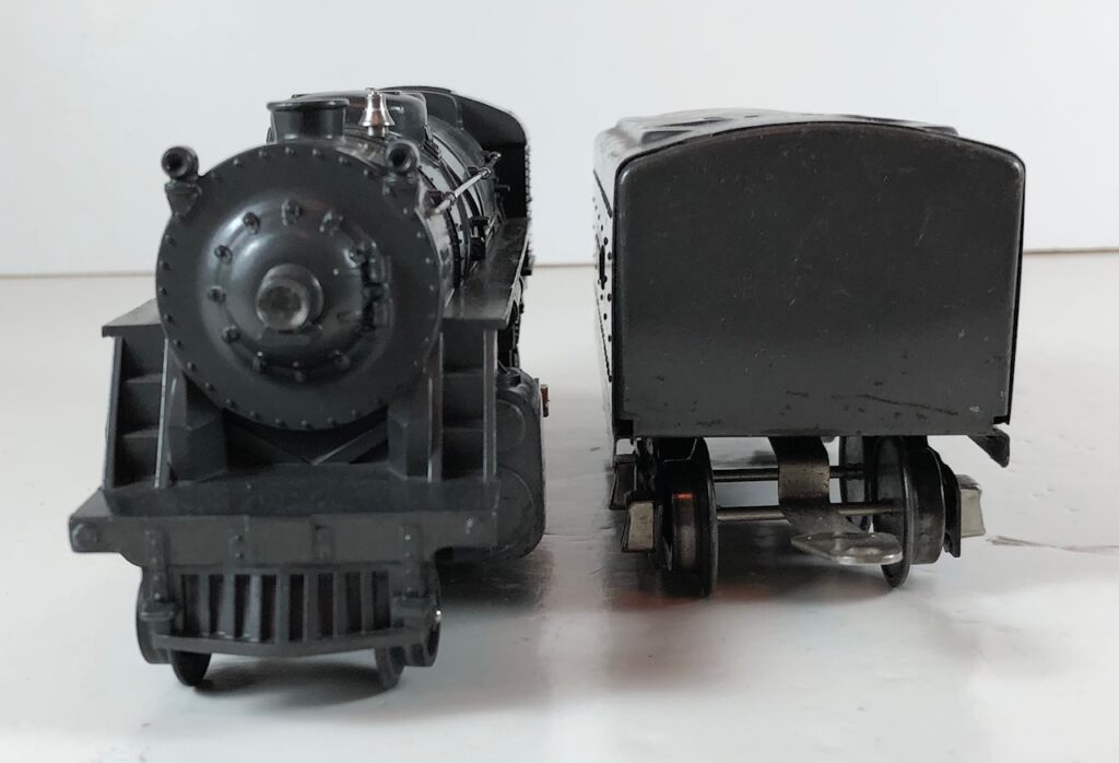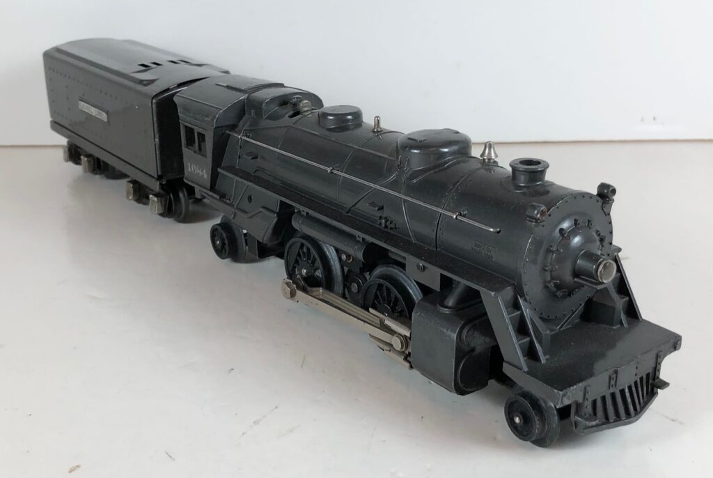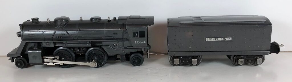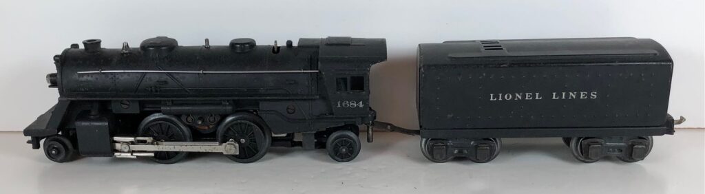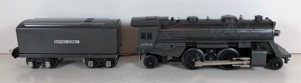 1. No. 1684 / 2689W 2-4-2 Steam Locomotive in gunmetal gray with nickel trim and rubber stamped number on the sides of the cab (1940-1941). The No. 2689W Tender is gunmetal gray with nickel plates on the sides of the tender. The tender has nickel journals and an early style operating box coupler.