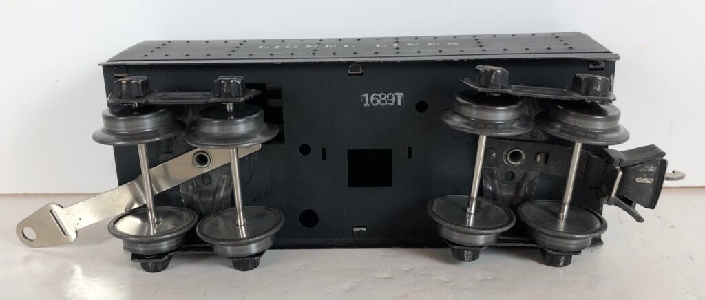 The No. 1684 Steam Locomotive was paired with a No. 1689T/W or No. 2689T/W Tender. The No. 1689T/W and the No. 2689T/W Tenders have a square sheet metal body with an early or late style manual or operating box coupler. The tenders have either aluminum “Lionel Lines” plates (gray tenders) or “Lionel Lines” rubber stamped on the sides (black Tenders) and no other trim. The No. 1684 / 2689T/W Steam engine and tender combined measure 16-inches in total length.