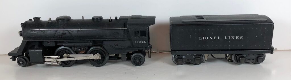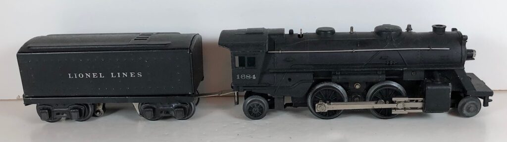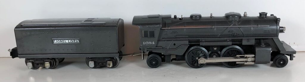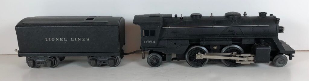 The Lionel No. 1684 2-4-2 Steam Locomotive was introduced in 1940 and was issued through 1942. The No. 1684 Locomotive was included in a number of uncataloged passenger and freight sets during this period. It was also included in a number of passenger and freight cataloged sets in 1942 only. The No. 1684 Steam Locomotive utilized a one piece diecast body and was very similar to the No. 204 Steam Locomotive.