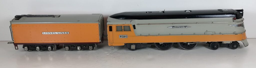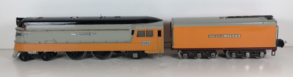 The Lionel No. 250E 4-4-2 “Hiawatha” Streamlined Steam Locomotive was introduced in 1935 and was issued through 1942. The No. 250E Steam Locomotive was a nearly scale model of the Milwaukee Road “Hiawatha” Streamlined Locomotive. The No. 250E Locomotive was the most colorful steam locomotive issued by Lionel in the prewar period with an orange, gray and black paint job. The No. 250E Steam Locomotive was available for separate sale, cataloged as No. 250E. The No. 250E Steam Locomotive was also included as a component of Set No. 755W with three “Hiawatha” streamlined passenger coaches in 1935-1941 and as a component of three freight sets in 1935-1942. The No. 250E Steam Locomotive was paired with the No. 250WX Tender when included in the passenger sets and either the No. 250T/W or No. 2250W Tender when included in the freight sets. The No. 250E Steam engine and tender combined measure 23-inches in total length.