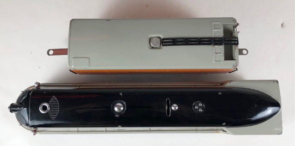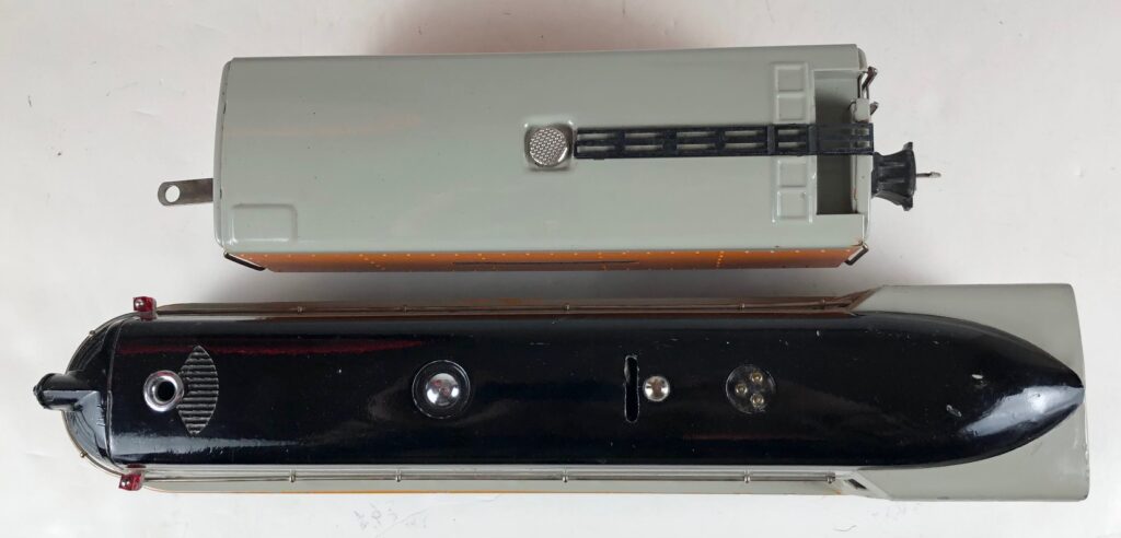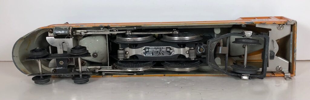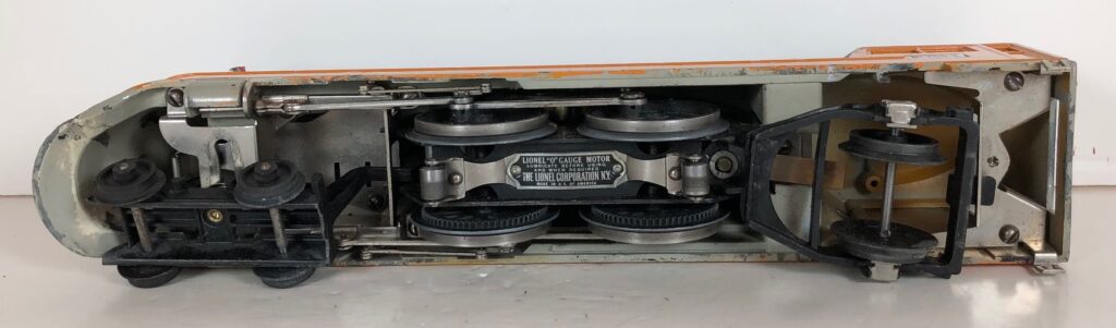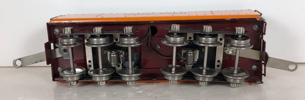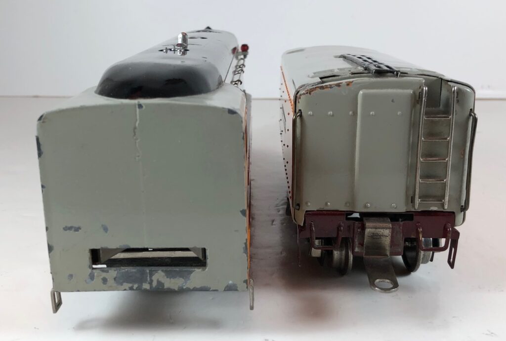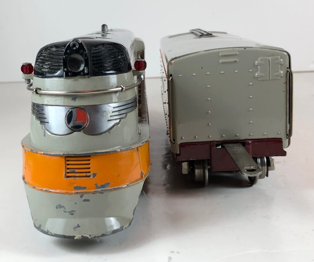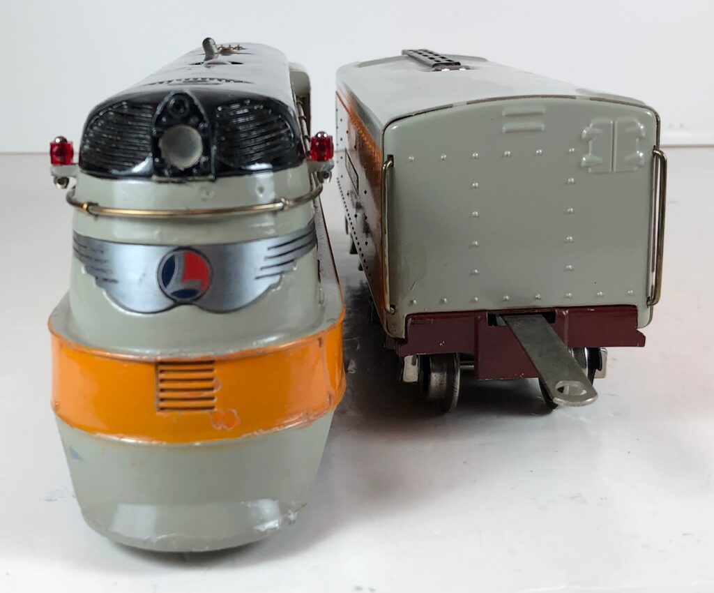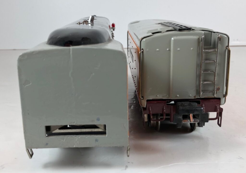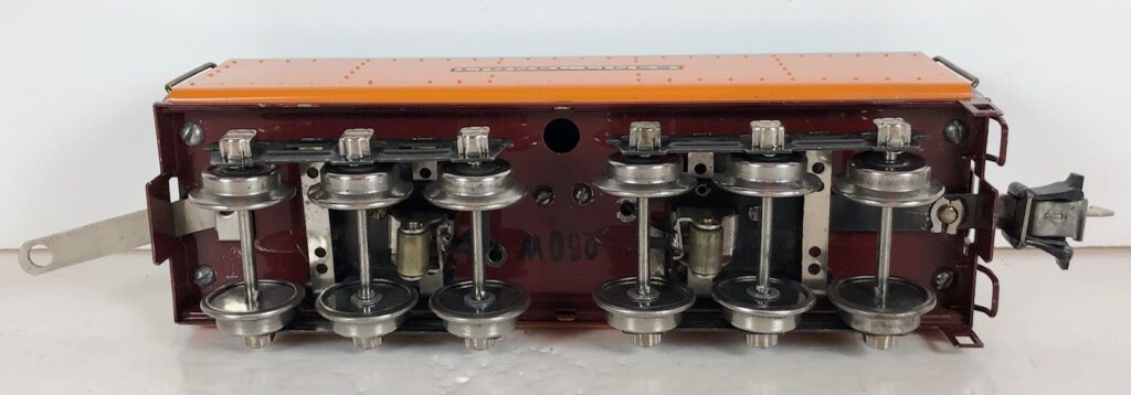 The “Hiawatha” Tender has a sheet metal body painted orange and gray with added catwalk, nickel oil tank cap, nickel ladder, hand rails on the corners and aluminum “Lionel Lines” plates on the sides. The tender frame is painted maroon and has rear steps. The tender has 6-wheel trucks and nickel journals. The No. 250T/W Tender has an early style manual box coupler. The No. 2250W Tender has an early or late style operating coupler. The No. 250WX Tender has a drawbar for connection to the streamlined passenger coaches.