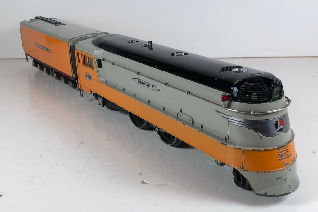 The No. 250E Locomotive has a diecast body with molded in details, marker lights, steel handrails, an aluminum winged “L” on the nose, aluminum plates with “Hiawatha” on the sides and nickel journals on the trailing truck. The locomotive has an operating headlight and a remotely operated reverse with a lever on the top of the boiler that engages or disengages the reversing unit. The number is on an aluminum plate below the cab windows. This locomotive was made for use on Lionel “072” tubular track.