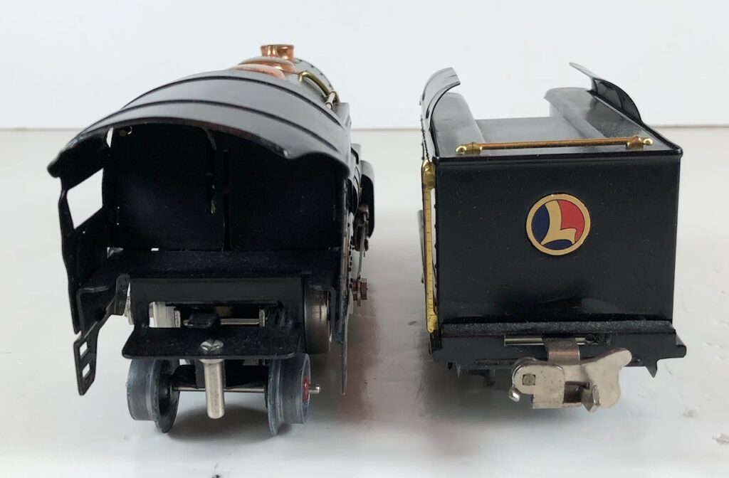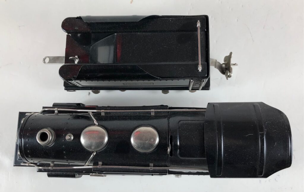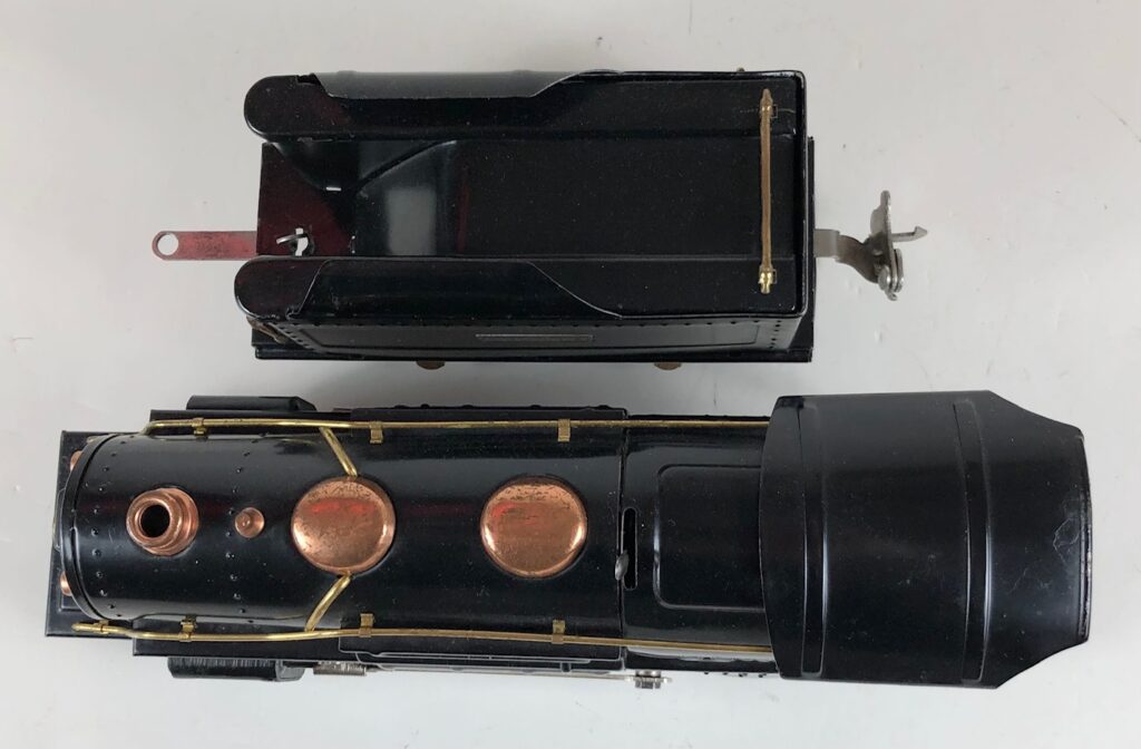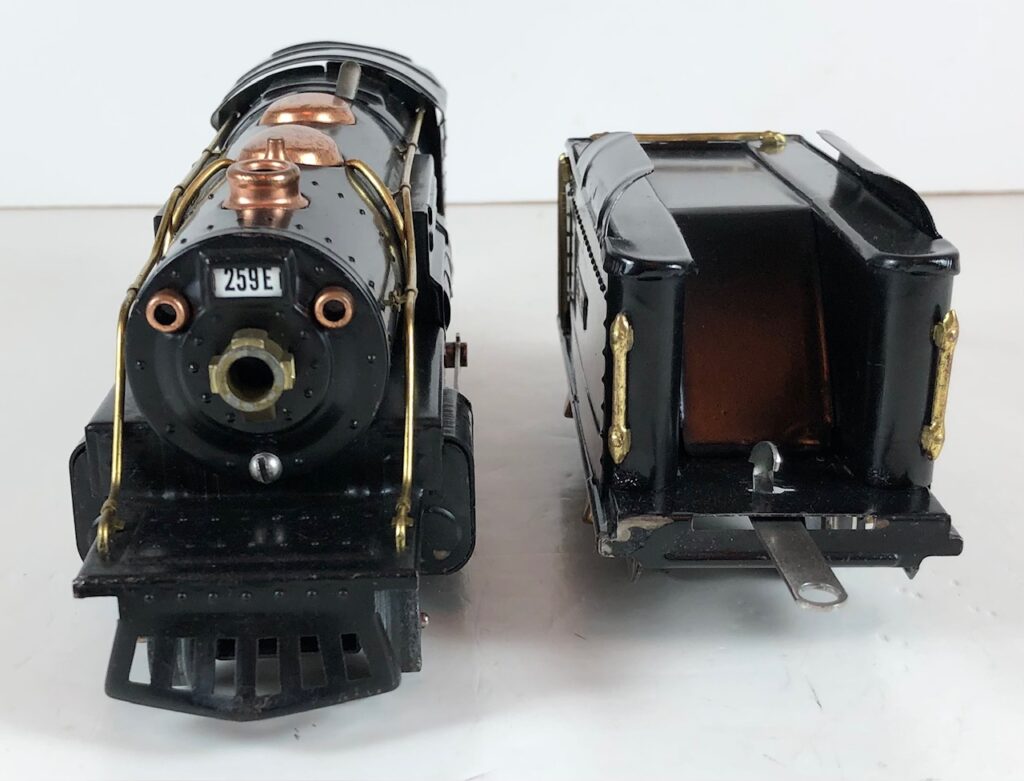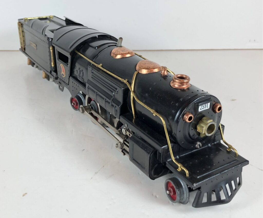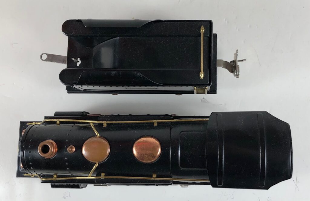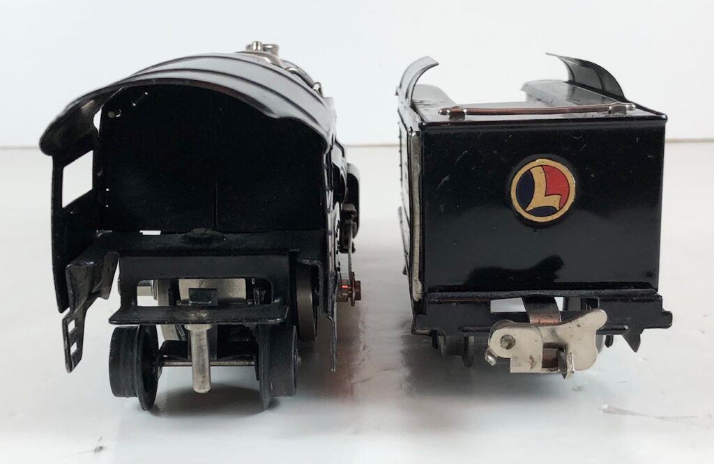 5. No. 259E / 1689T 2-4-2 Steam Locomotive in black with nickel trim, brass circle “L”, black wheels with black rims (1934-1935). The No. 1689T Tender is black with copper journals.