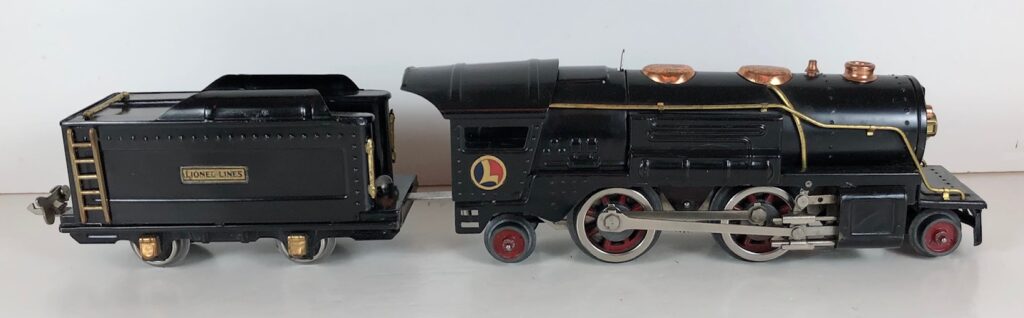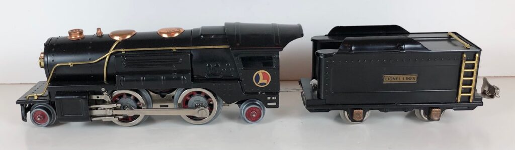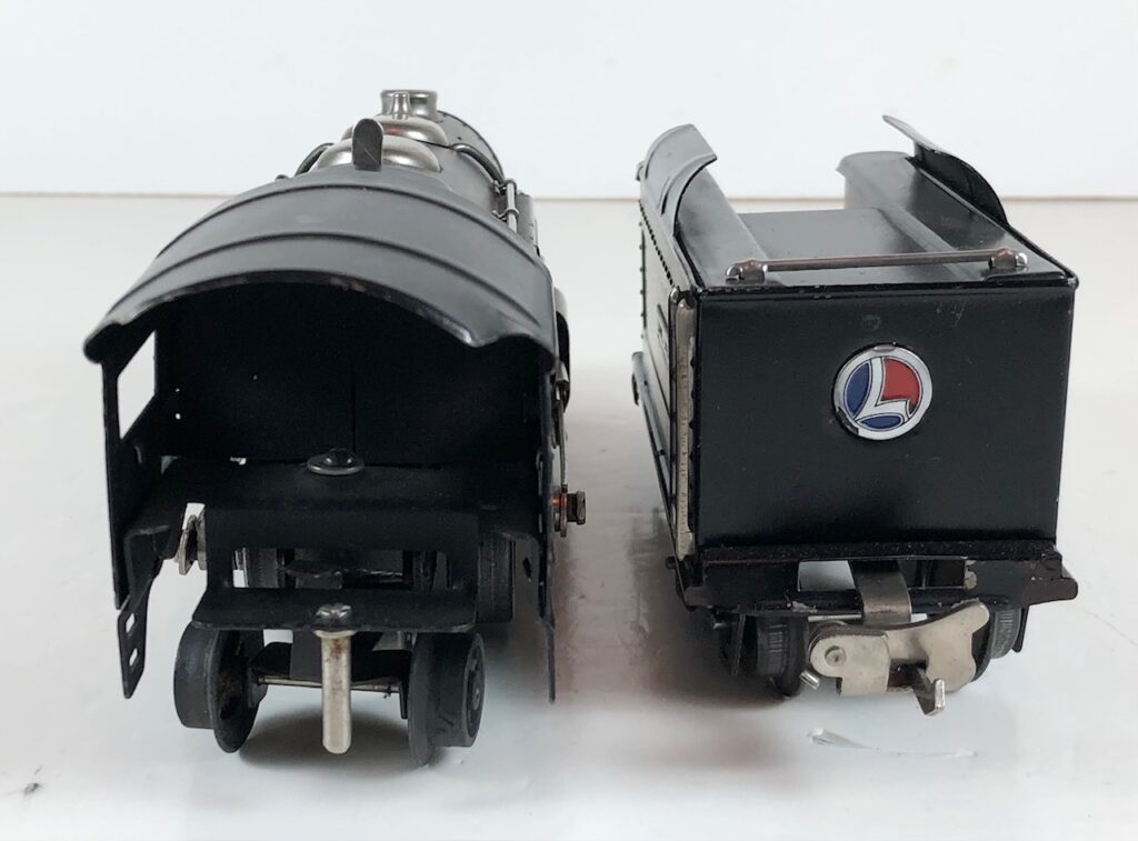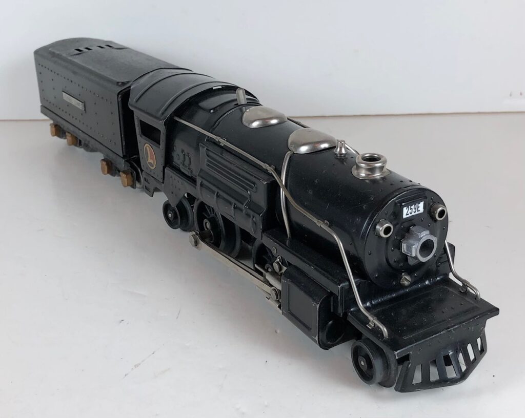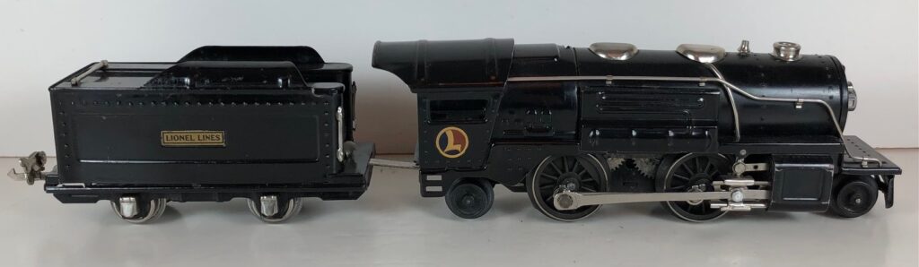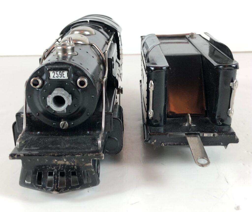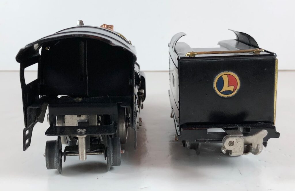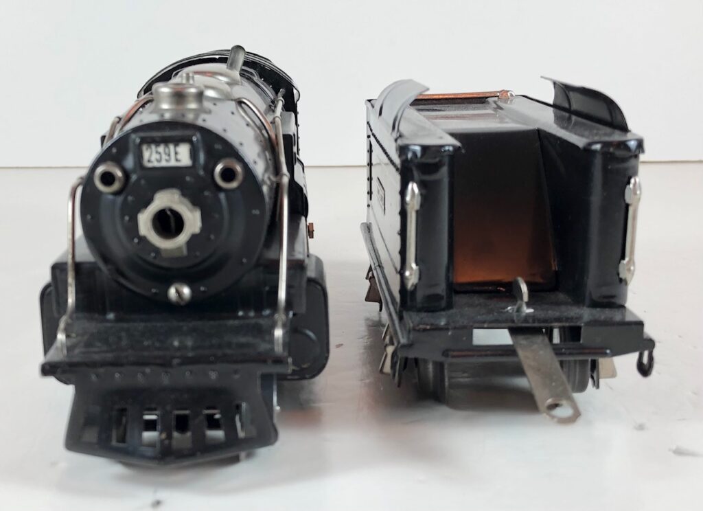 5. No. 259E / 1689T 2-4-2 Steam Locomotive in black with nickel trim, brass circle “L”, black wheels with black rims (1934-1935). The No. 1689T Tender is black with copper journals.