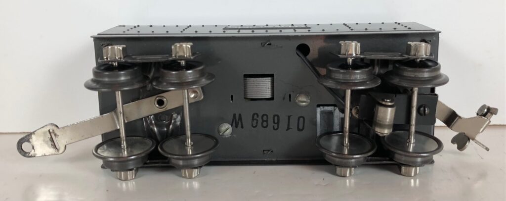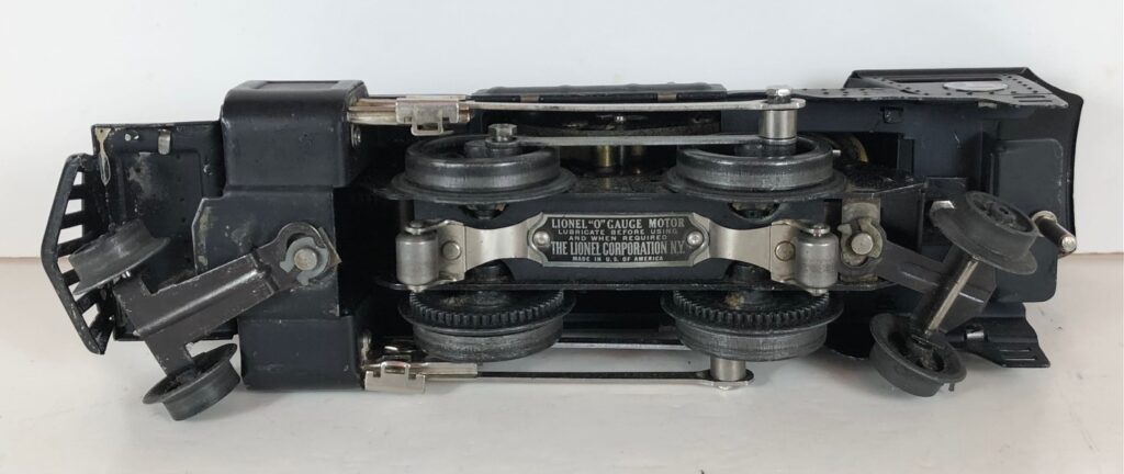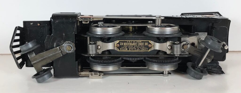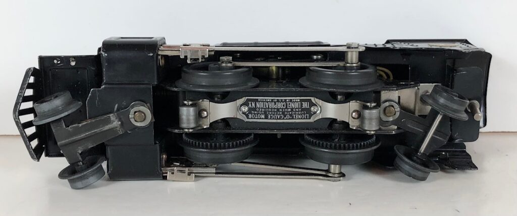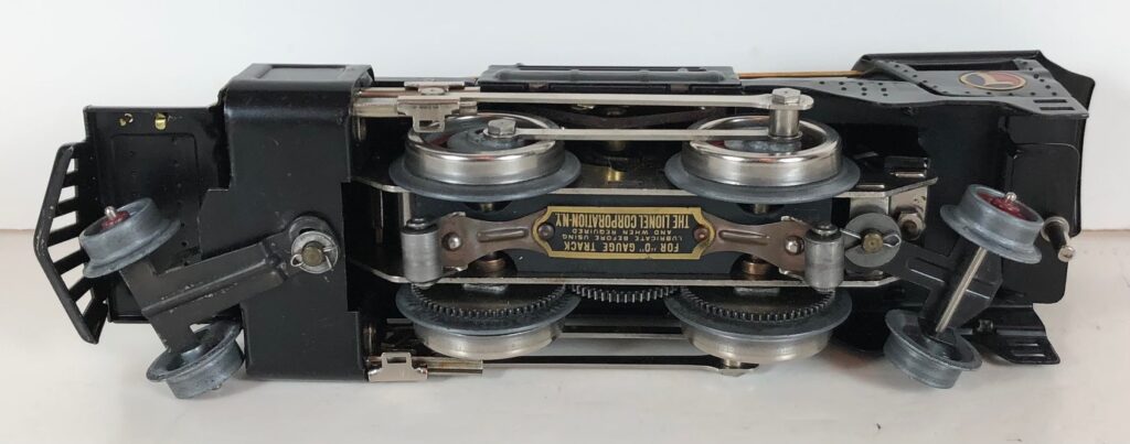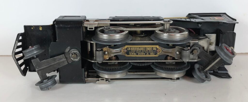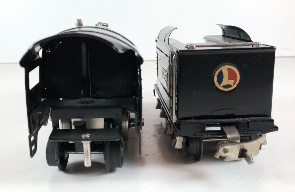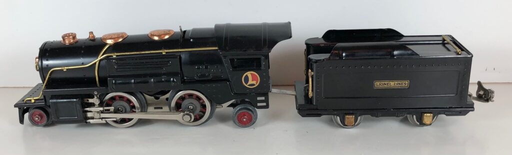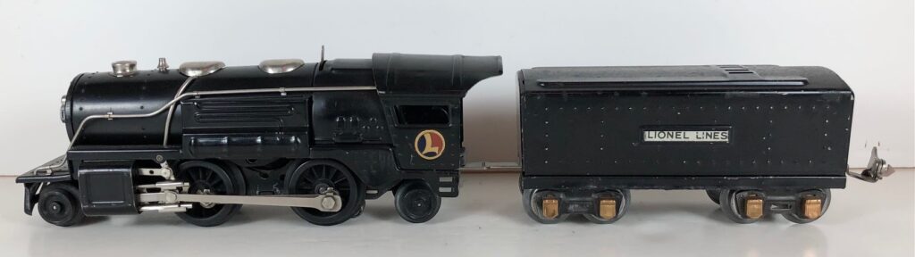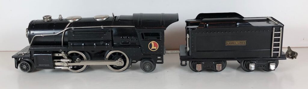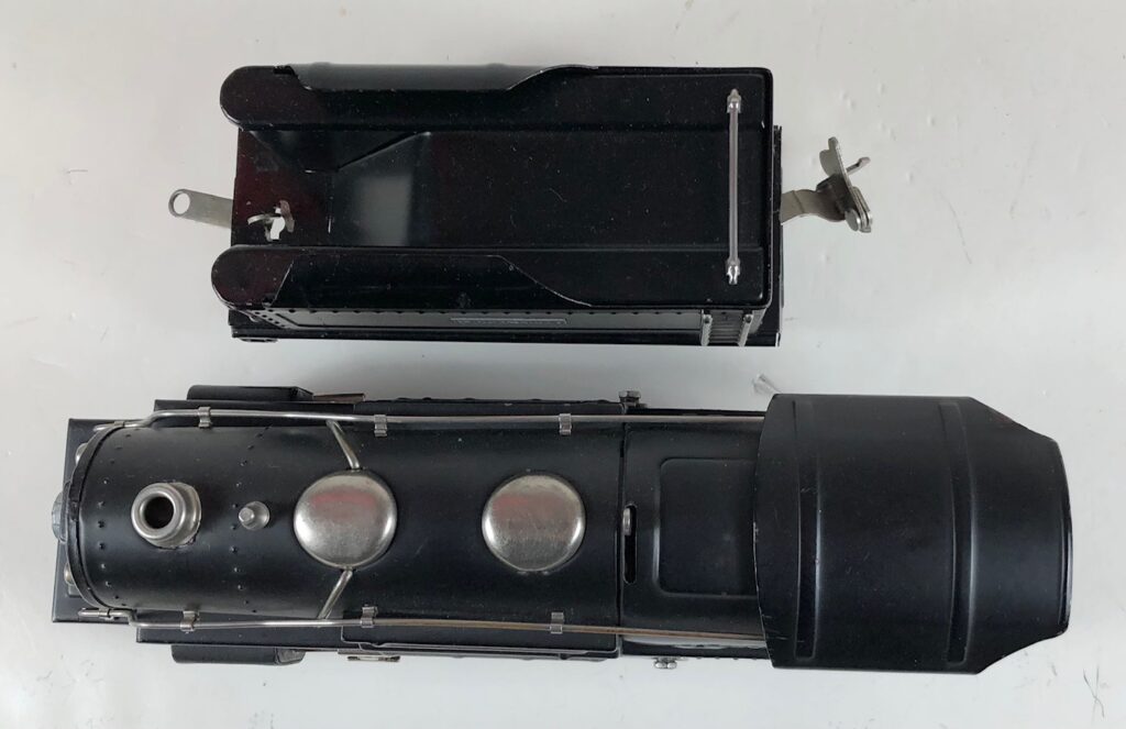 5. No. 259E / 1689T 2-4-2 Steam Locomotive in black with nickel trim, brass circle “L”, black wheels with black rims (1934-1935). The No. 1689T Tender is black with copper journals.
