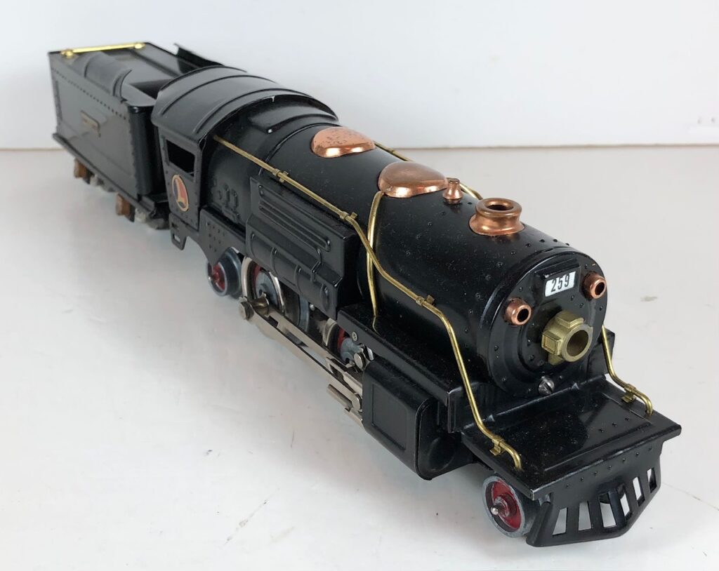 2. No. 259E / 259T 2-4-2 Steam Locomotive in black with copper and brass trim, brass circle “L”, red wheels with nickel rims (1933-1934). The No. 259T Tender is black with brass trim, brass plates and copper journals.