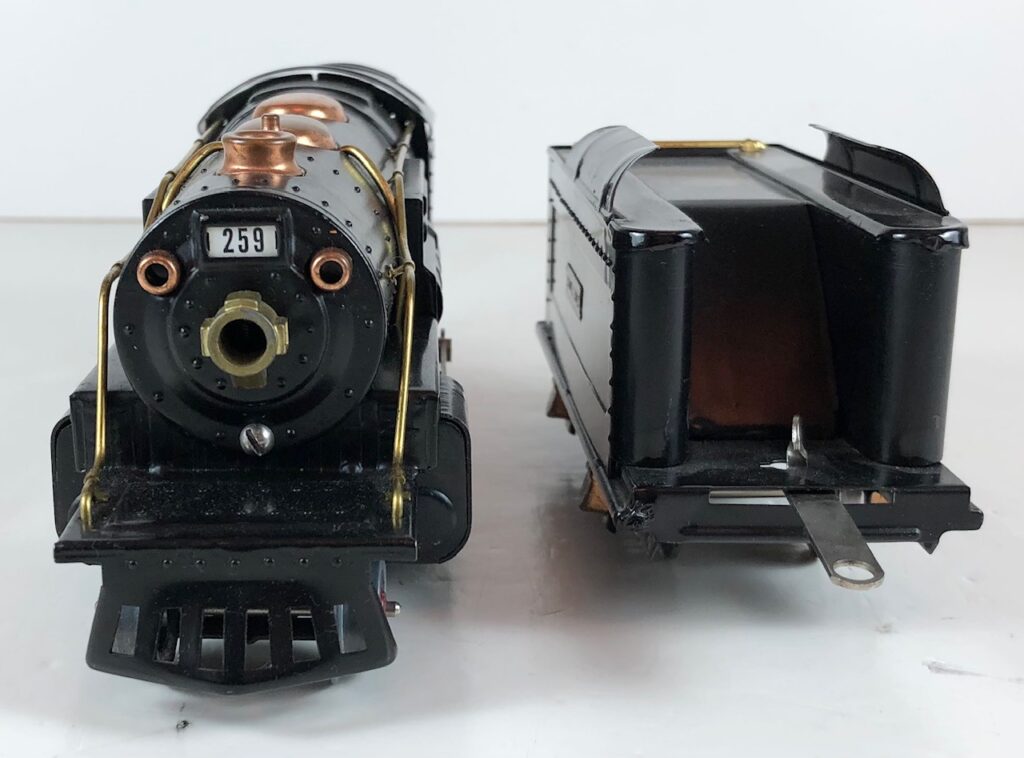 1. No. 259 / 259T 2-4-2 Steam Locomotive in black with copper and brass trim, brass circle “L”, red wheels with nickel rims (1932). The No. 259T Tender is black with brass trim, brass plates and copper journals.