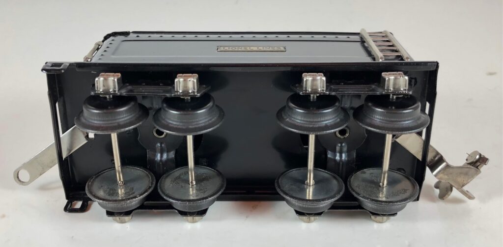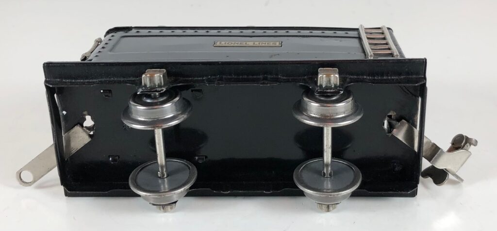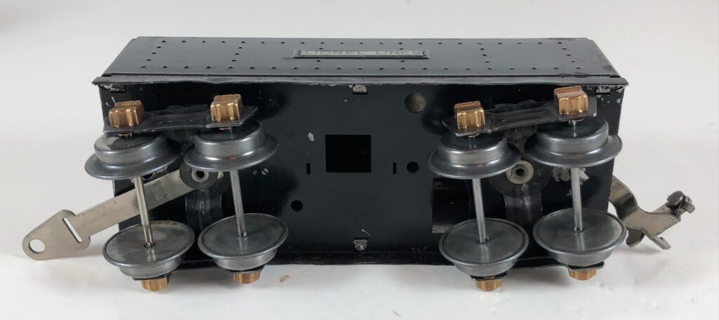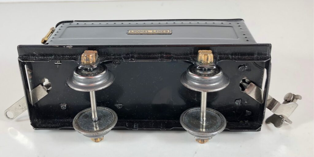 The No. 259 Steam Locomotive was typically paired with a No. 259T 4-Wheel Tender in cataloged sets. However, the locomotive also came with a No. 1588T Tender or a No. 261T Tender in certain uncataloged sets. The No. 259T Tender has a sheet metal body in black. The tender has brass trim, a circle “L” plate in brass, and a brass plate on the sides which reads “Lionel Lines”. The tender has a latch coupler and copper journals. The No. 259 / 259T Steam engine and tender combined measure 14 3/4-inches in total length.