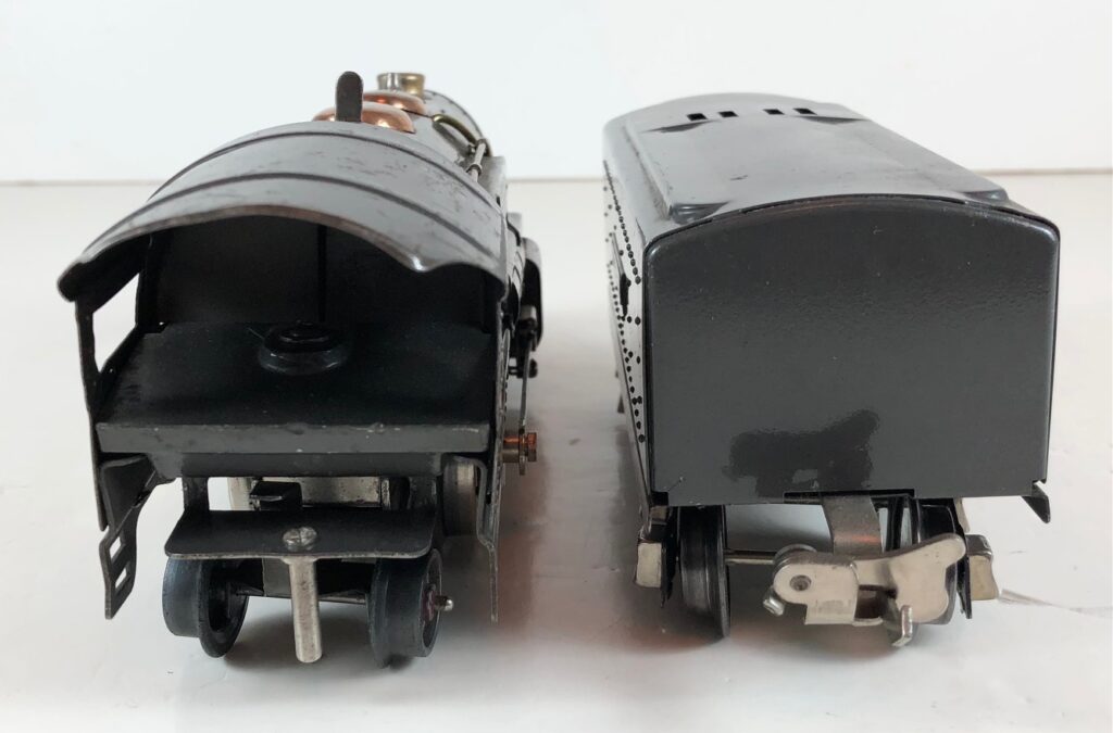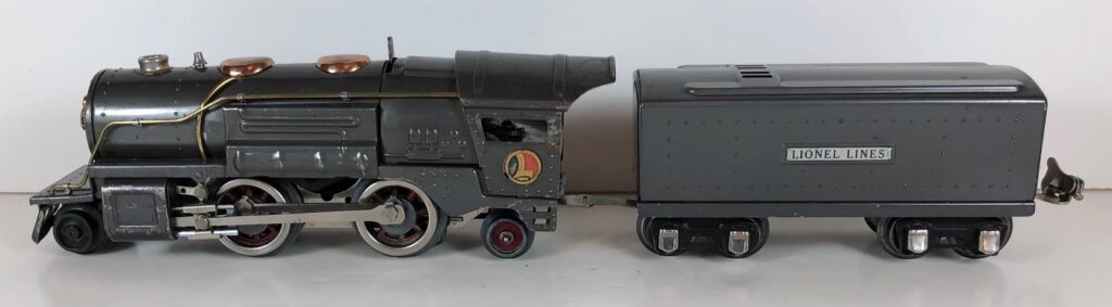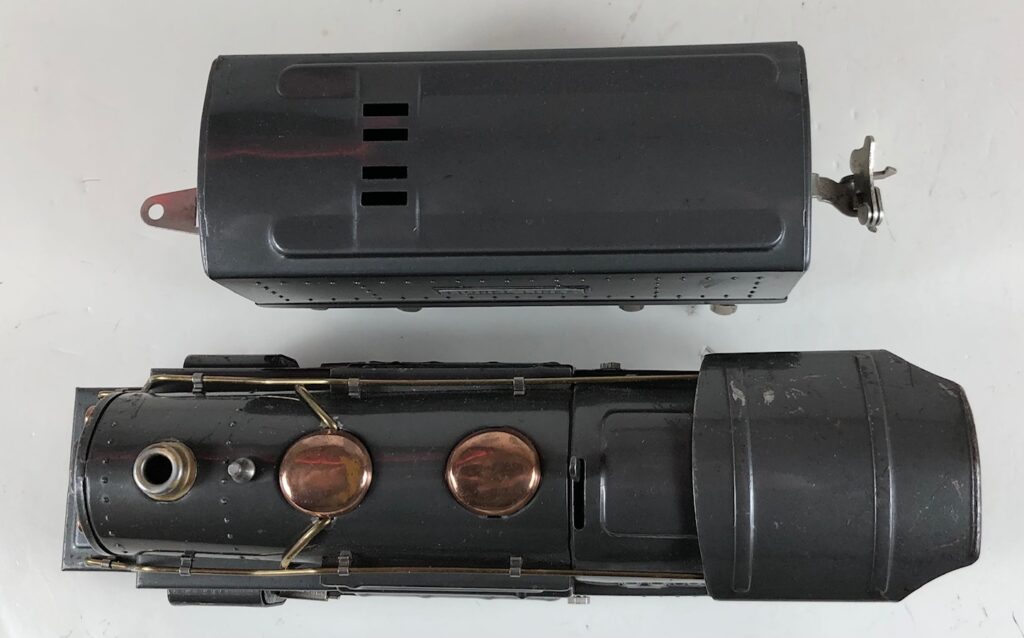 3. No. 259E / 1689T 2-4-2 Steam Locomotive in gunmetal gray with copper and brass trim, brass circle “L”, red wheels with nickel rims (1934). The No. 1689T Tender is gray with aluminum plates, and nickel journals.