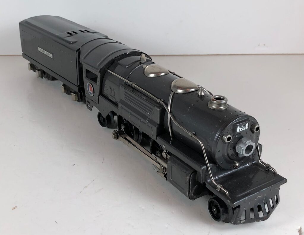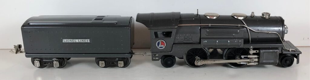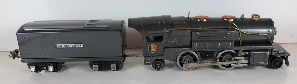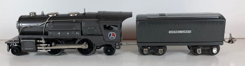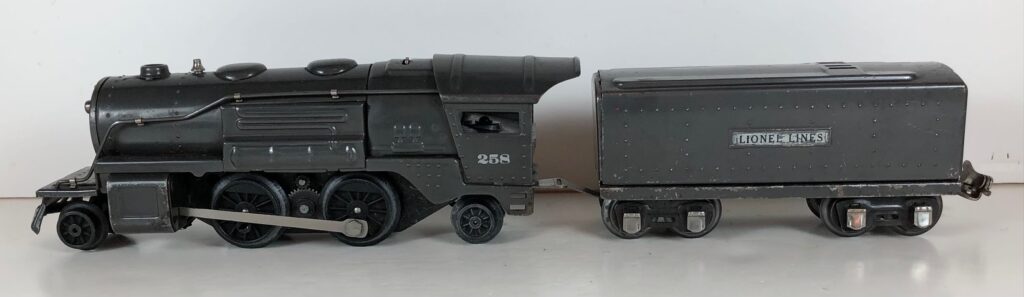 1. No. 258 / 1689W 2-4-2 Steam Locomotive in gunmetal gray with nickel and gray trim (1940). The No. 1689W Tender is gray with aluminum “Lionel Lines” plates, a latch coupler and nickel journals. The tender has a whistle.
