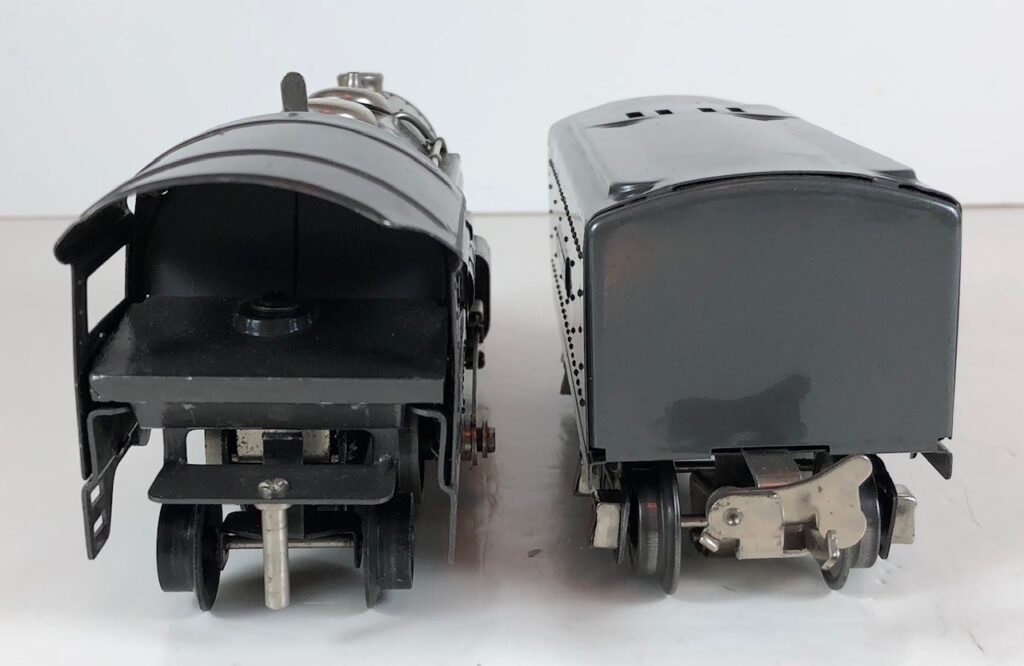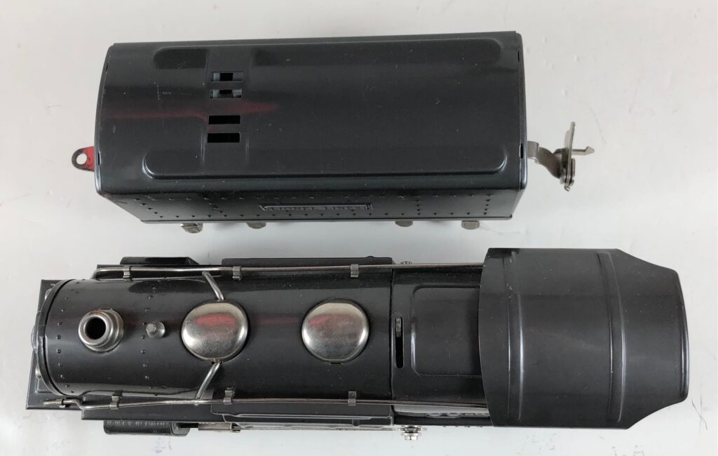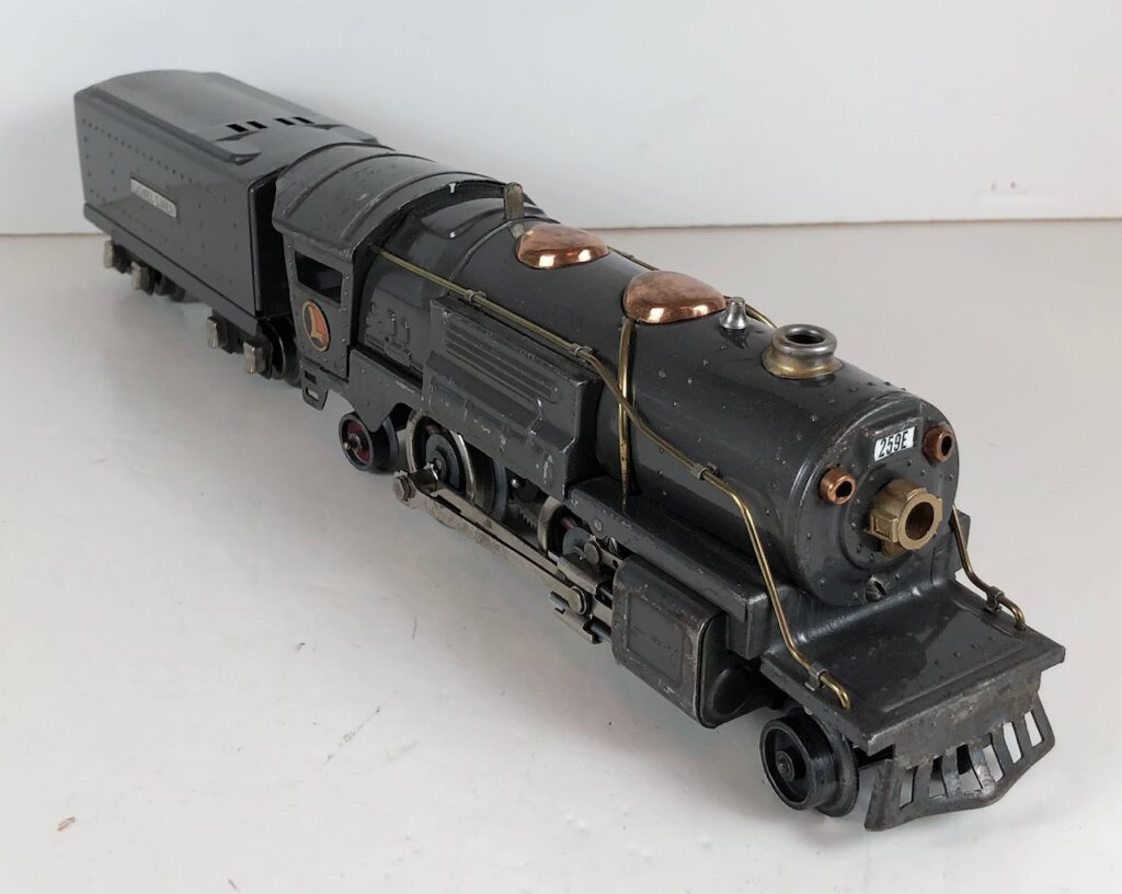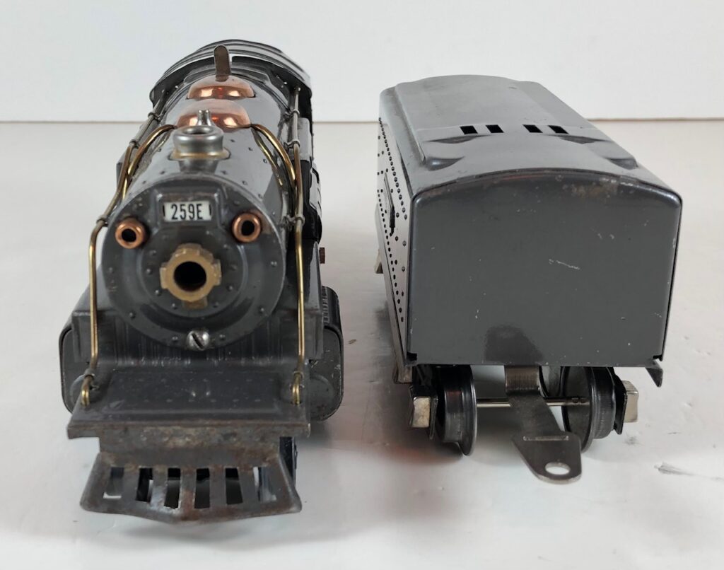 8. No. 259E / 1689W 2-4-2 Steam Locomotive in gunmetal gray with nickel trim, aluminum circle “L”, black wheels with steel rims (1936-1938). The No. 1689W Tender is gray with aluminum plates and nickel journals. The tender has a whistle.