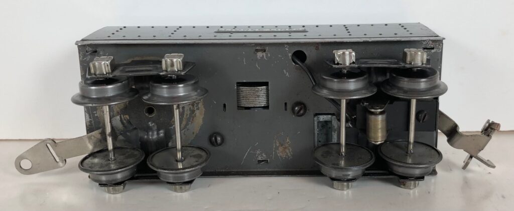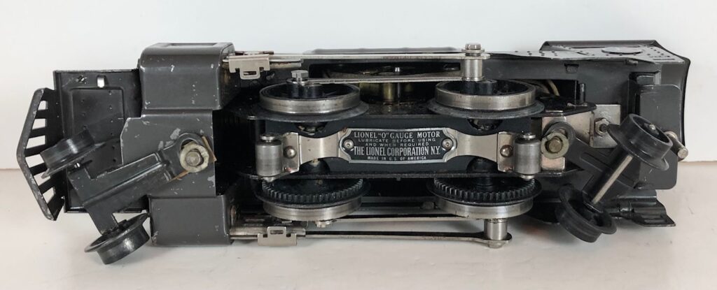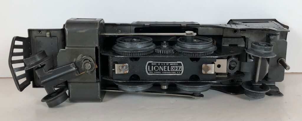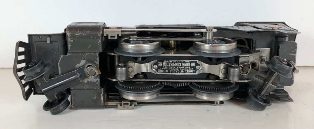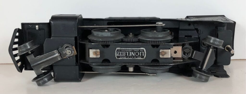 The Lionel No. 258 2-4-2 Steam Locomotive was offered from 1940 through 1942. The No. 258 Locomotive was a cheapened version of the No. 259E Locomotive. The locomotive was uncataloged and was included with many promotional passenger and freight sets during this period. The No. 258 Steam Locomotive was constructed completely of sheet metal. The “O” Gauge motor of the No. 259 Steam Locomotive was replaced by an “027” motor with sliding shoe pick-ups. The drive wheels are black with no rims. In addition, the side rods of the No. 259 Locomotive were replaced by a simplified single side rod on each side of the locomotive. The locomotive has an operating headlight, but the headlight casting of the No. 259 Locomotive was eliminated. The number “258“ is rubber stamped on the sides of the cab. The number also appears on the boiler front just above the headlight. Although not identified with an “E”, the No. 258 Locomotive has a remotely operated reverse with a lever on the top of the boiler that engaged or disengaged the reversing unit.