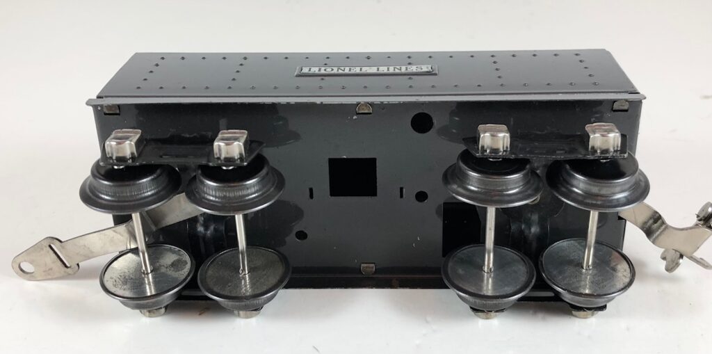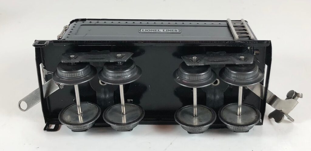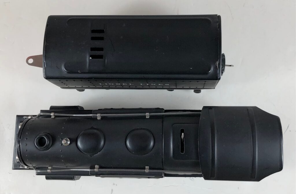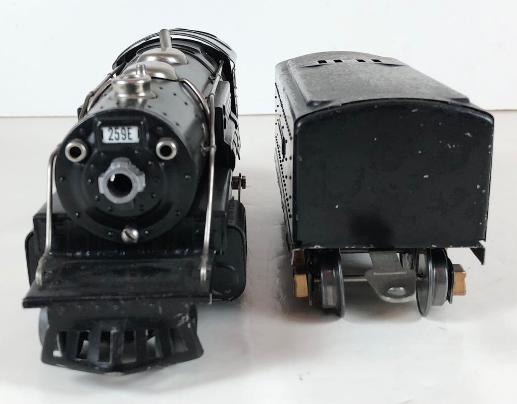 The No. 259E Steam Locomotive was typically paired with a No. 259T 4-Wheel Tender or a No. 262T 8-Wheel Tender in cataloged sets. However, the locomotive also came with a No. 261T, a No. 1588T, a No. 1688W, a No. 1689T/W, or a No. 2689T/W Tender in various uncatalogued sets. The No. 259T Tender is described above. The No. 262T Tender has a diecast body and has brass trim and a brass plate on the sides which reads “Lionel Lines”. The tender has a latch coupler. The No. 259E / 262T Steam engine and tender combined measure 15 1/4-inches in total length.
