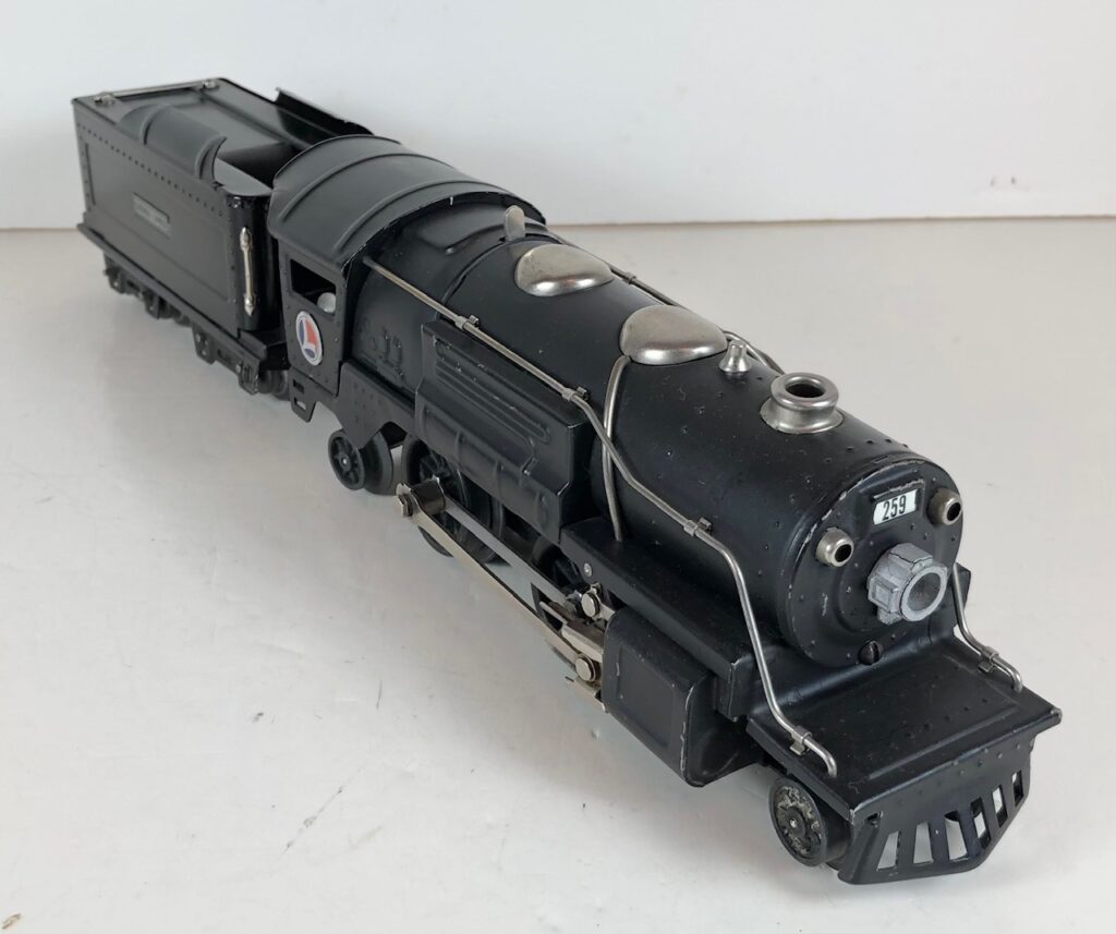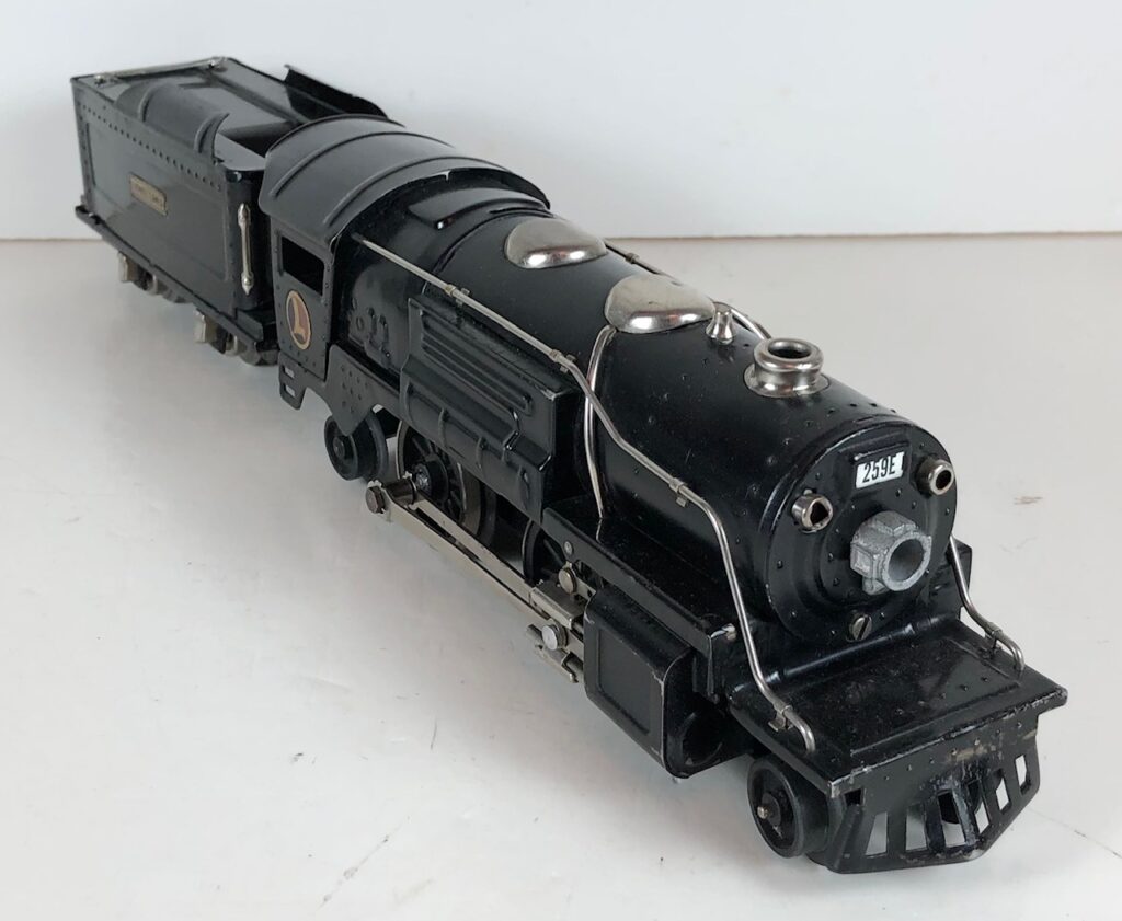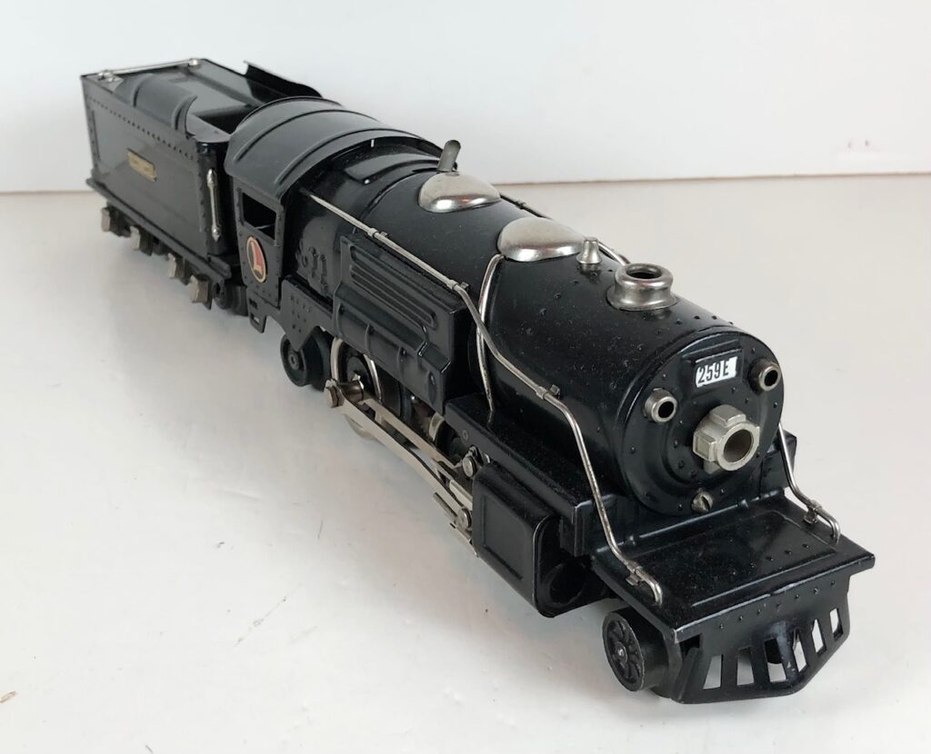 The Lionel No. 259 2-4-2 Steam Locomotive was introduced in 1932 and was cataloged through 1938. The locomotive was included with many cataloged passenger and freight sets during this period. The locomotive was also included in a large number of uncataloged or promotional sets between 1934 and 1942. The No. 259 Steam Locomotive was constructed completely of sheet metal and it has an operating headlight with a cast headlight housing. The locomotive has circle “L” plate on the sides of the cab and the number appears on the boiler front just above the headlight. The No. 259 Steam Locomotive has a manual reverse unit which was controlled by a lever located inside the cab. The No. 259E locomotive has a remotely operated reverse and it has a lever on the top of the boiler that engaged or disengaged the reversing unit.