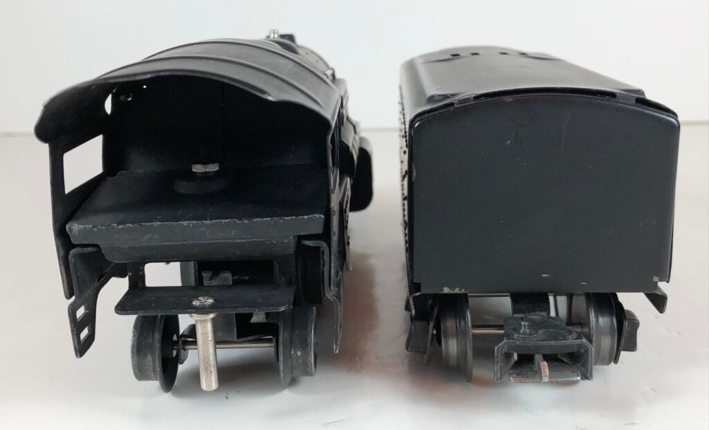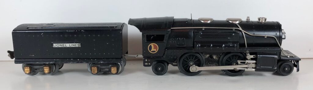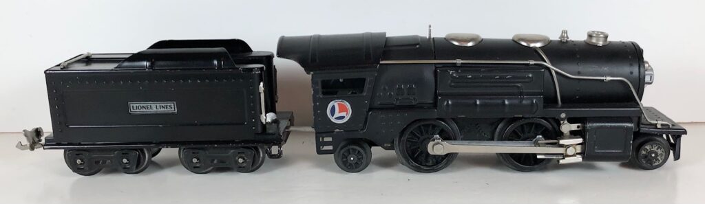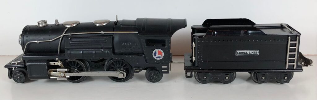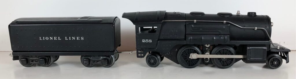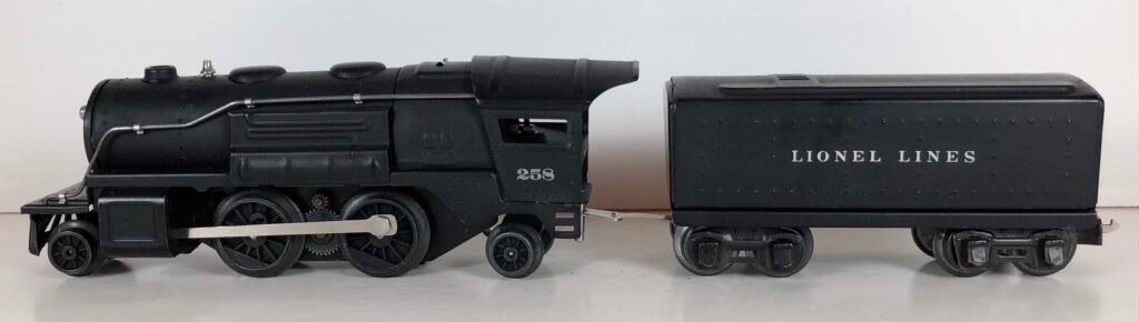 2. No. 258 / 1689T 2-4-2 Steam Locomotive in satin black with nickel and black trim (1941-1942). The No. 1689T Tender is black with rubber stamped “Lionel Lines” on the sides, a late style manual box coupler and black journals.