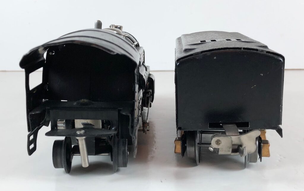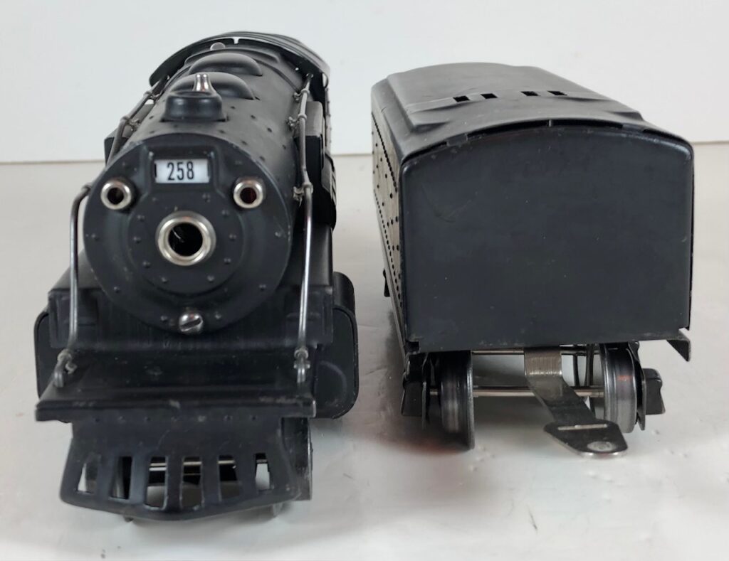 The No. 258 Steam Locomotive was typically paired with either a No. 1689T or a No. 1689W Tender with a latch or late style manual box coupler. The locomotive is also known to come with a No. 2689T or a No. 2689W Tender with a late style operating box coupler. The No. 258 / 1689T Steam engine and tender combined measure 16-inches in total length.