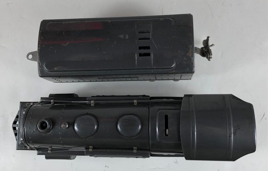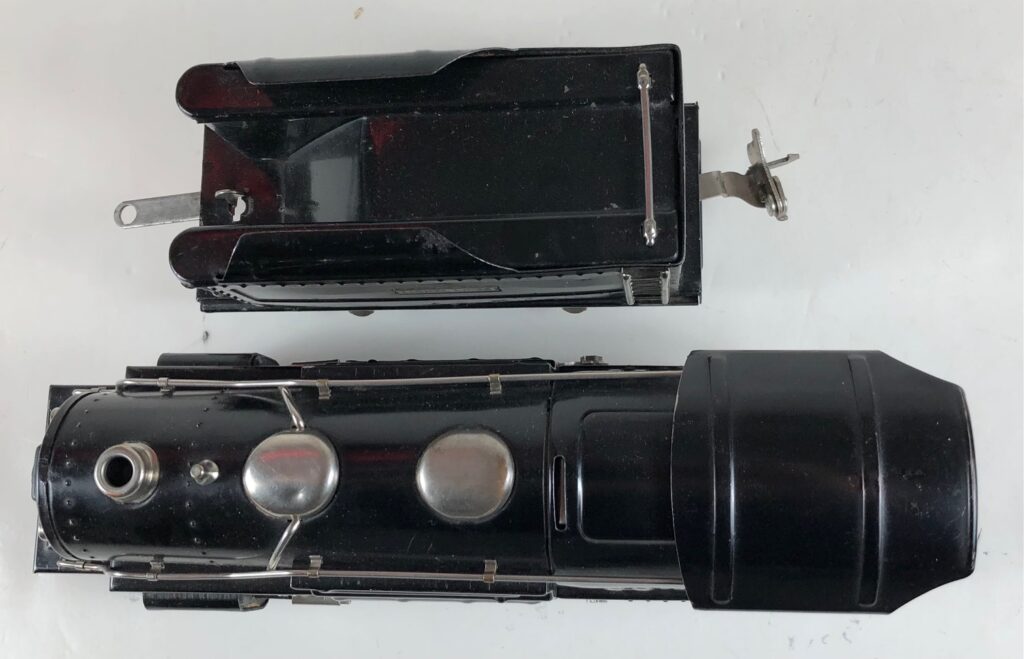 7. No. 259 / 261T 2-4-2 Steam Locomotive in satin black with nickel trim, aluminum circle “L”, black wheels with black rims (1936-1940). The No. 261T Tender is black with nickel trim, aluminum plates and no journals.